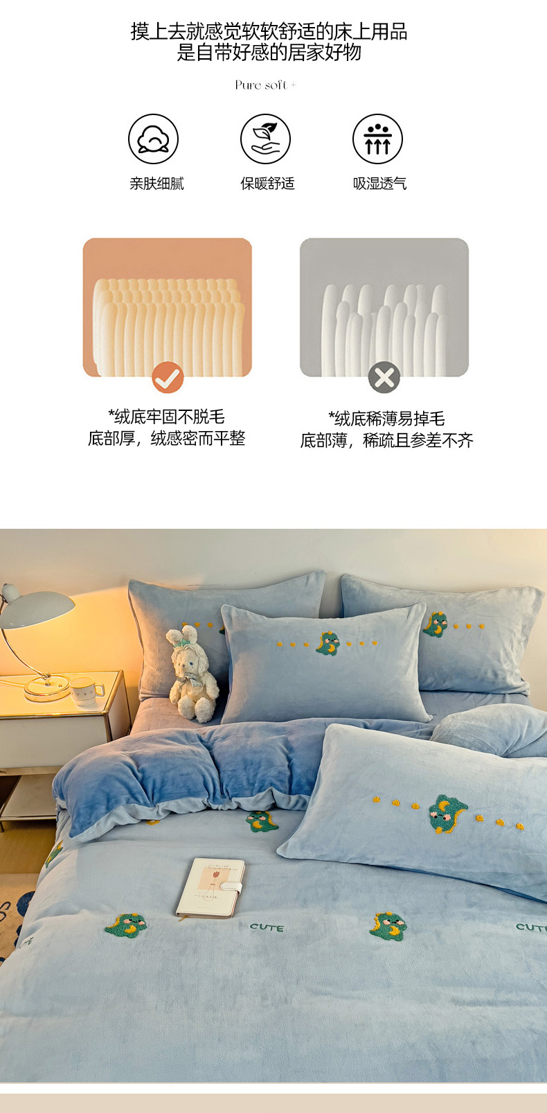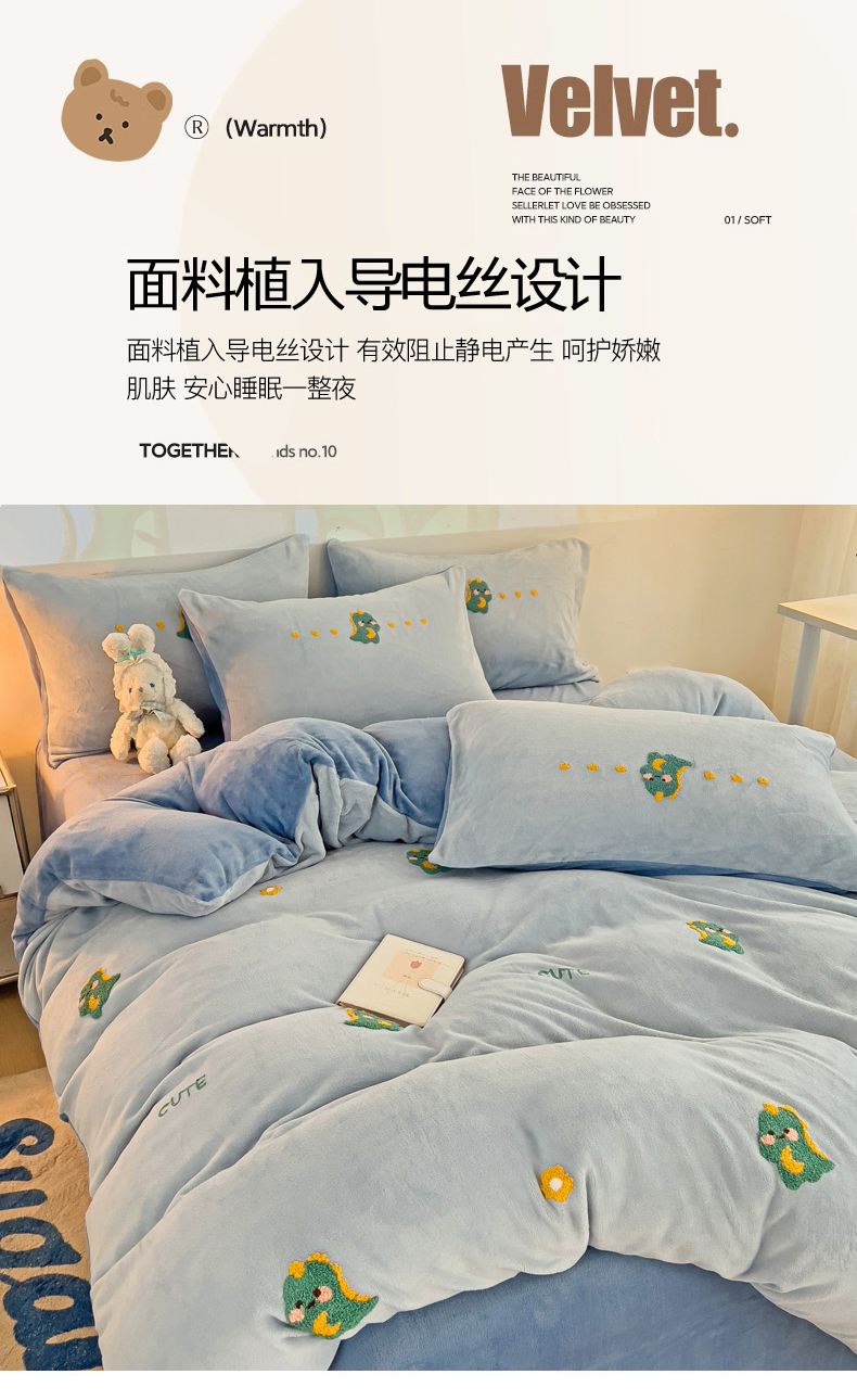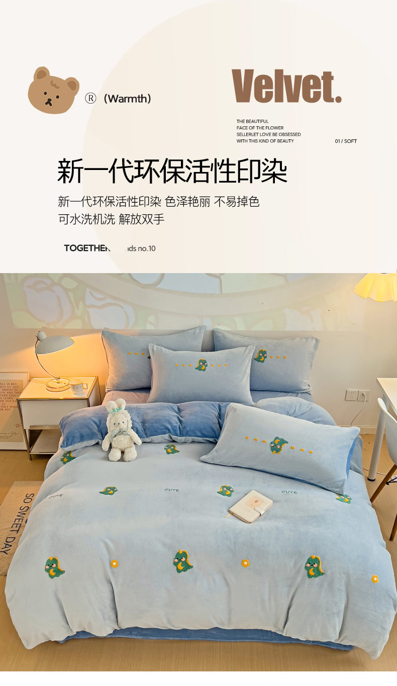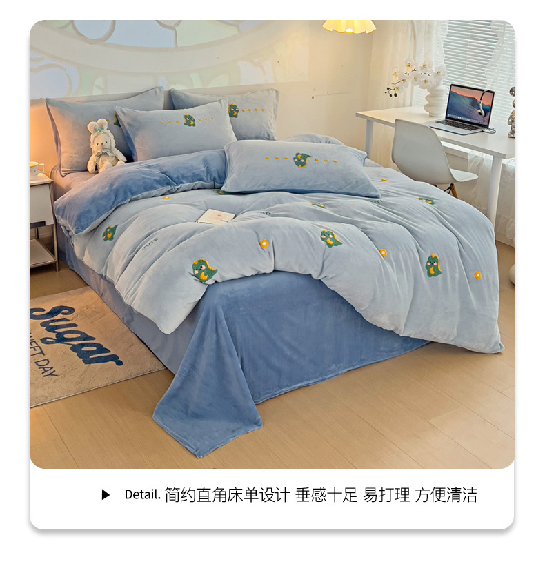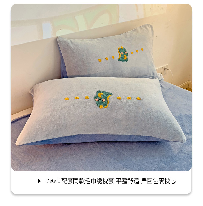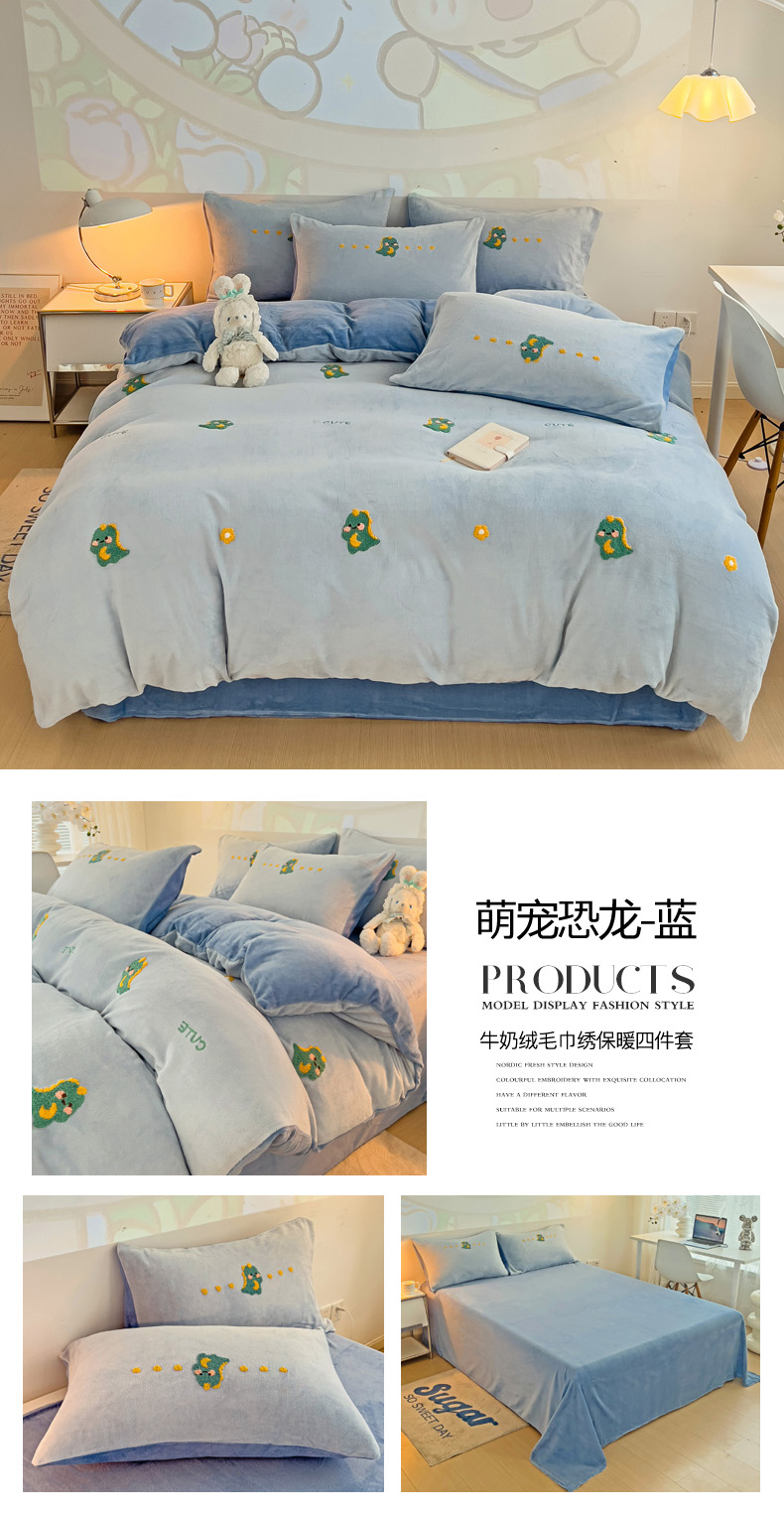 商品名称:寐居家纺 2023毛巾绣牛奶绒四件套 萌宠恐龙-蓝