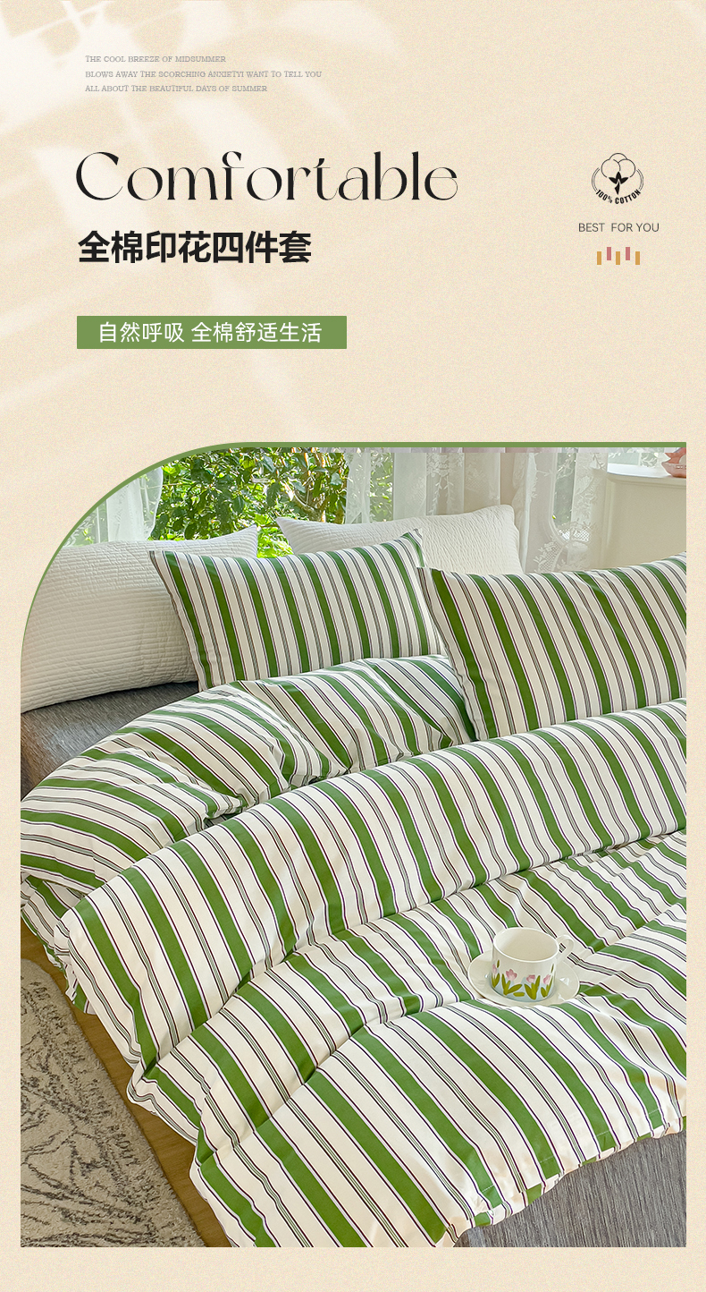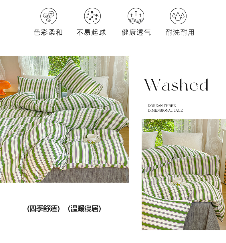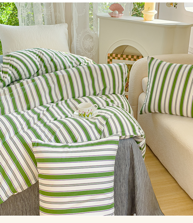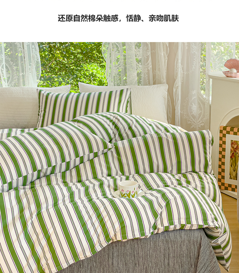 感遇家纺 2023新款全棉印花四件套 绿条纹