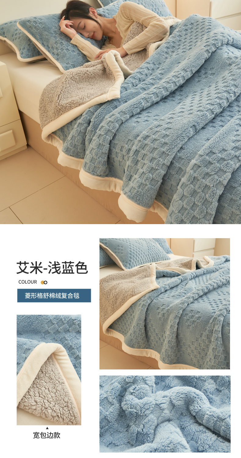 当前位置: 91家纺网 > 商品网购 > 毛毯休闲毯绒毯 > 毛毯 > 21度C 2023新款菱形格舒棉绒毛毯复合毯 艾米-浅蓝色
