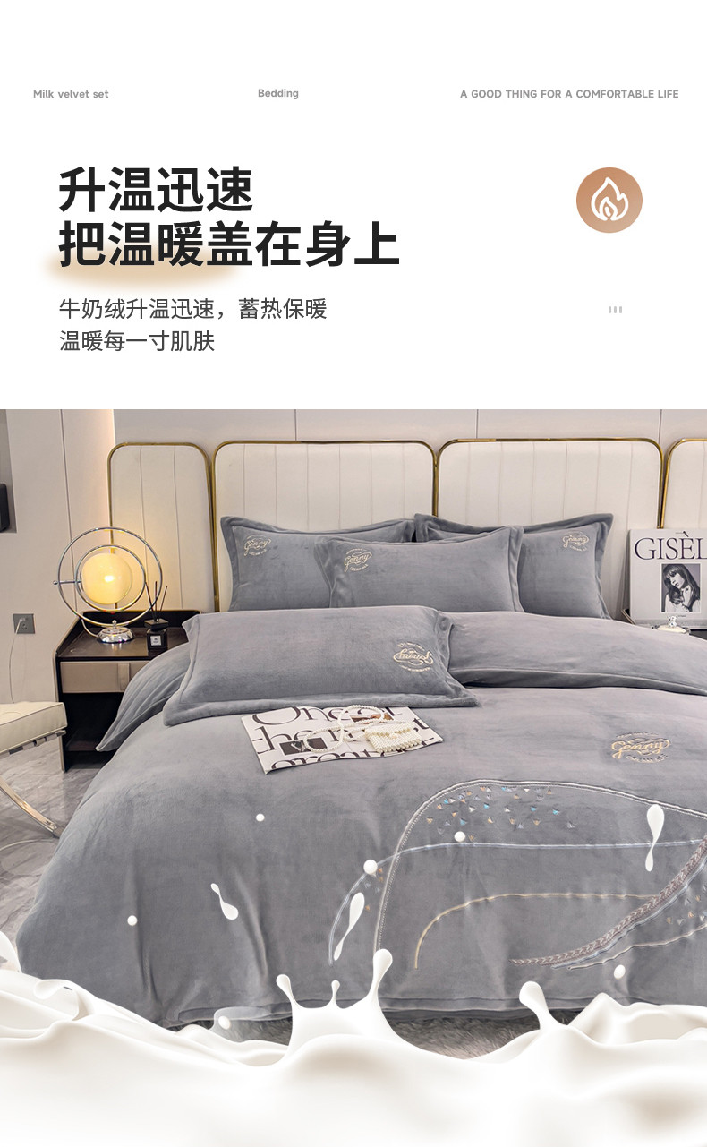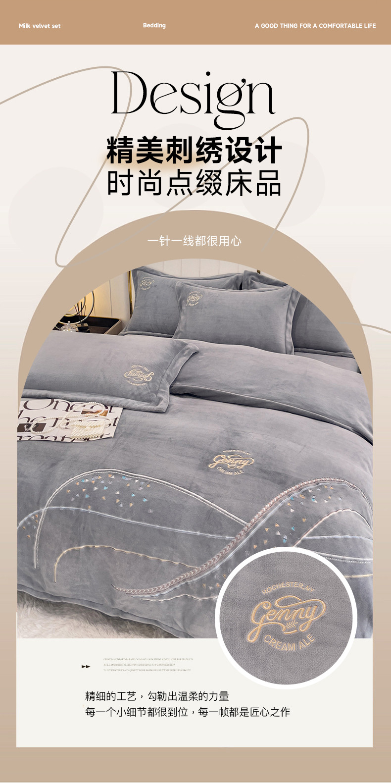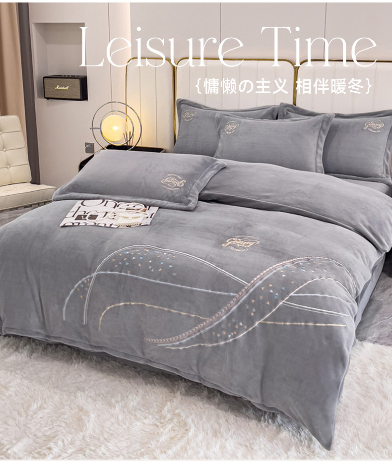 慕克斯 2023新款全消光高克重刺绣牛奶绒四件套-奥丽莎 奥丽莎-绅士灰