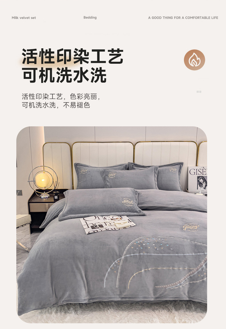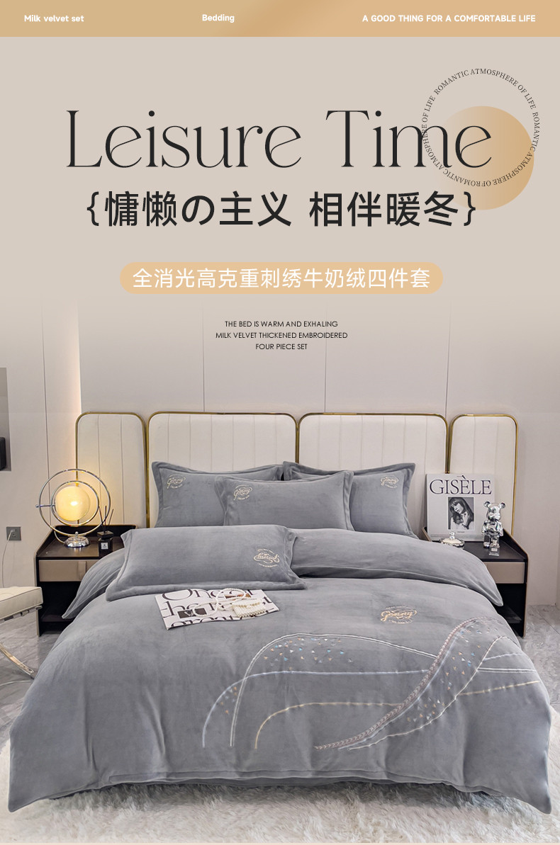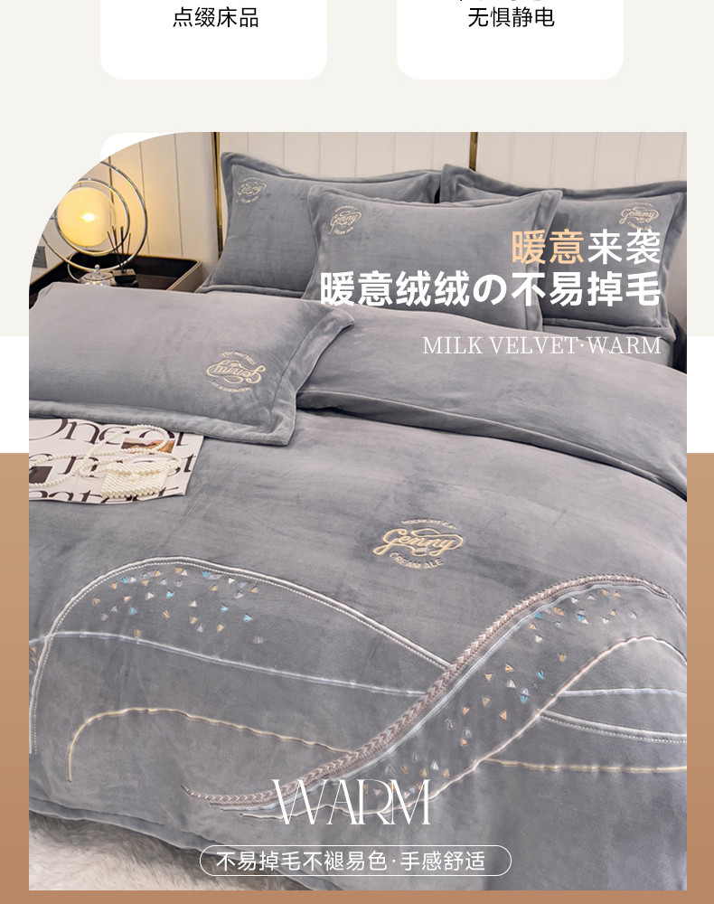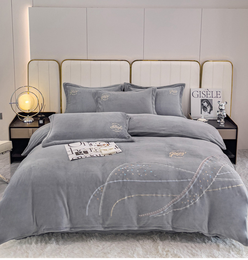 慕克斯 2023新款全消光高克重刺绣牛奶绒四件套-奥丽莎 奥丽莎-绅士灰