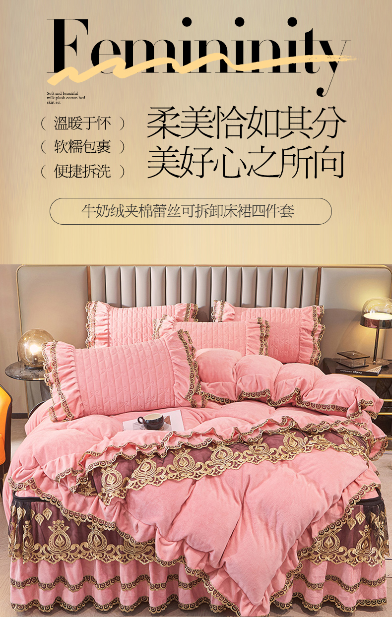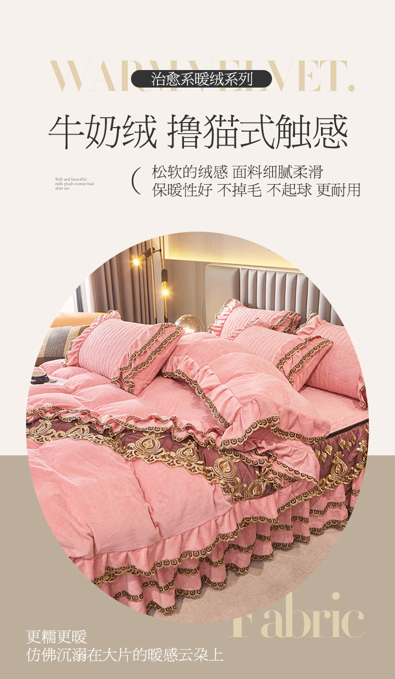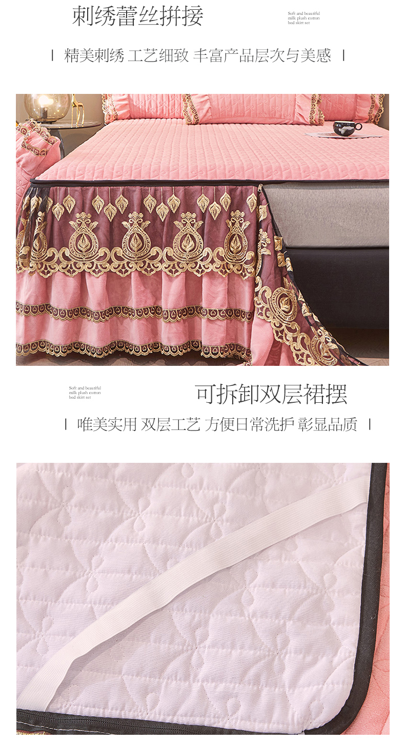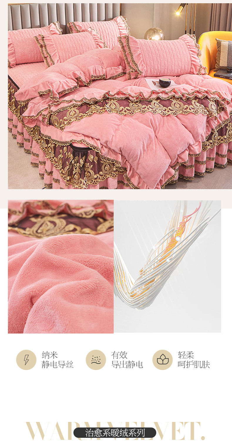 • 91家纺网 家纺一手货源 找家纺 虹星家纺 2023新款牛奶绒夹棉蕾丝可拆卸床裙系列四件套 梦幻巴黎 蜜玉