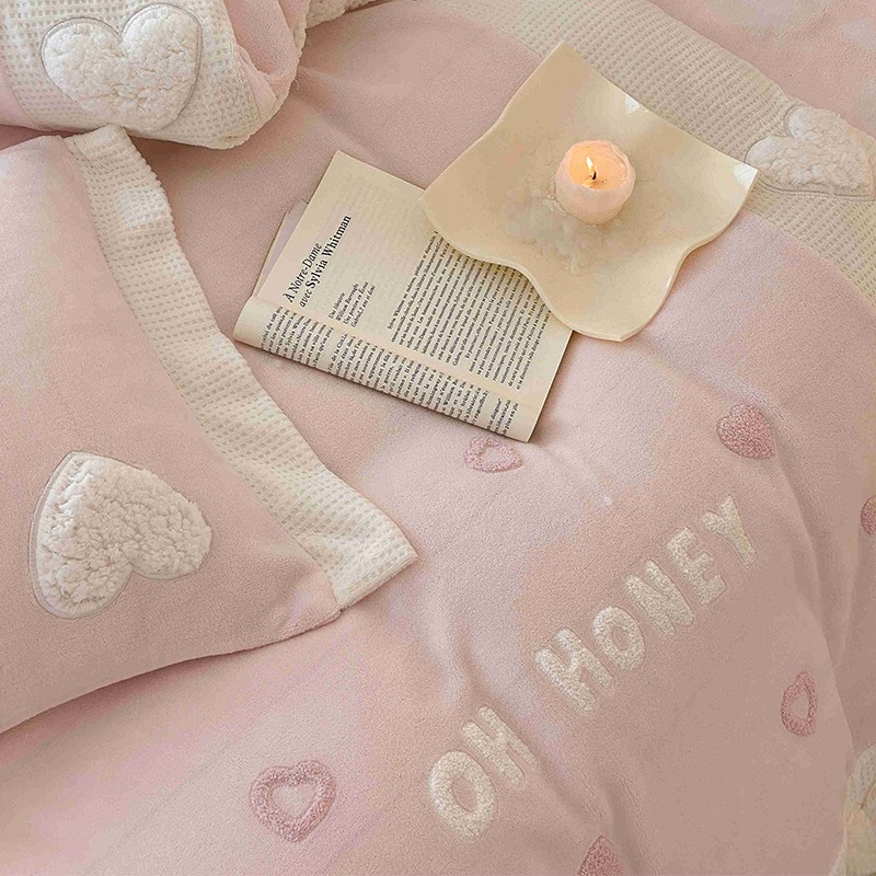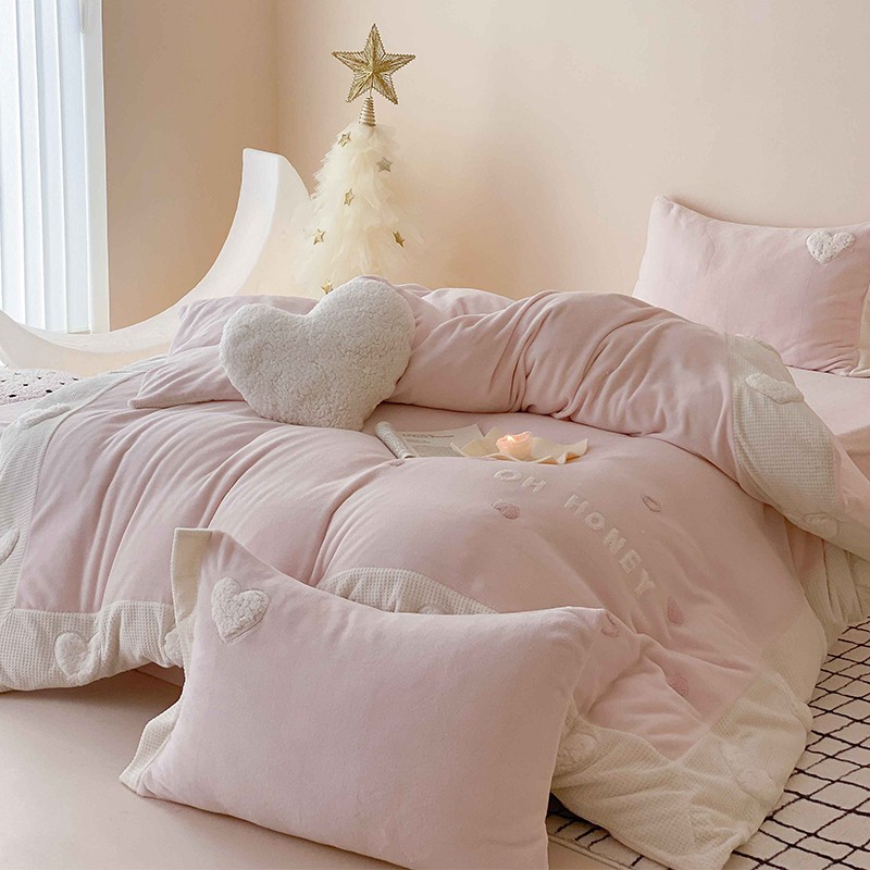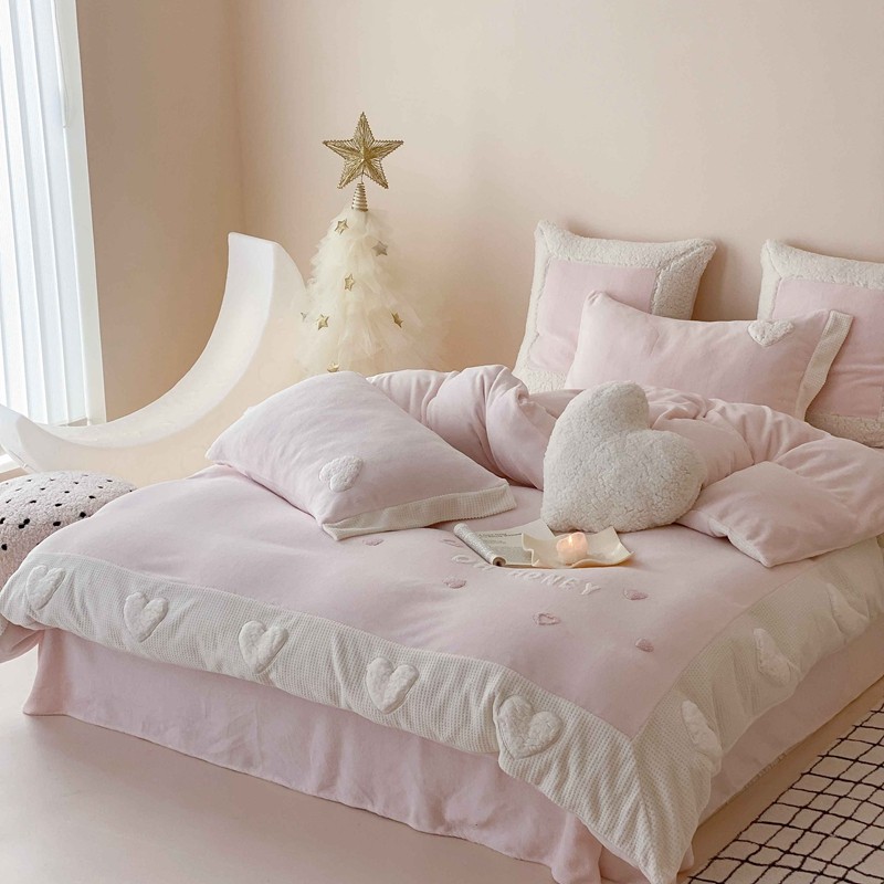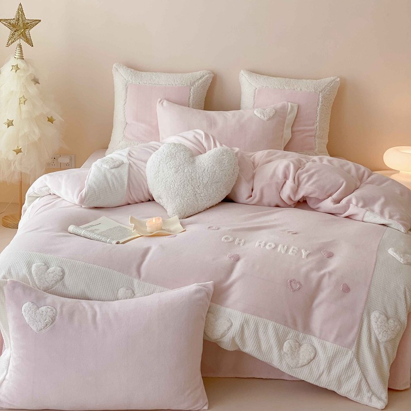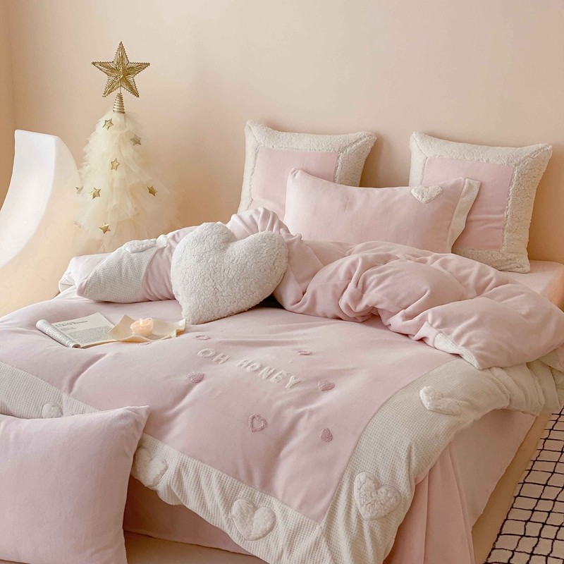 (总)星野 2023新款高克重牛奶绒羊羔绒贴布绣四件套-小甜心