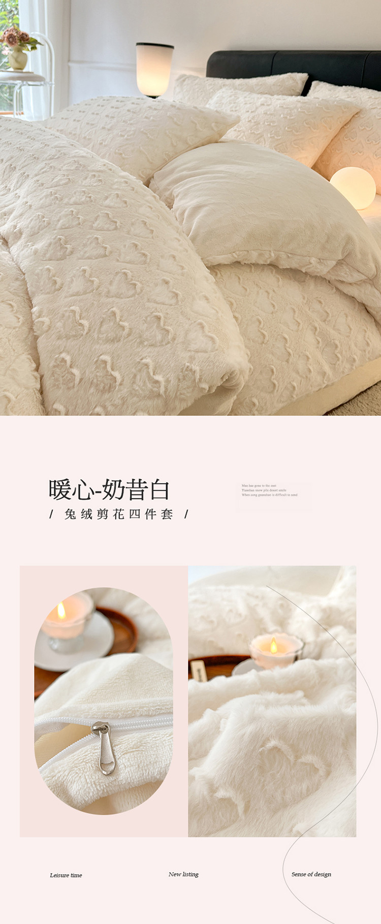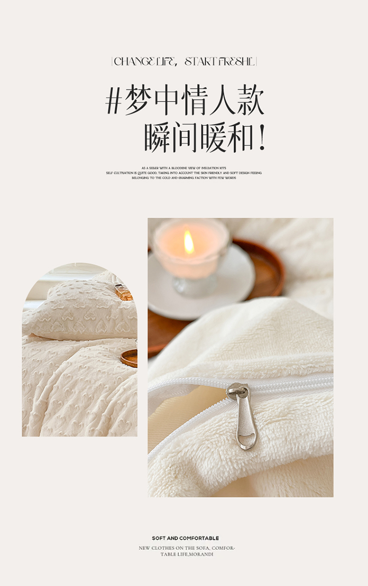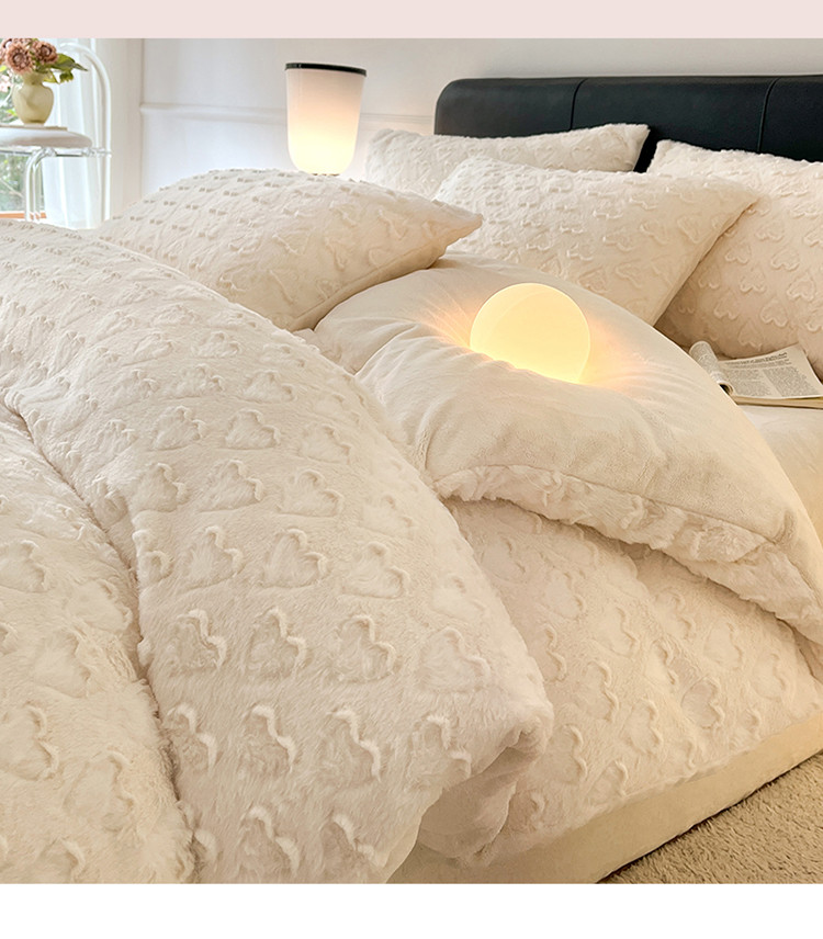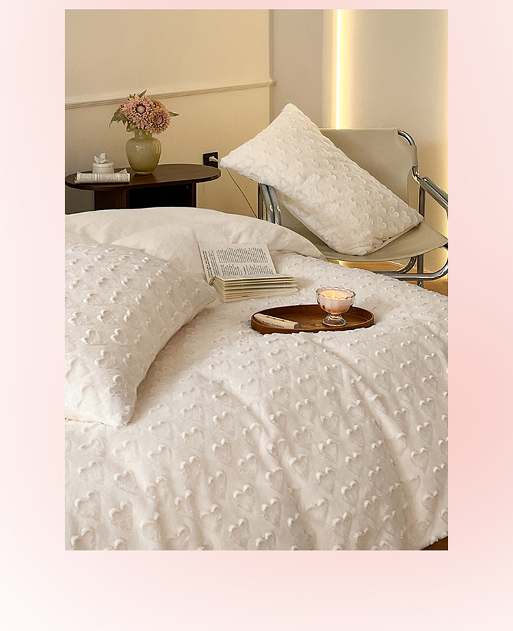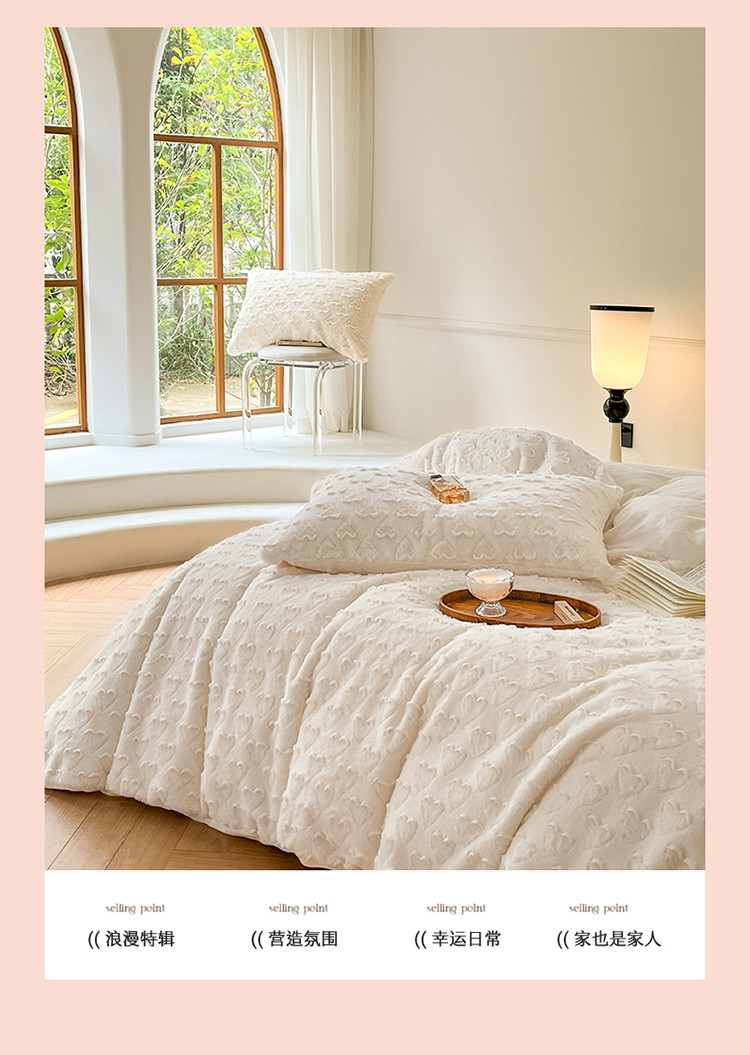 当前位置: 91家纺网 > 商品网购 > 床品套件 > 四件套 > 兔毛绒四件套 > 慕色 2023新款兔绒爱心剪花四件套--暖心系列 暖心-奶昔白