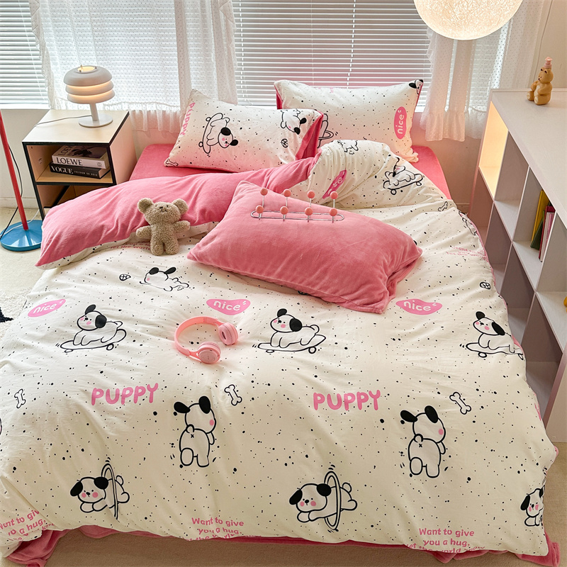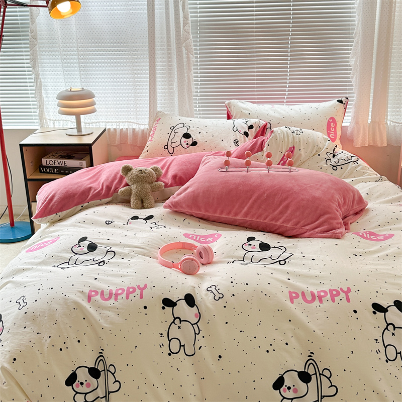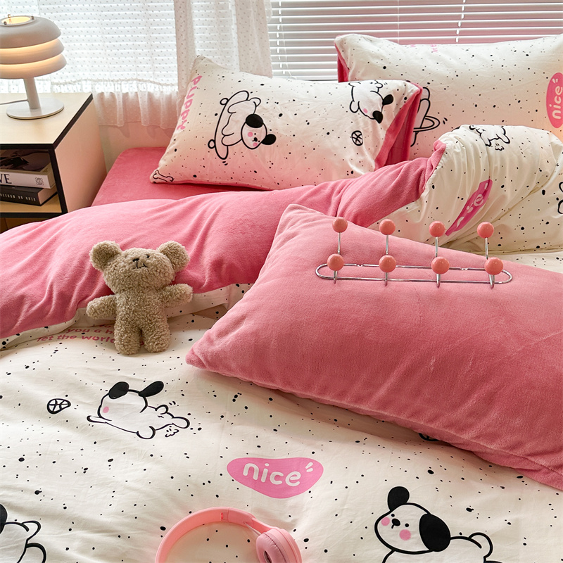 昔可家纺 2023新款全棉加绒四件套 滑板狗狗粉