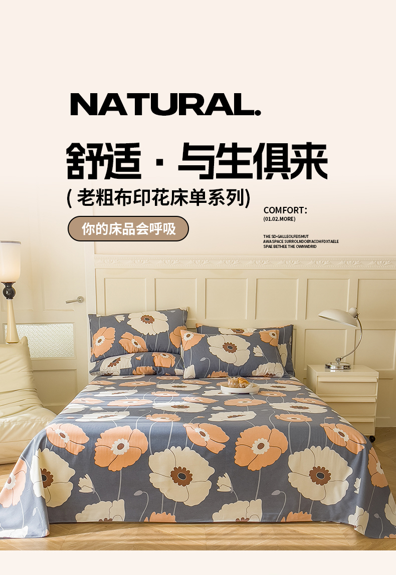 • 91家纺网 家纺一手货源 找家纺 棉乐町家居 2025新款爆款印花老粗布床单系列 青衫
