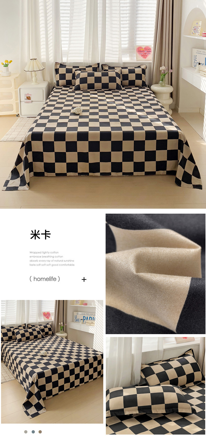 • 91家纺网 家纺一手货源 找家纺 (总)楠沐家纺 2025新款格子系列亲肤磨毛芦荟棉宿舍学生三件套四件套,粉色波点,海蓝大格,黑蝴蝶结,勒夫,洛可可灰,拿铁