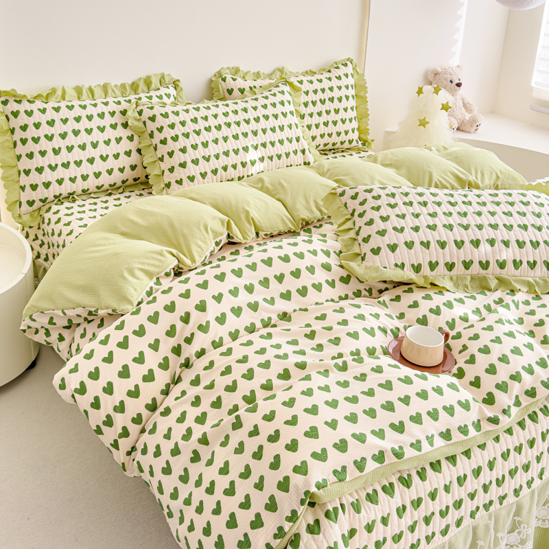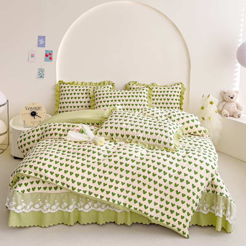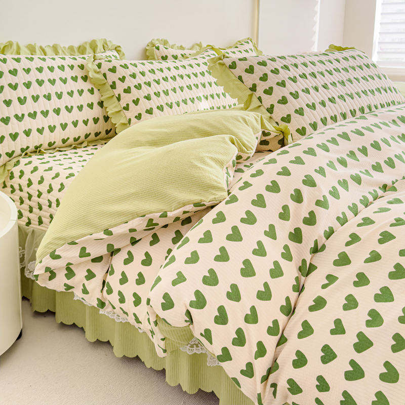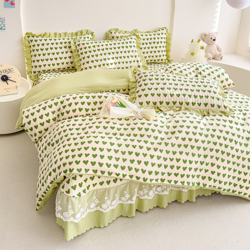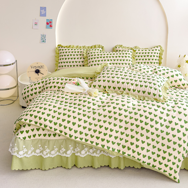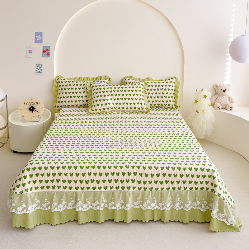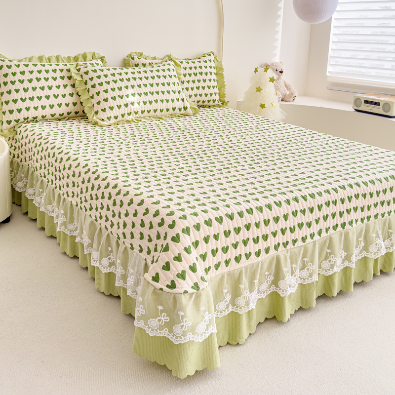 2024直播爆款泡泡棉床盖款四件套双层蕾丝花边夹棉床裙款三件套 甜心绿