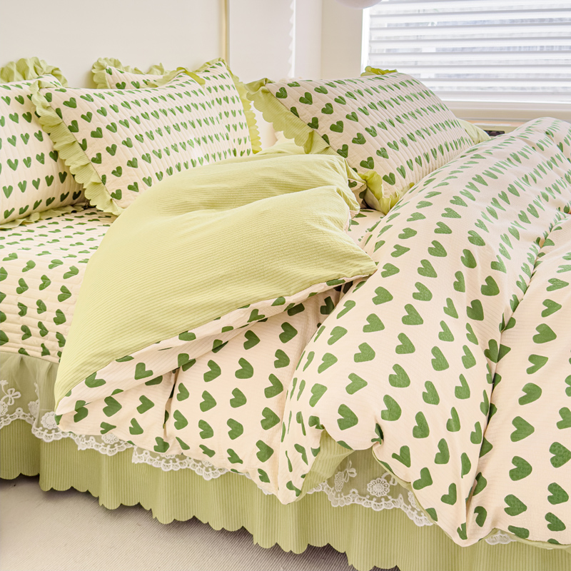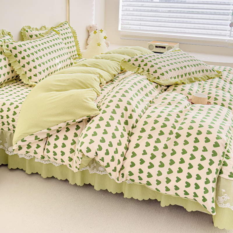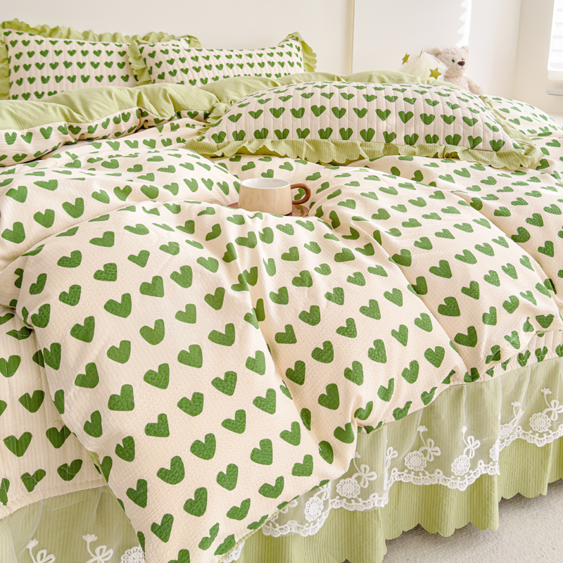 商品名称:2024直播爆款泡泡棉床盖款四件套双层蕾丝花边夹棉床裙款三件套 甜心绿