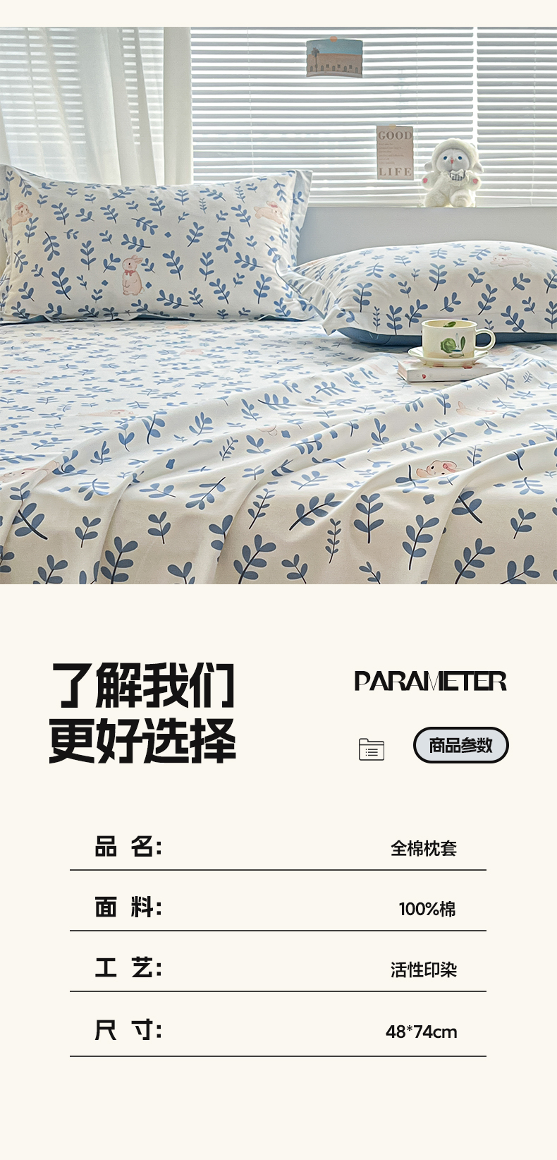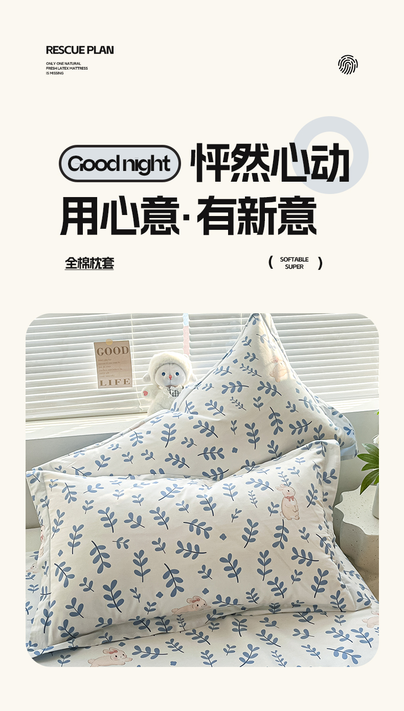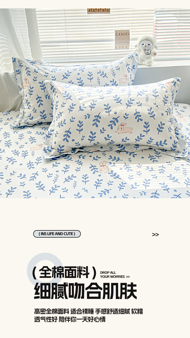 商品名称:涵宸家纺 2024新款全棉小清新印花单品套件--单枕套 枕套-兔影