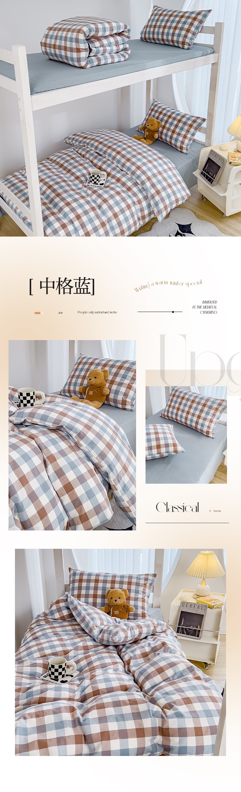 久典家居 2024新款A类全棉学生款三件套 中格蓝