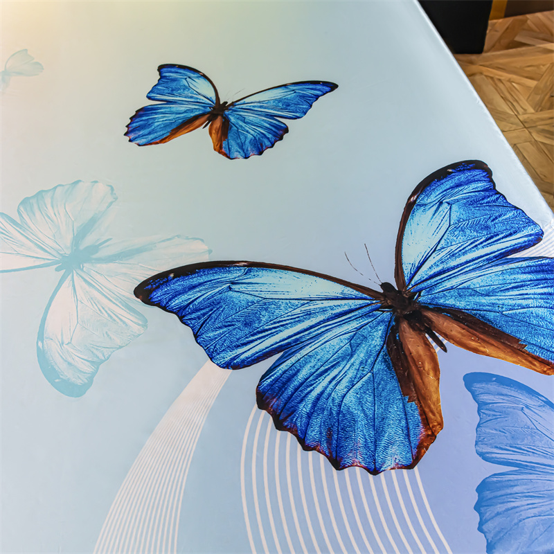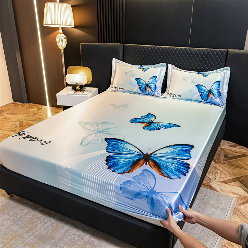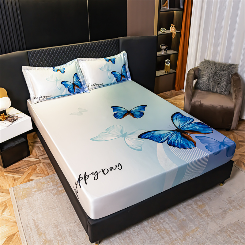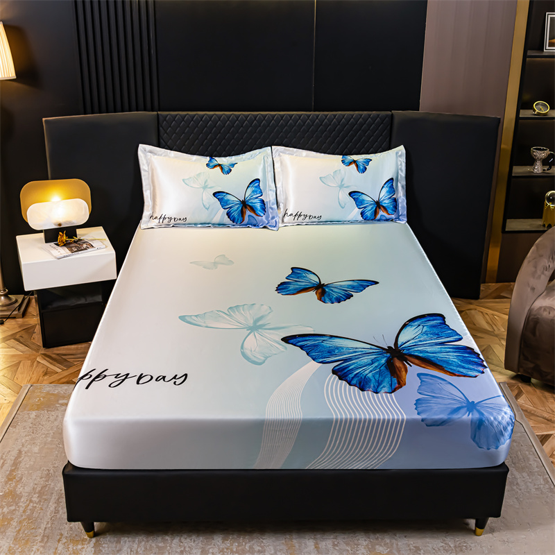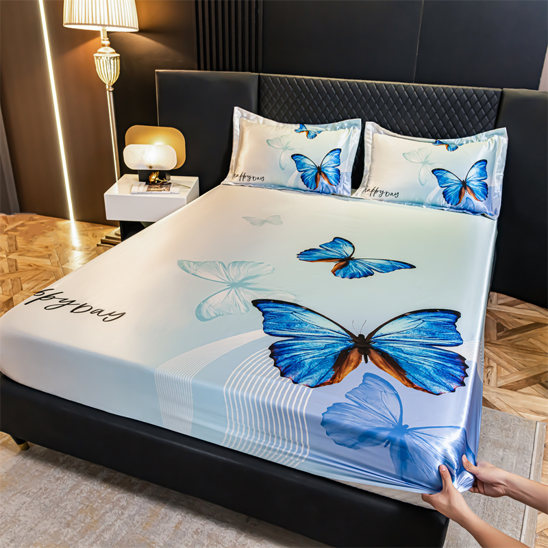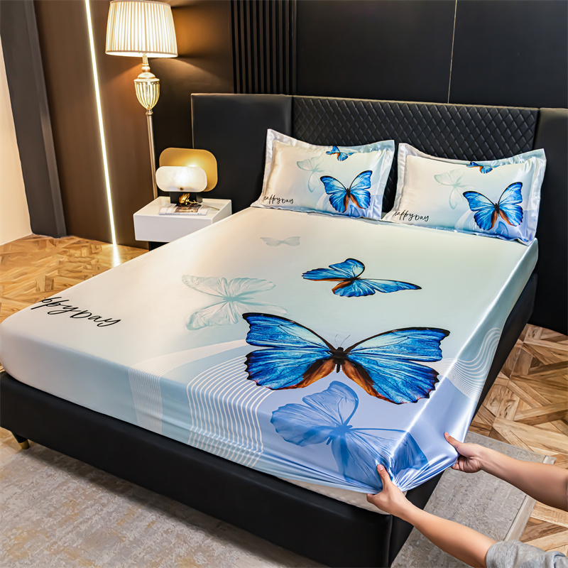 • 91家纺网 家纺一手货源 找家纺 圣比熊 2025新款大版可水洗冰丝床笠宿舍床垫保护套三件套 蓝蝴蝶