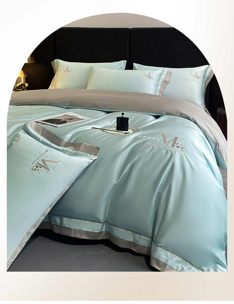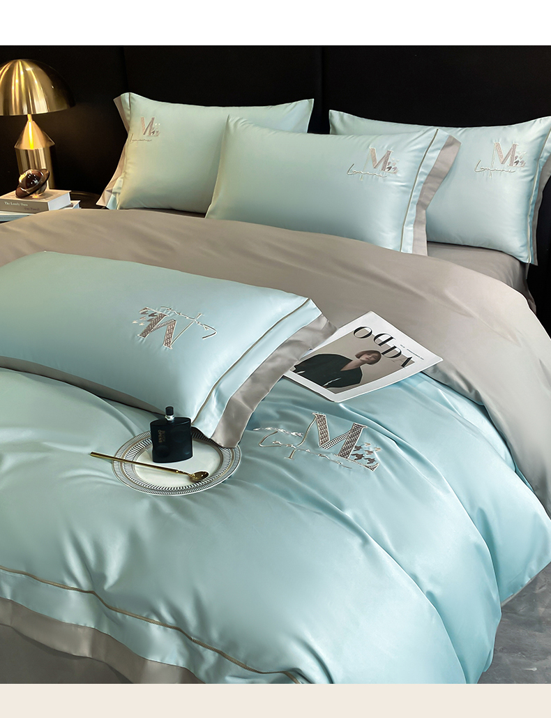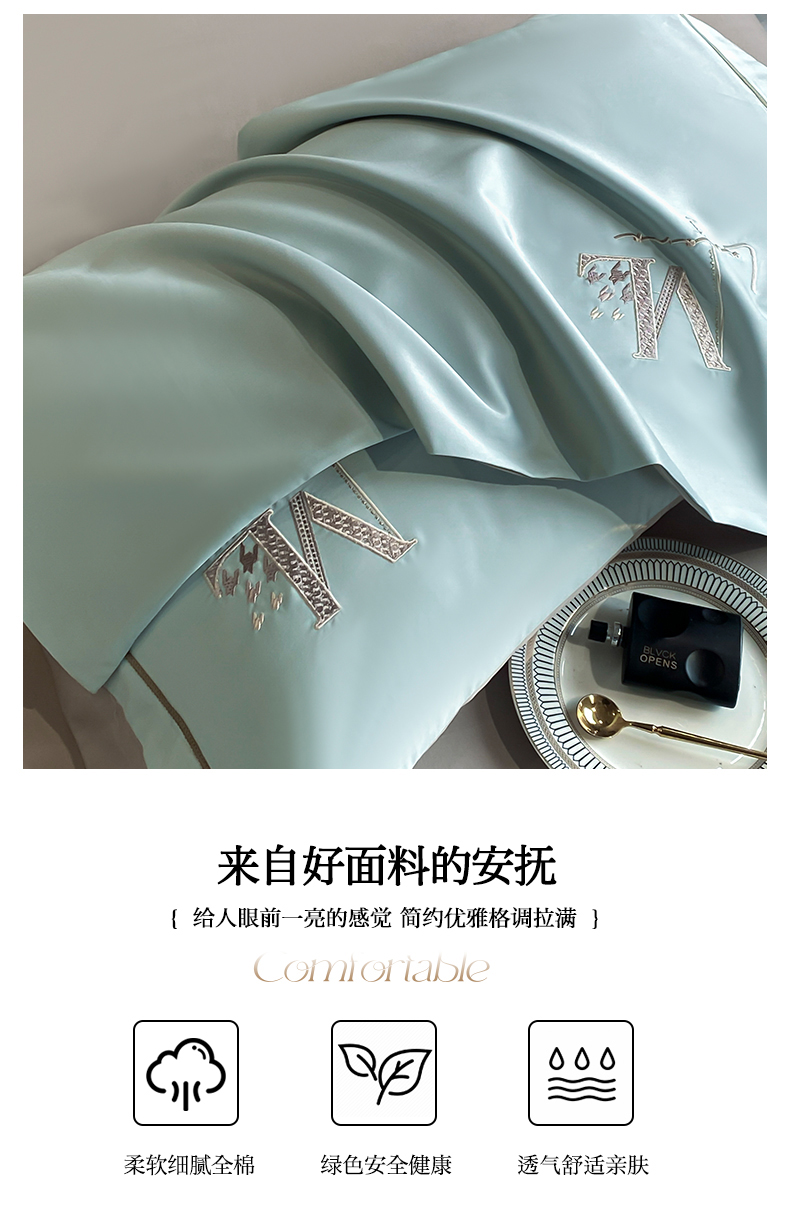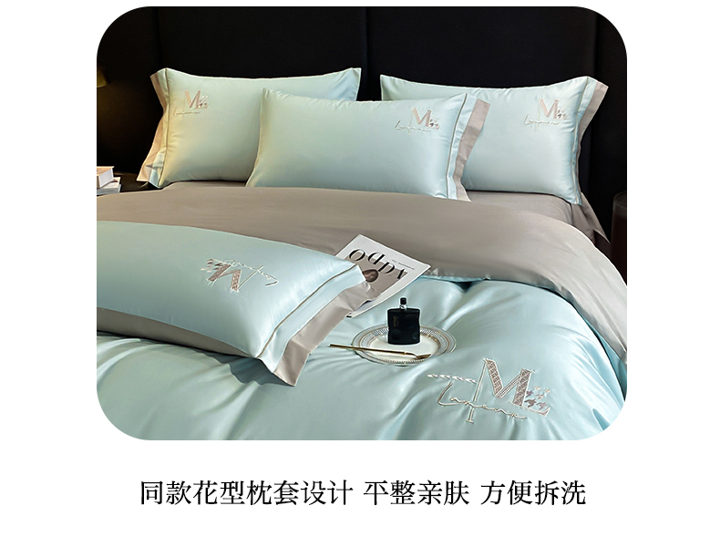 商品名称:拼社家纺 长绒棉全棉刺绣四件套-M系列 茶绿雅灰