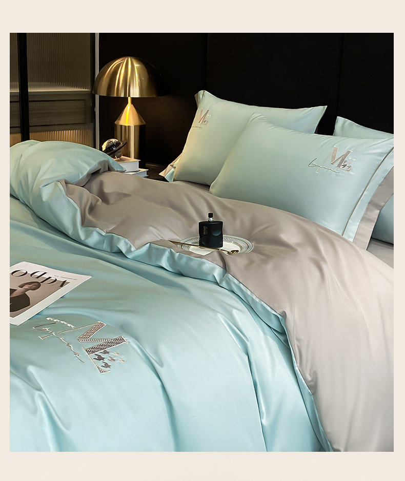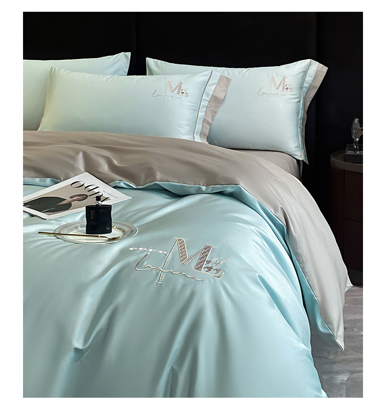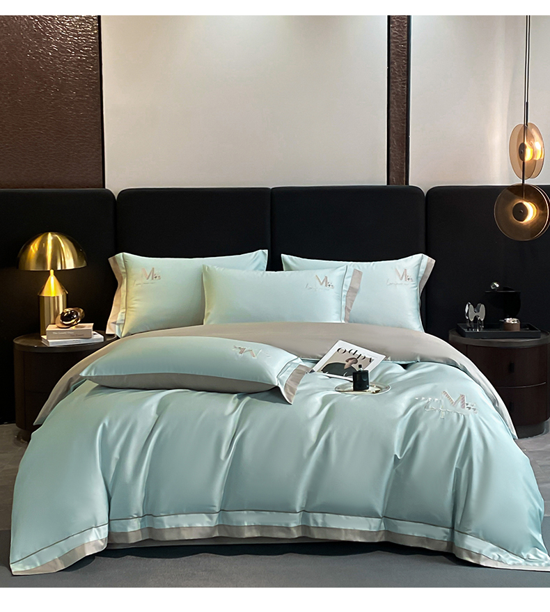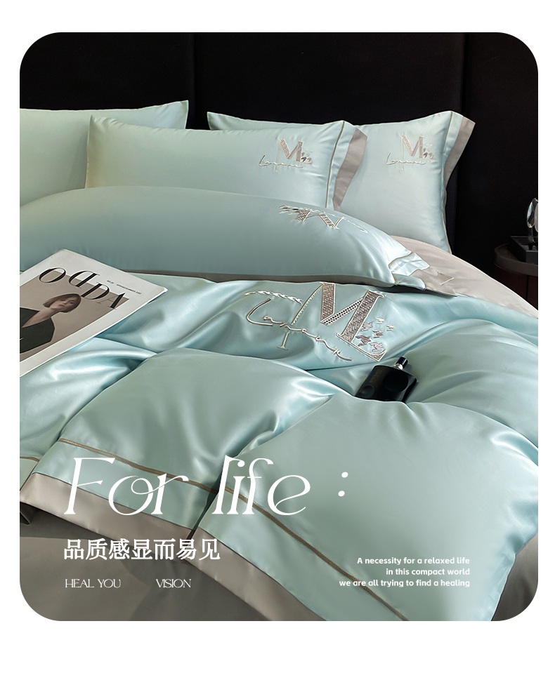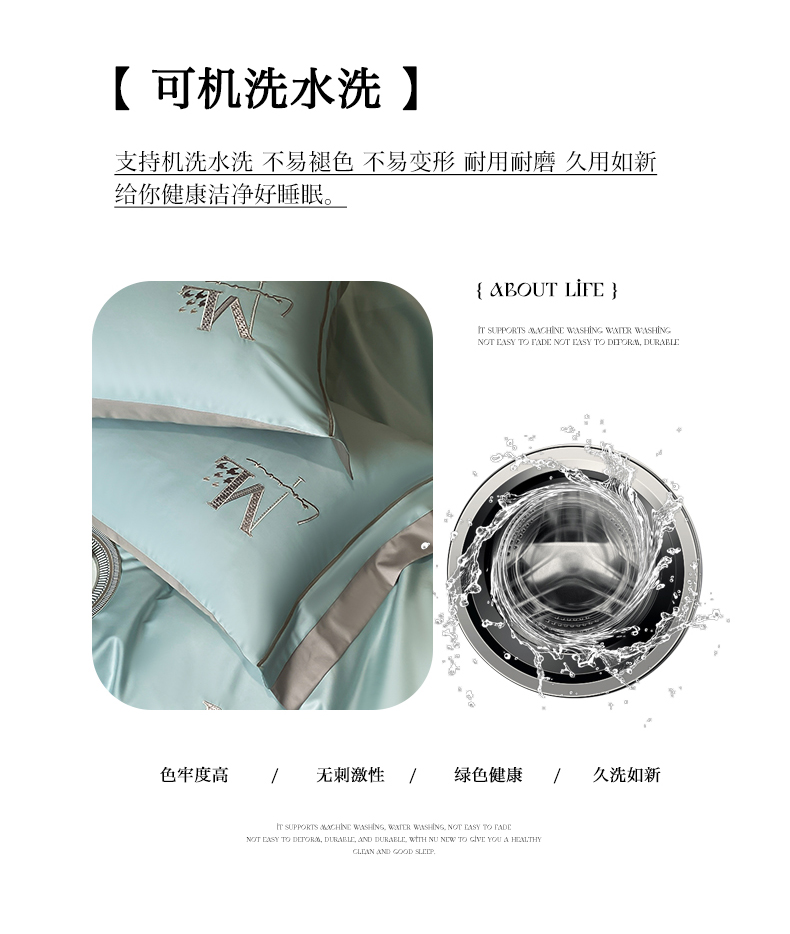 商品名称:拼社家纺 长绒棉全棉刺绣四件套-M系列 茶绿雅灰