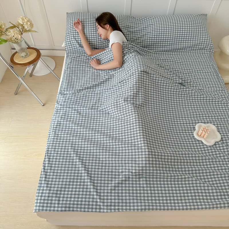 柒星 2024新款无印全棉色织水洗棉隔脏睡袋 蓝灰小格