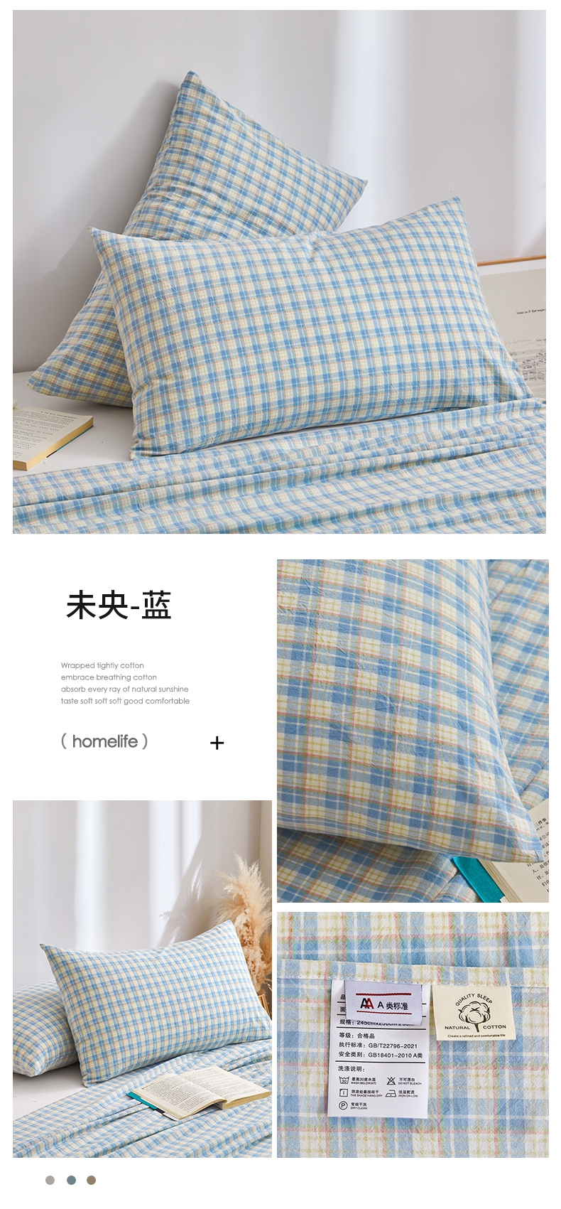商品名称:雅萱家纺 2024新款A类色织全棉水洗棉单枕套 未央-蓝