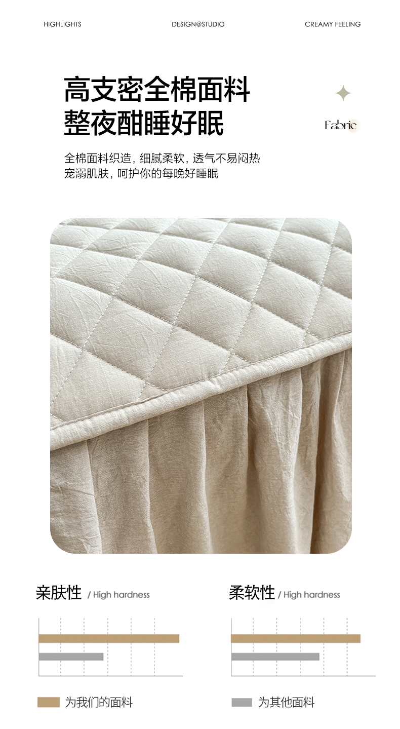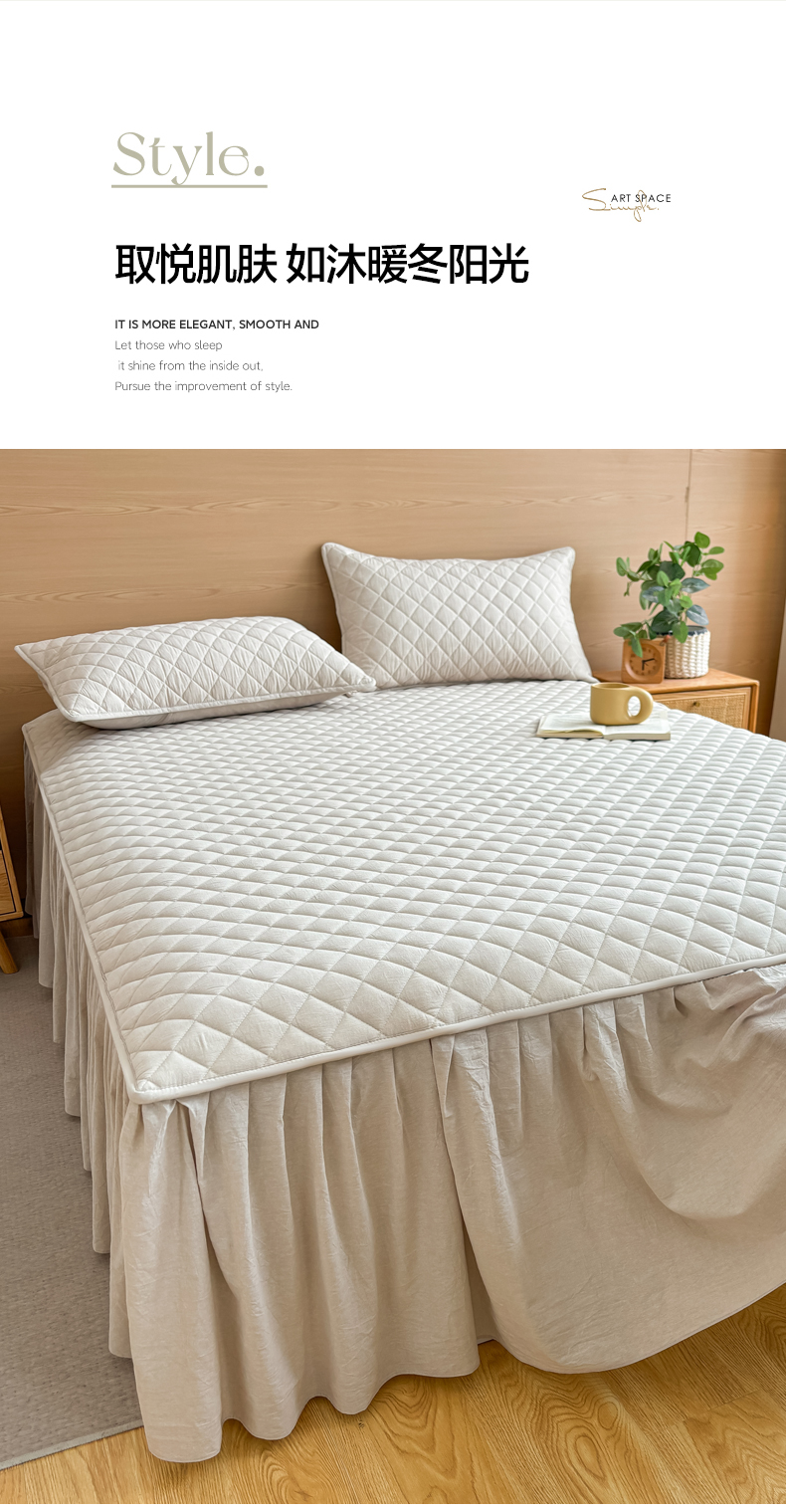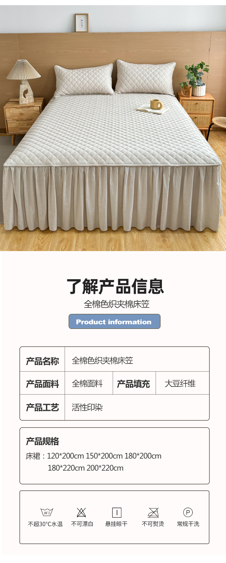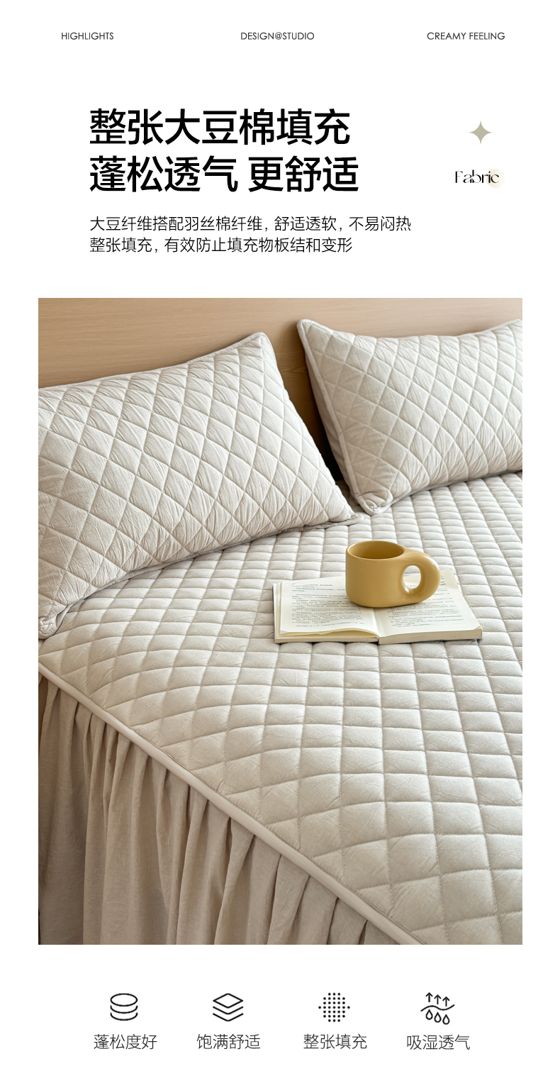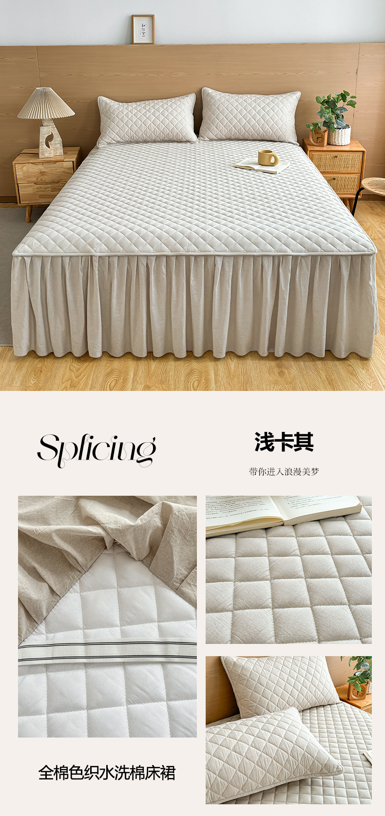 商品名称:糯米猪家纺 2024新款全棉色织水洗棉夹棉床裙 浅卡其
