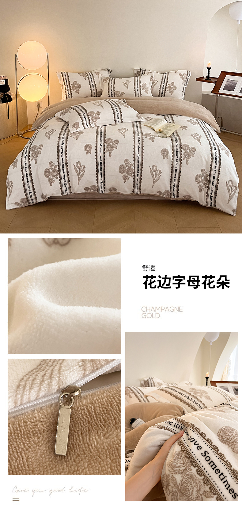 商品名称:启程家纺 2024新款A类牛奶绒轻奢大牌风四件套 花边字母花朵