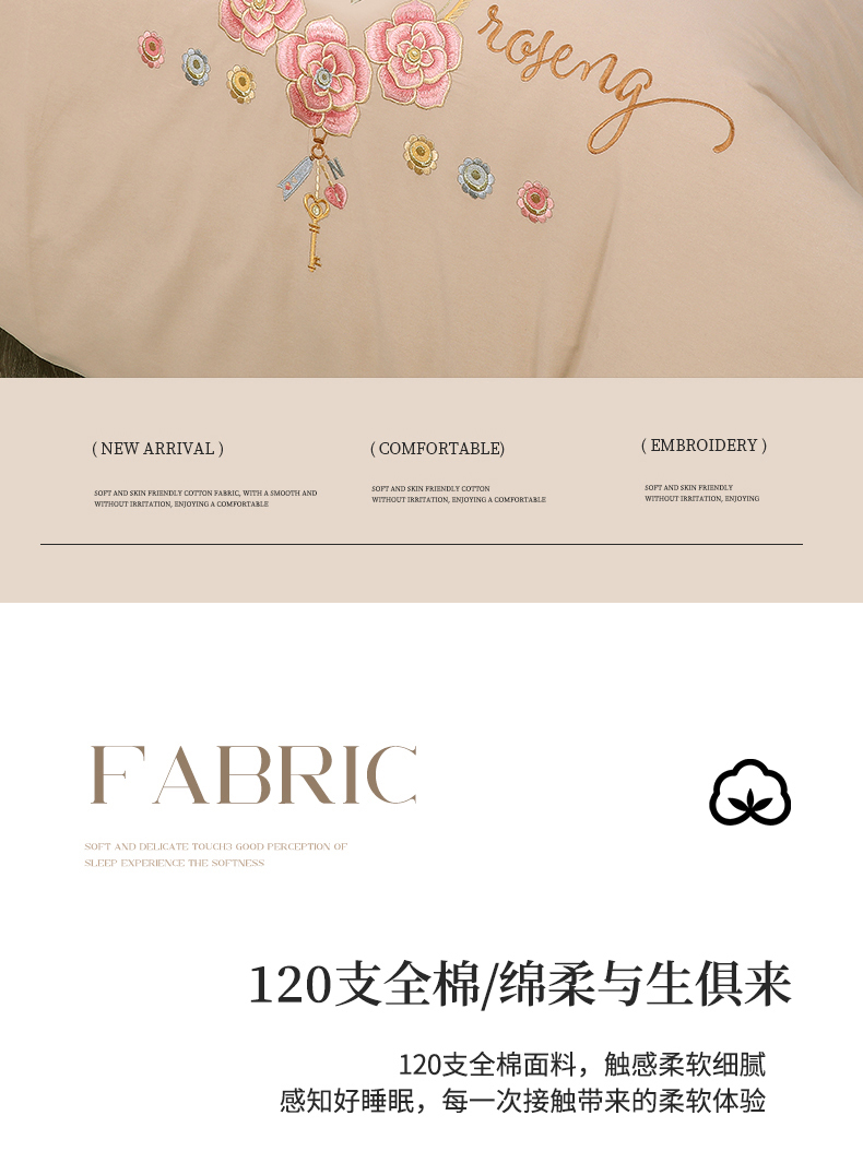 商品名称:2026秋冬新品全棉磨毛刺绣120支四件套系列-玫瑰庄园 玫瑰庄园-米驼