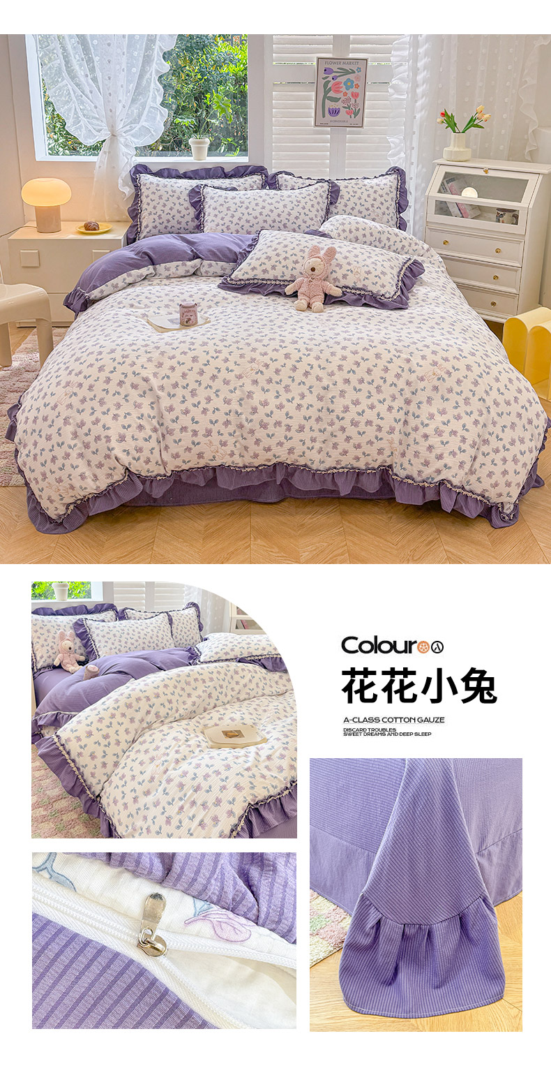 商品名称:同田家纺 2024新款泡泡棉印花蕾丝工艺四件套 花花小兔
