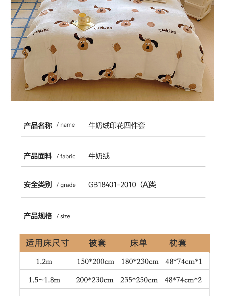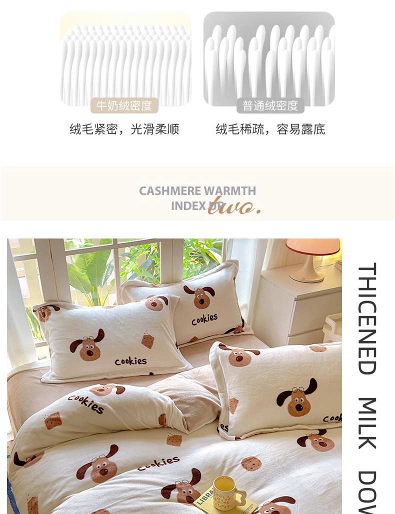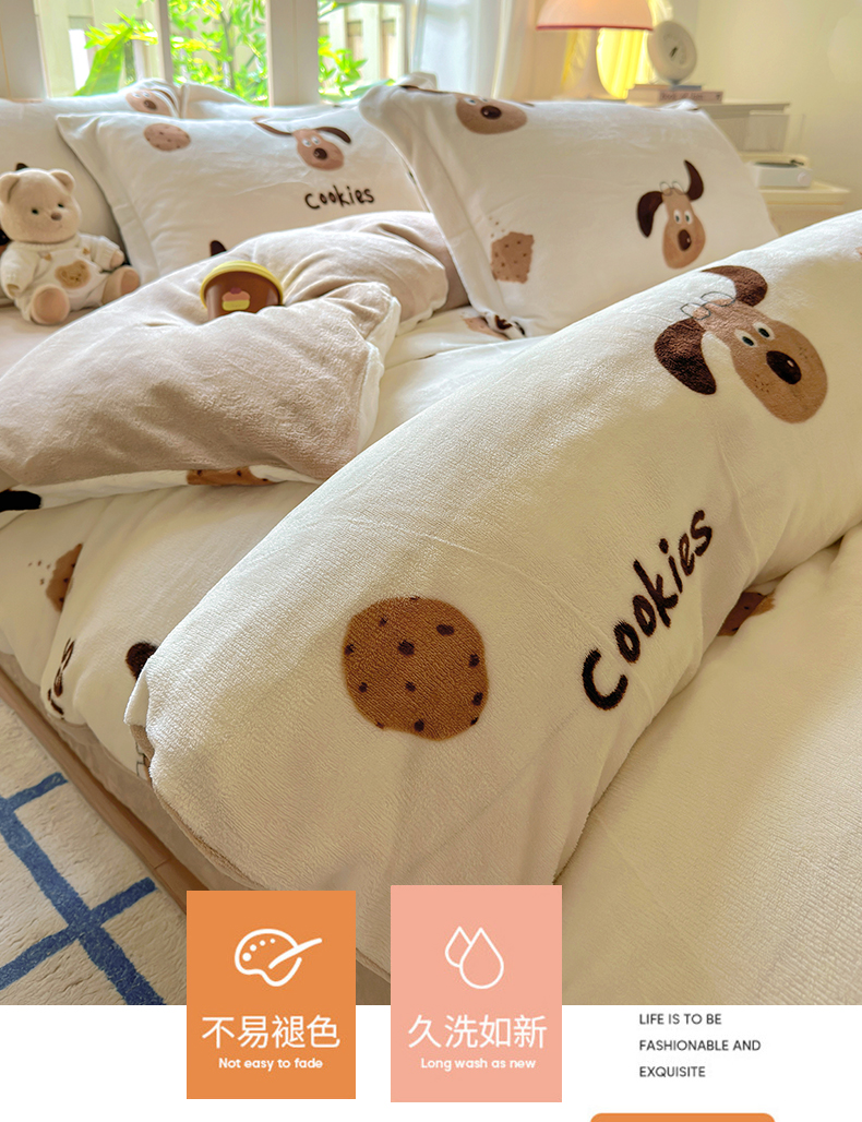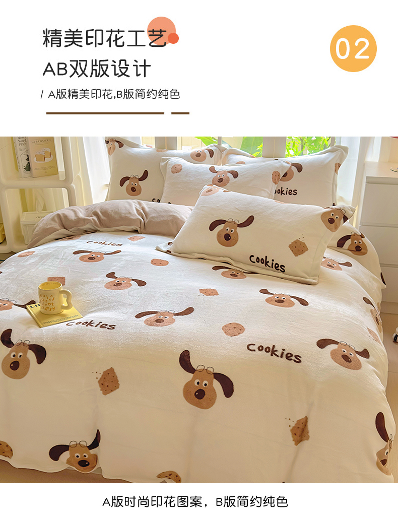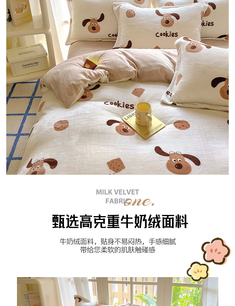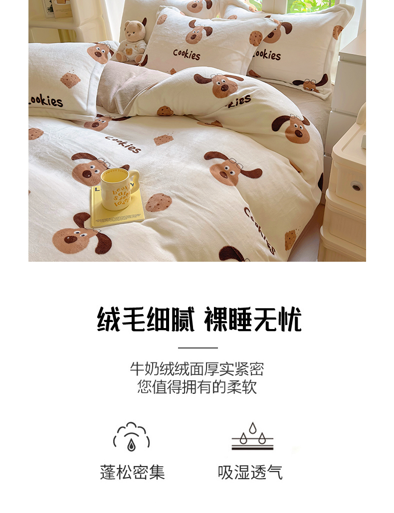 当前位置: 91家纺网 > 商品网购 > 床品套件 > 四件套 > 牛奶绒四件套 > 百寐 2024新款加厚A类牛奶绒印花卡通床单床笠四件套三件套 开心狗狗