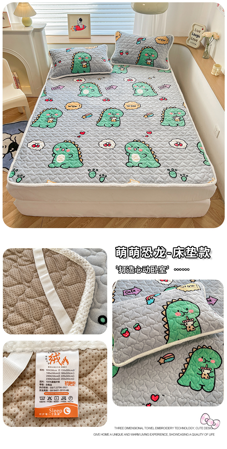 • 91家纺网 家纺一手货源 找家纺 孩子王 2024新款印花牛奶绒薄款床垫加厚绒保暖床护垫床笠 床单款-萌萌恐龙
