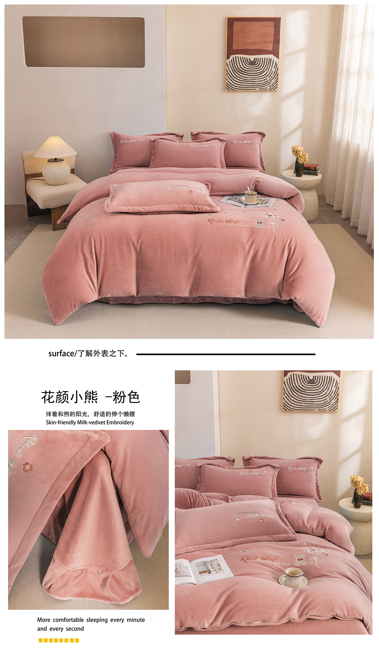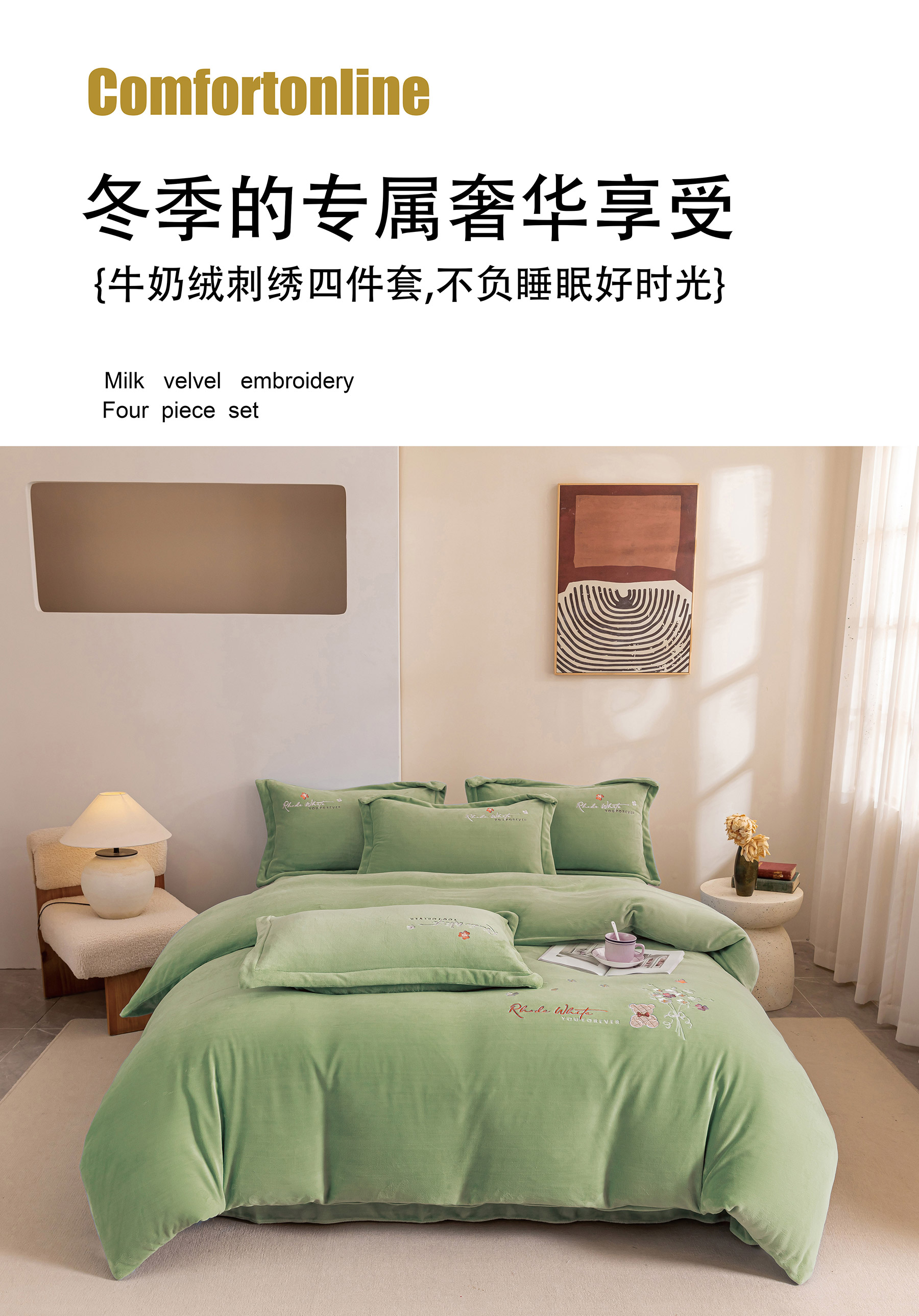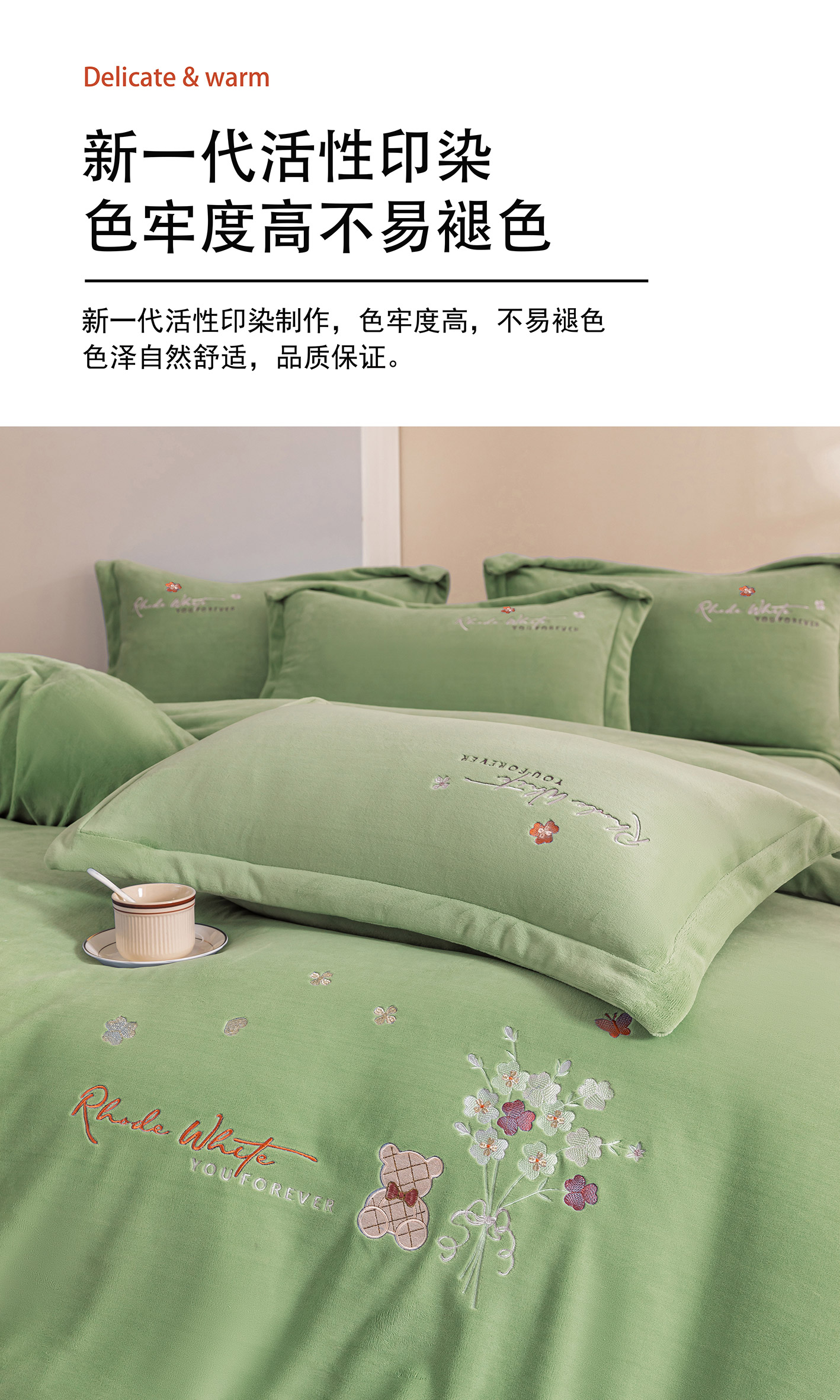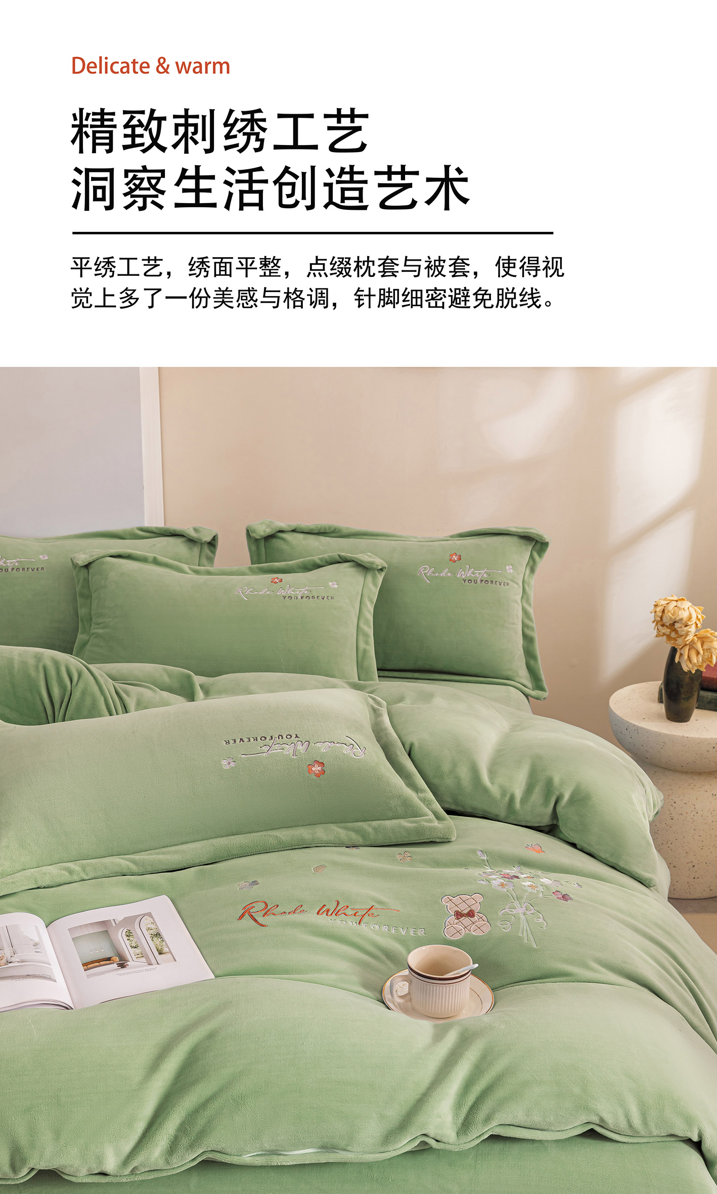(总)绒博士 2025新款270克牛奶绒双拼角刺绣宽边款四件套--维也纳系列,维也纳-粉豆沙,维也纳-果绿,维也纳-浅咖,维也纳-浅蓝