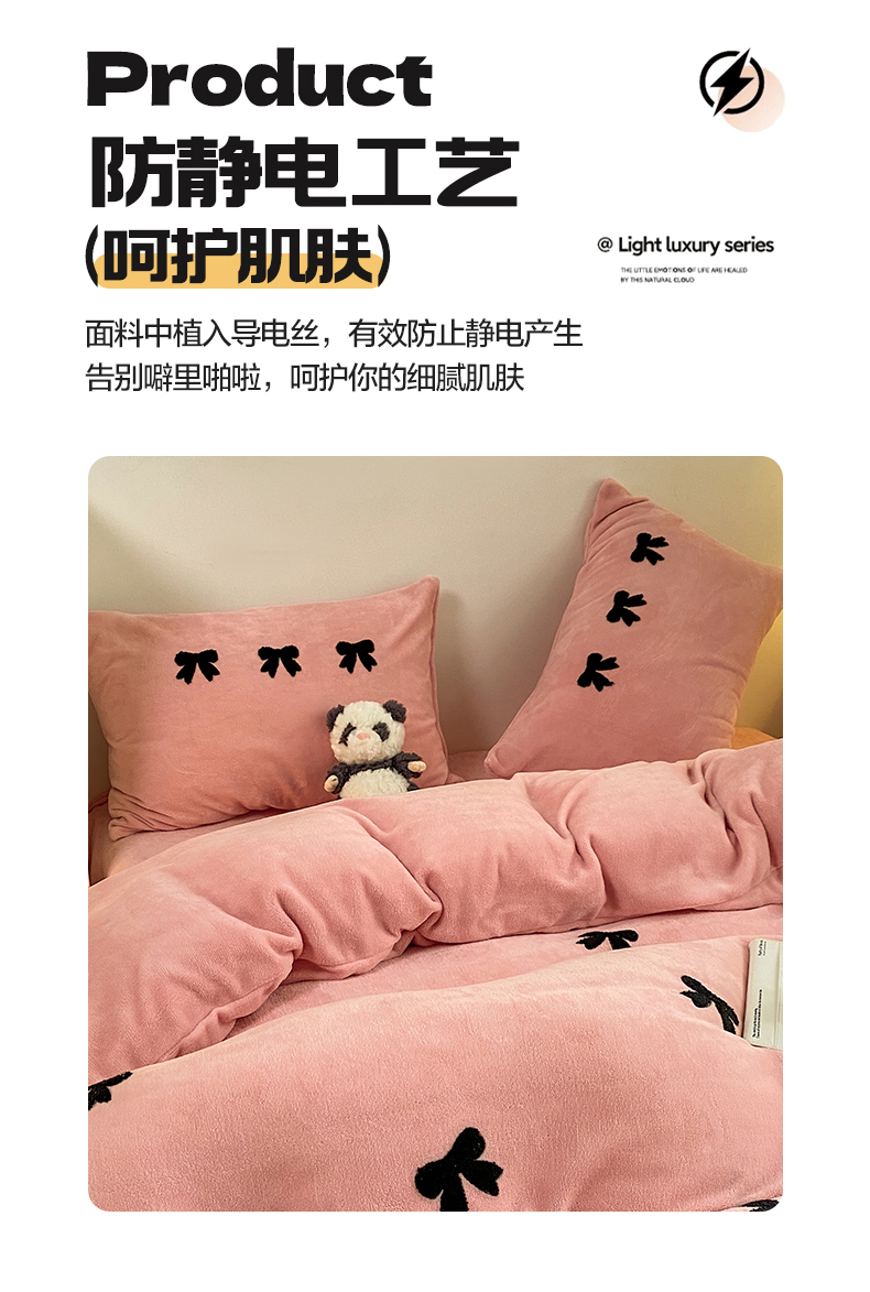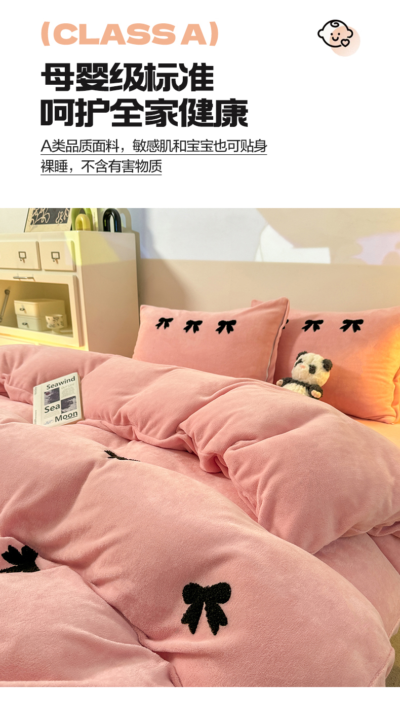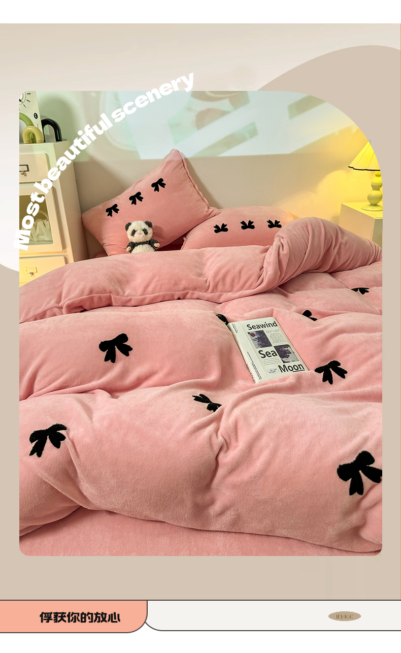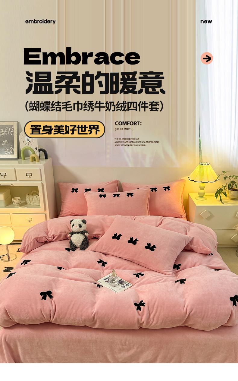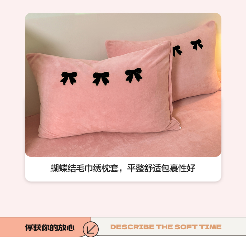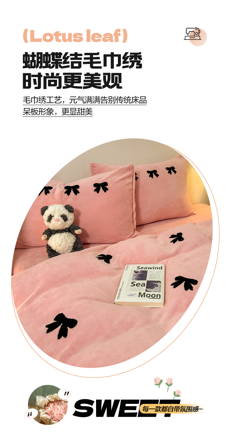 商品名称:首尔家纺 2024新款牛奶绒卡通毛巾绣蝴蝶结系列四件套 花间蝴蝶-粉