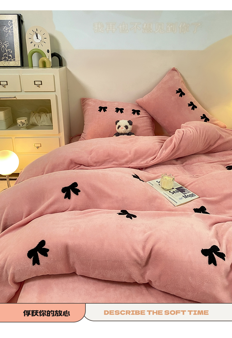 首尔家纺 2024新款牛奶绒卡通毛巾绣蝴蝶结系列四件套 花间蝴蝶-粉