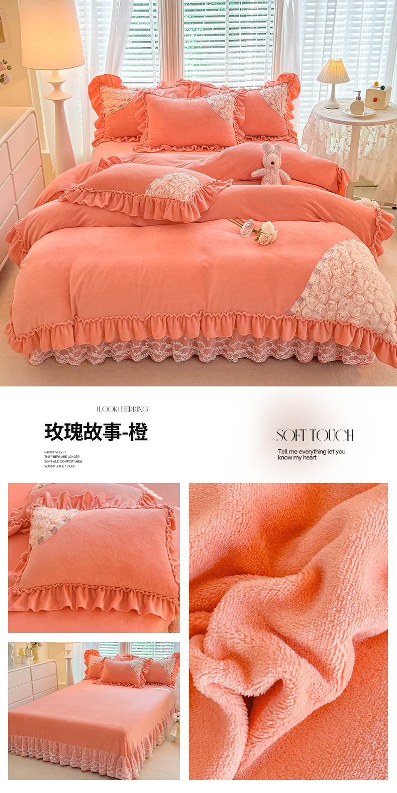 商品名称:芭比蔓家纺 2024新款牛奶绒四件套-玫瑰故事 玫瑰故事-橙
