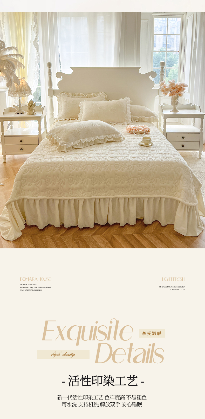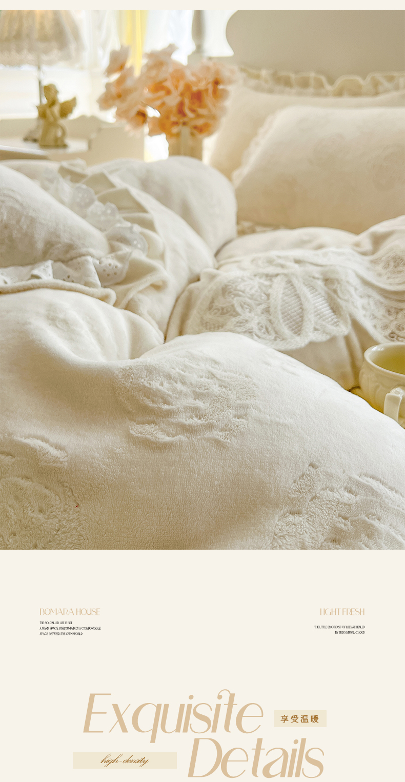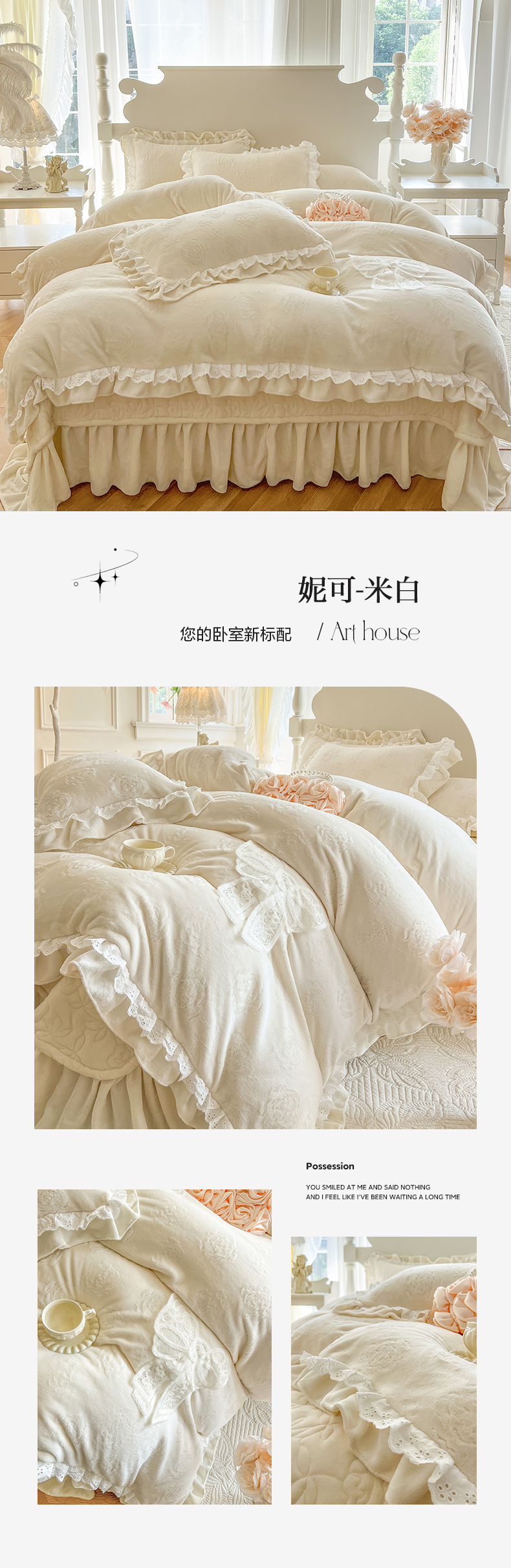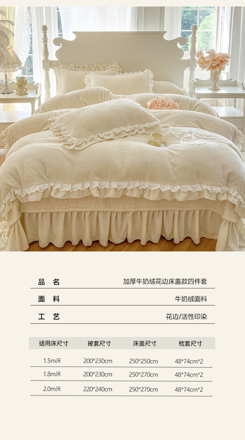 当前位置: 91家纺网 > 商品网购 > 床品套件 > 四件套 > 牛奶绒四件套 > 瑞宝 2025新款牛奶绒花边床盖四件套-妮可 妮可-米白