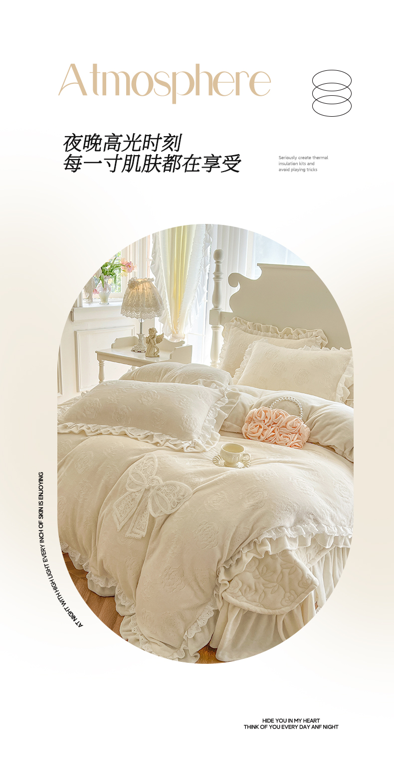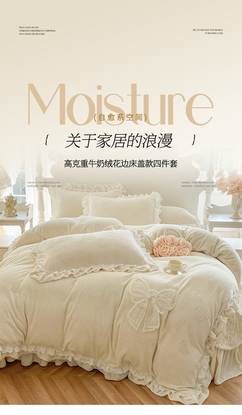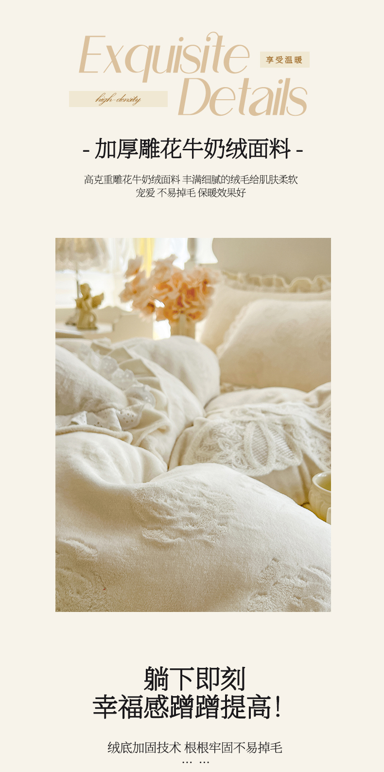 当前位置: 91家纺网 > 商品网购 > 床品套件 > 四件套 > 牛奶绒四件套 > 瑞宝 2025新款牛奶绒花边床盖四件套-妮可 妮可-米白