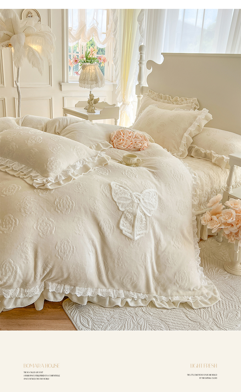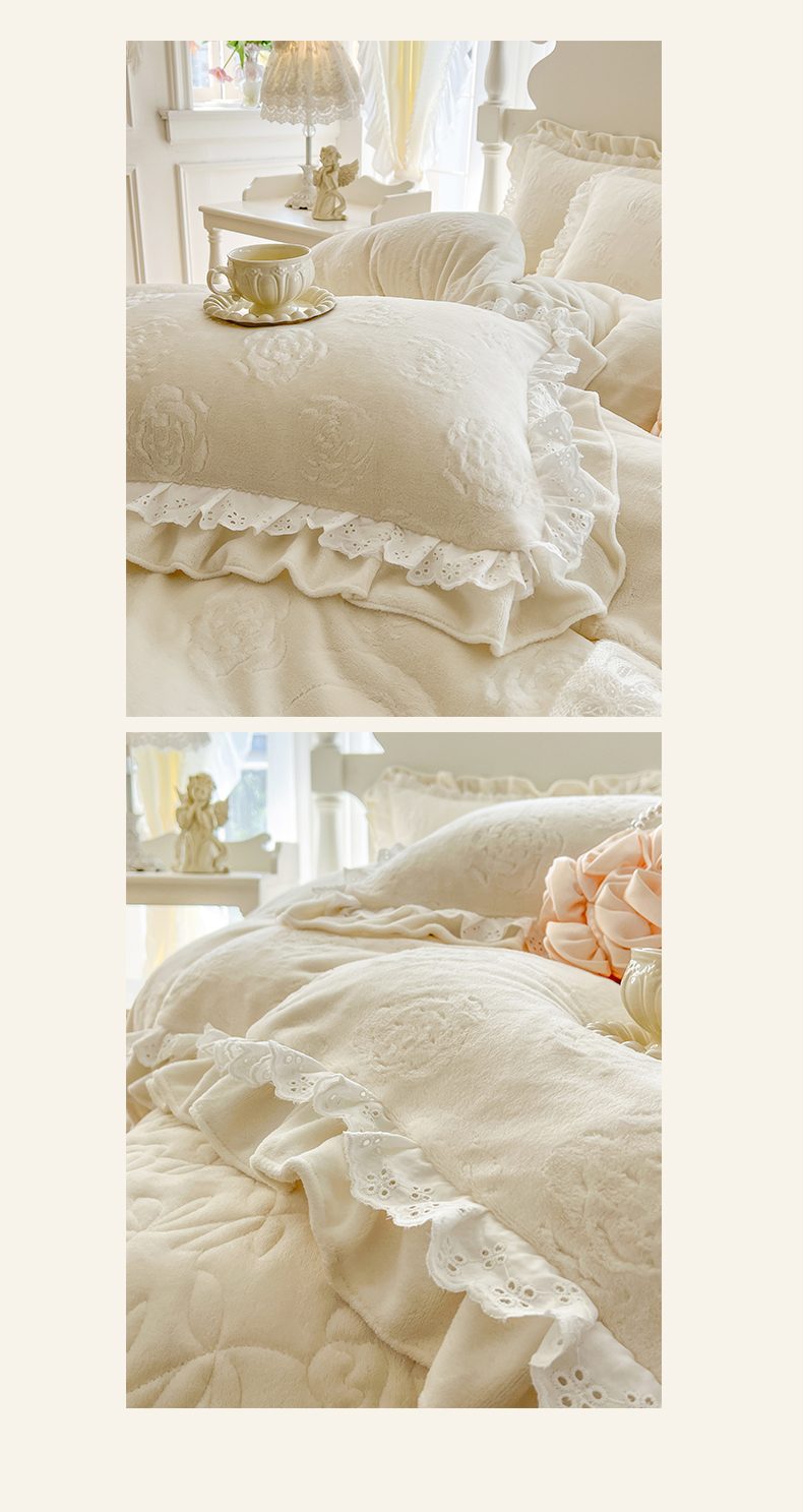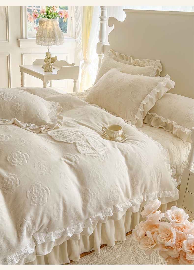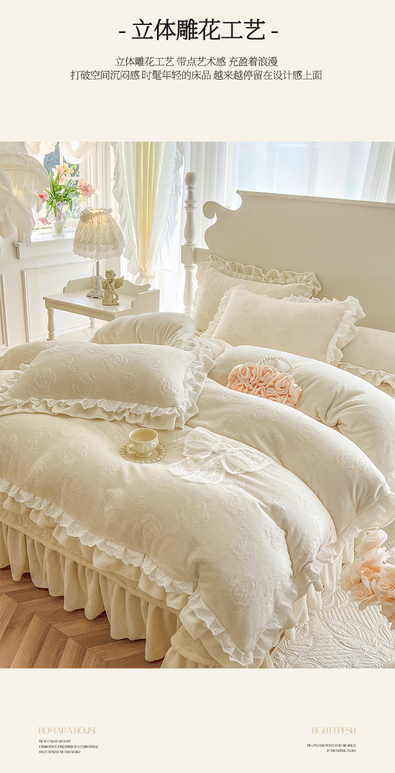 当前位置: 91家纺网 > 商品网购 > 床品套件 > 四件套 > 牛奶绒四件套 > 瑞宝 2025新款牛奶绒花边床盖四件套-妮可 妮可-米白