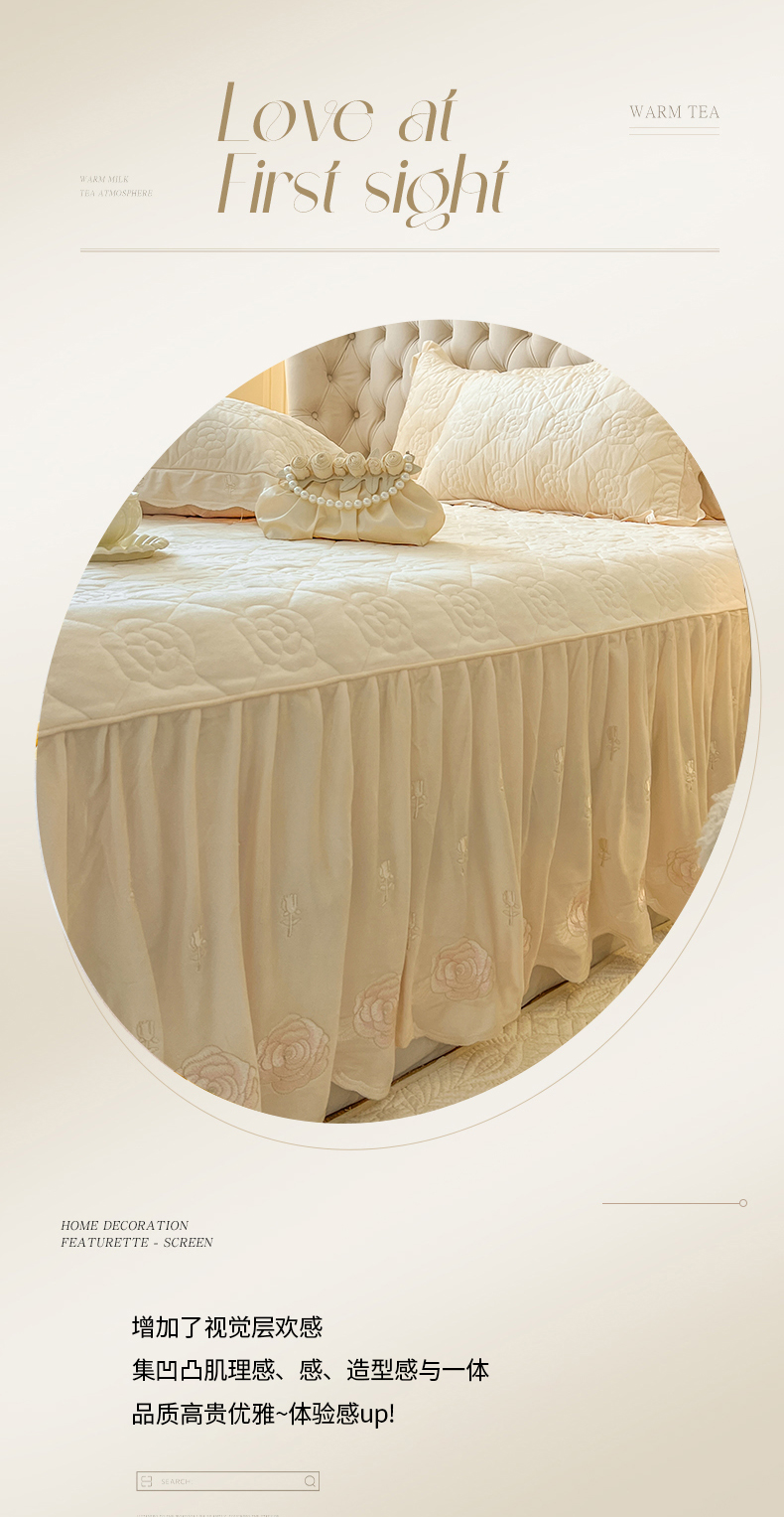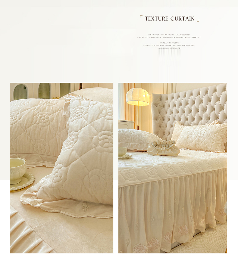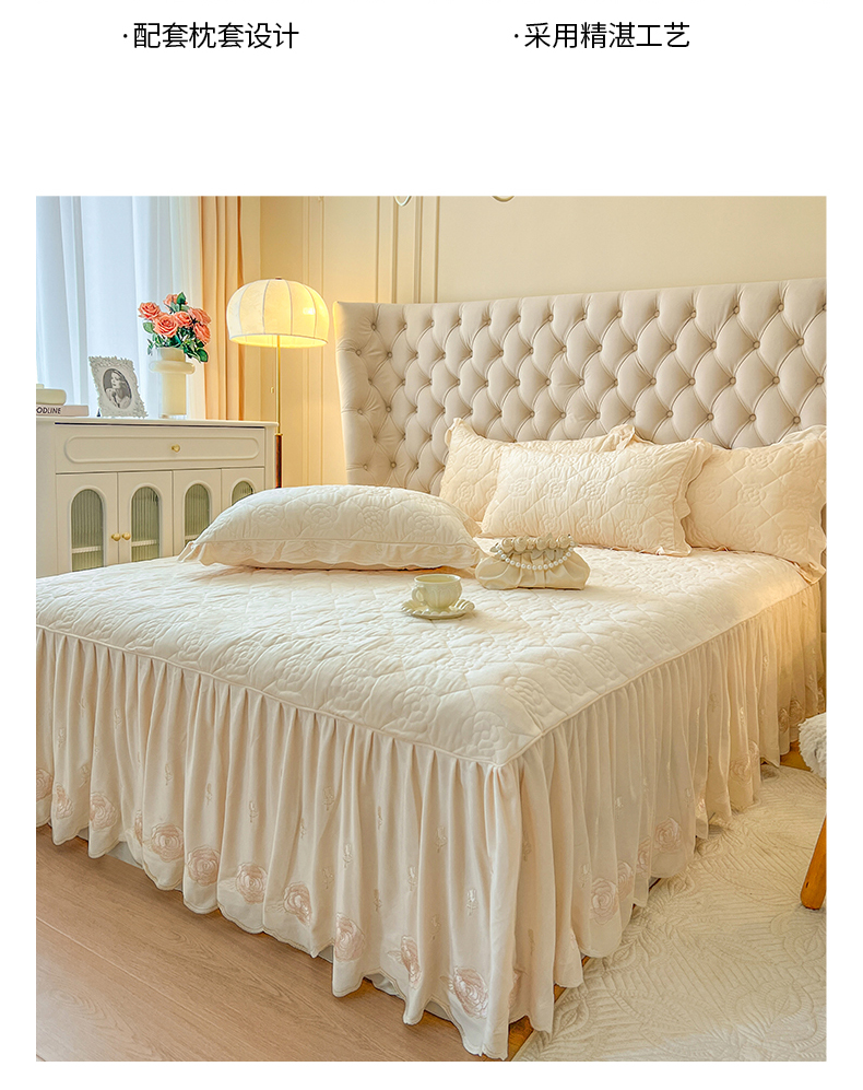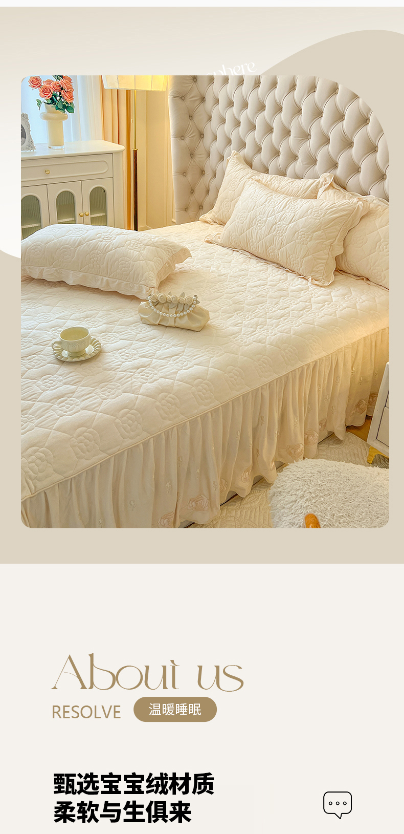 商品名称:网红馆(ck家纺) 2025新款高克重加厚保暖重工艺宝宝绒晨曦玫瑰系列床裙三件套 杏仁米