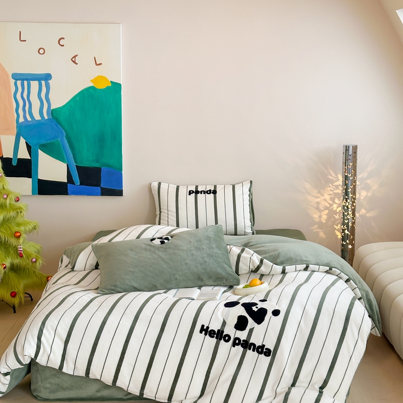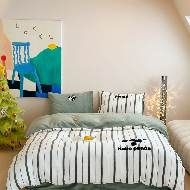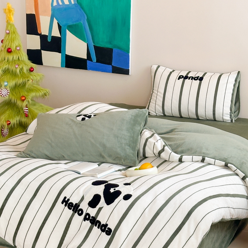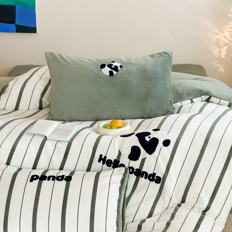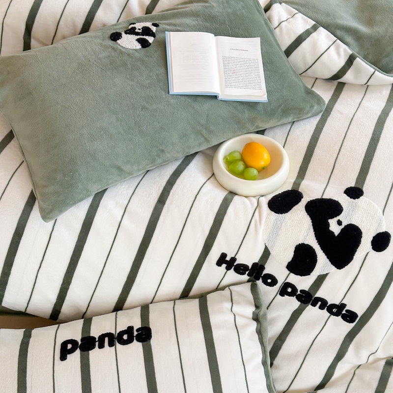 商品名称:时年家纺 2024新款牛奶绒毛巾绣系列四件套(充值会员优惠5元) 条纹熊猫-绿