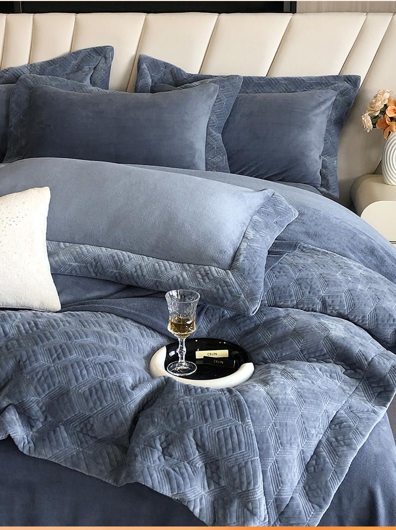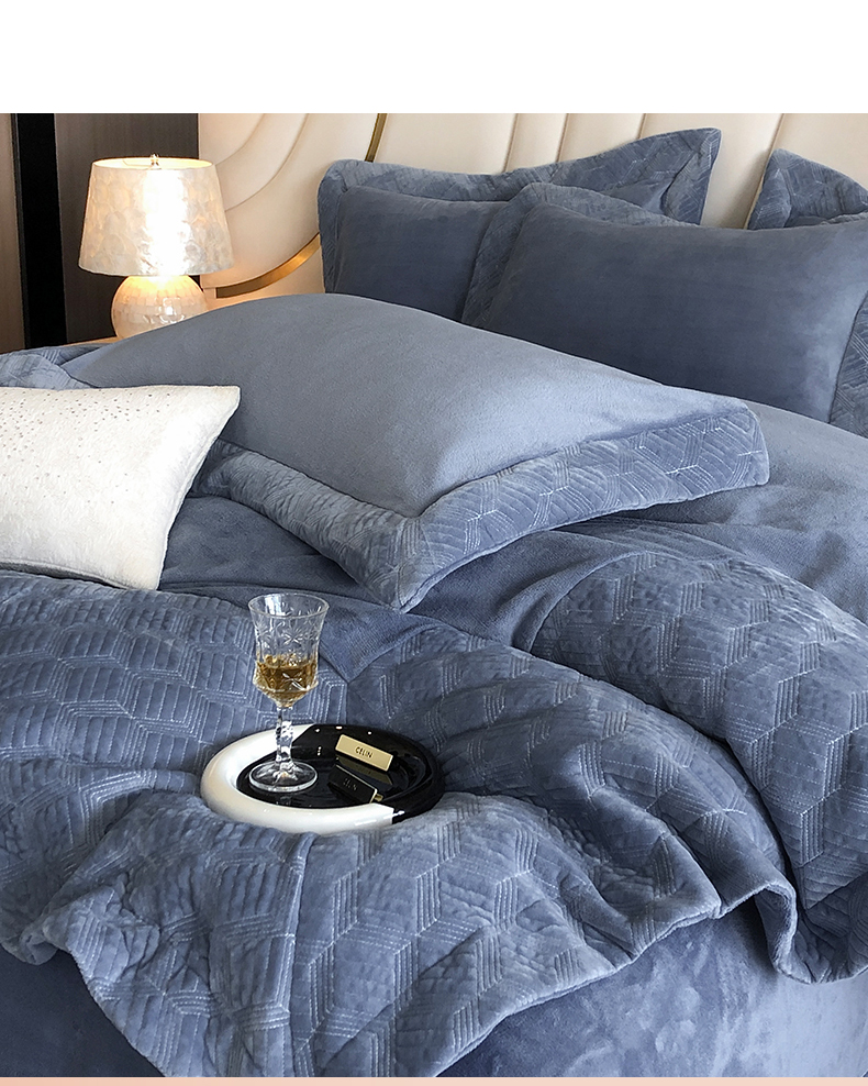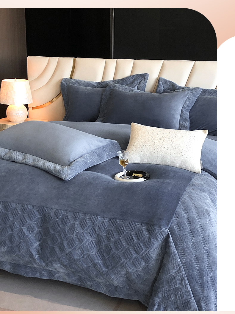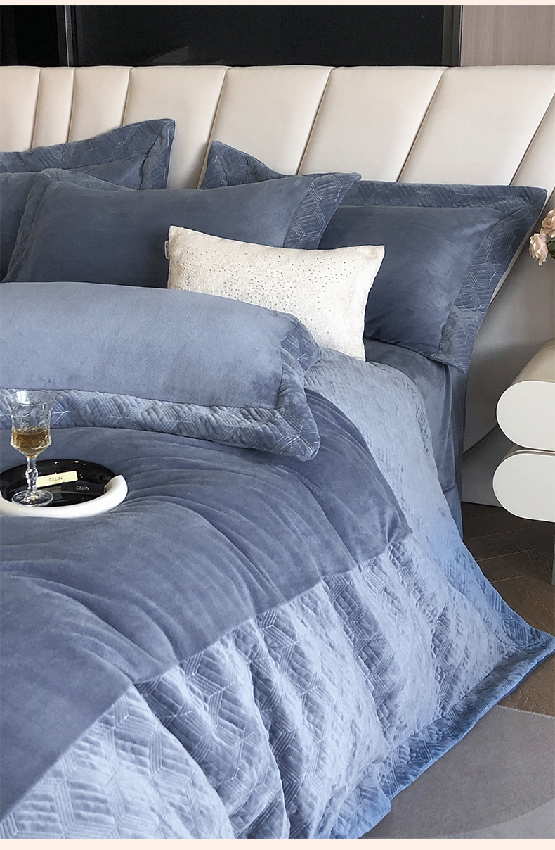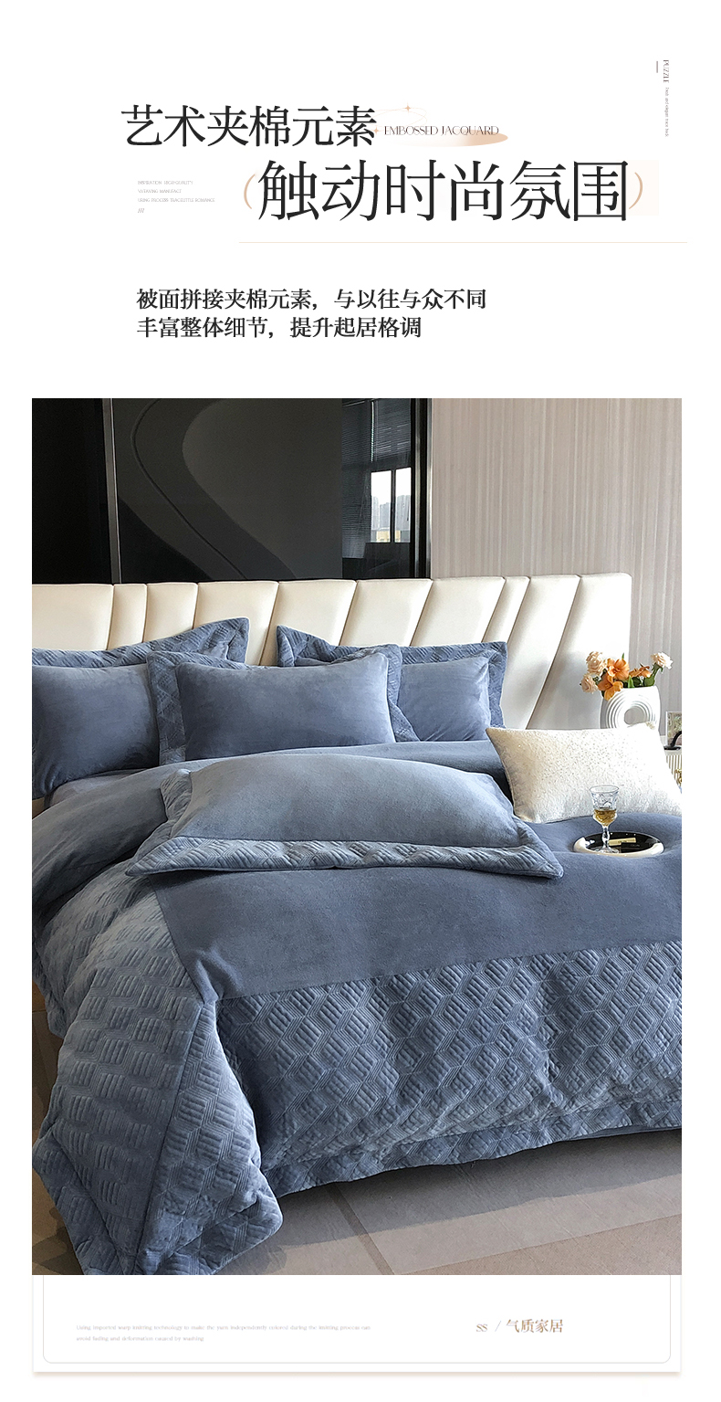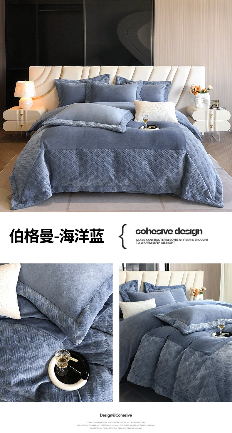 商品名称:保罗圣迪奥 2024新款绗绣大拼角牛奶绒四件套-伯格曼 伯格曼-海洋蓝