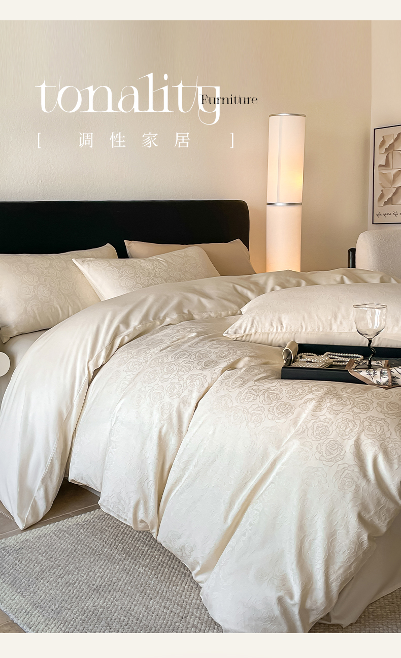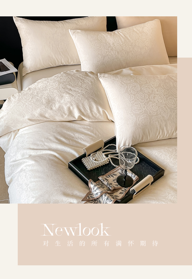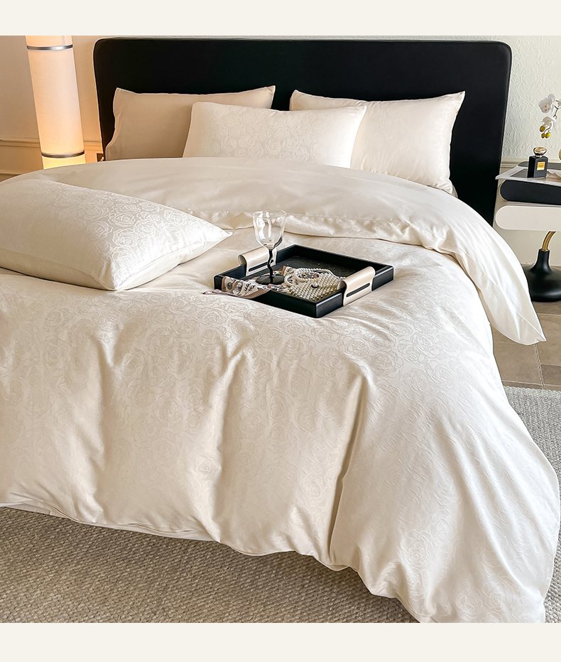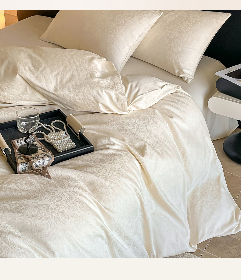 三朵家纺 2024新款全棉贡缎大提花四件套系列 玫瑰园白