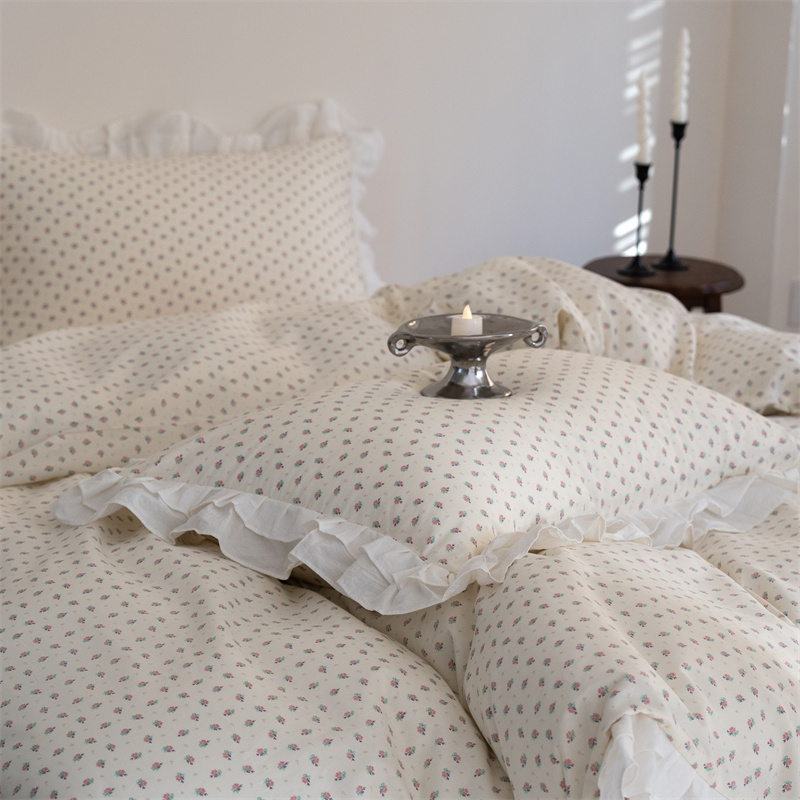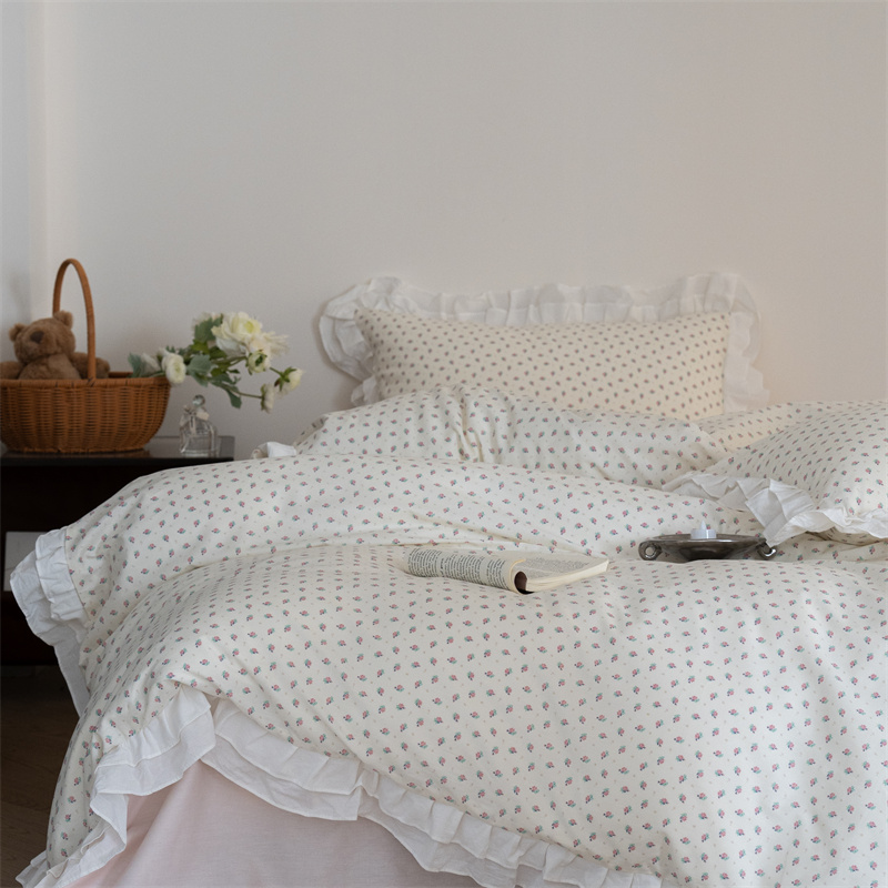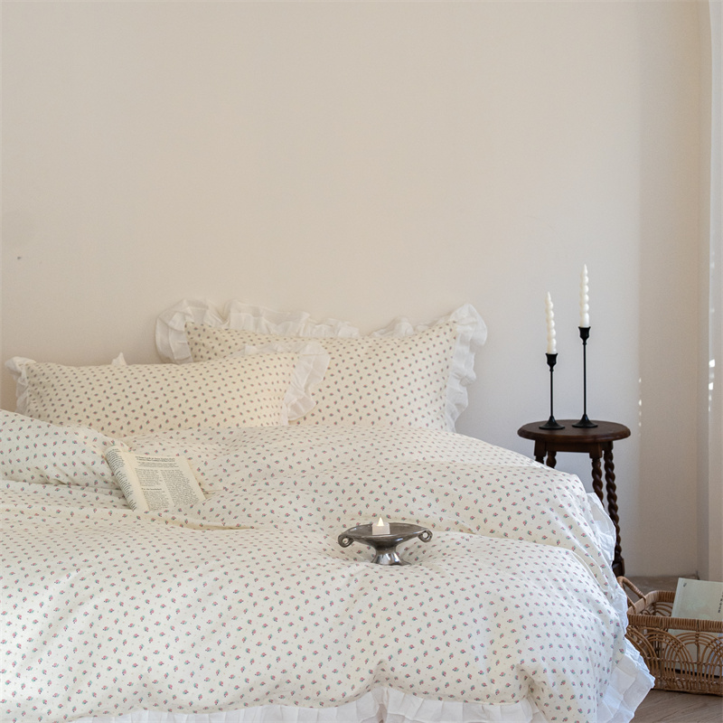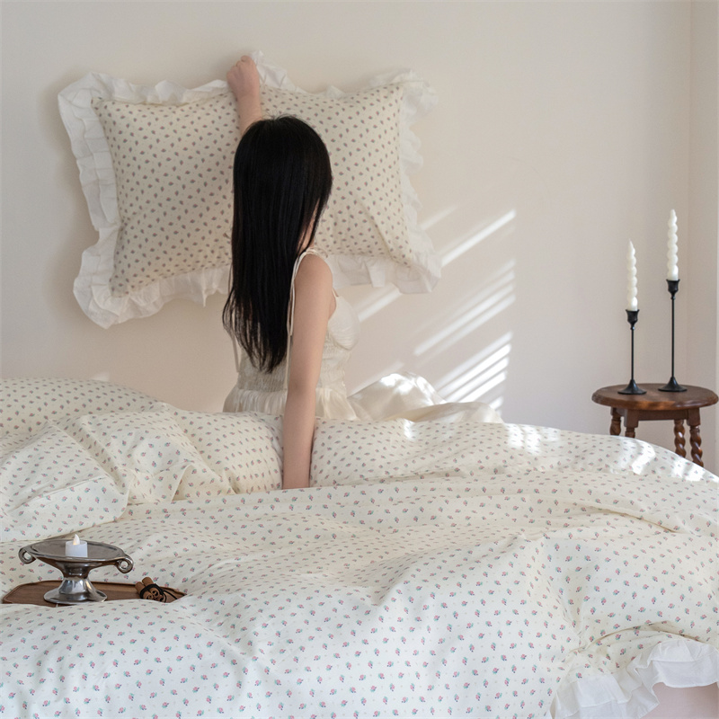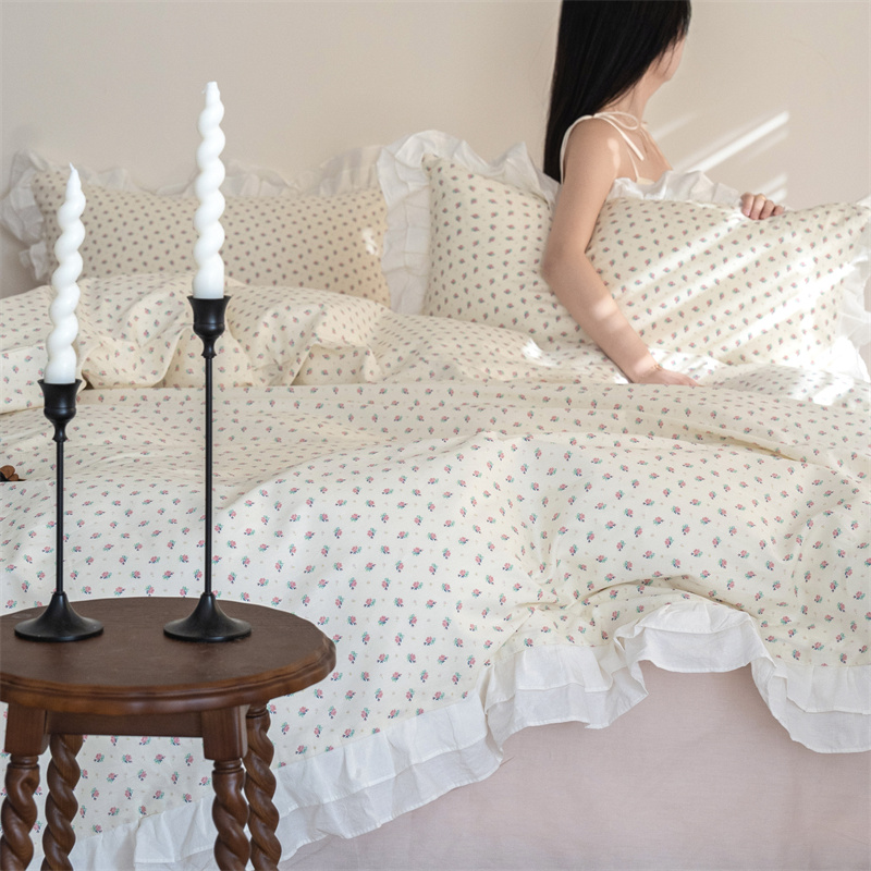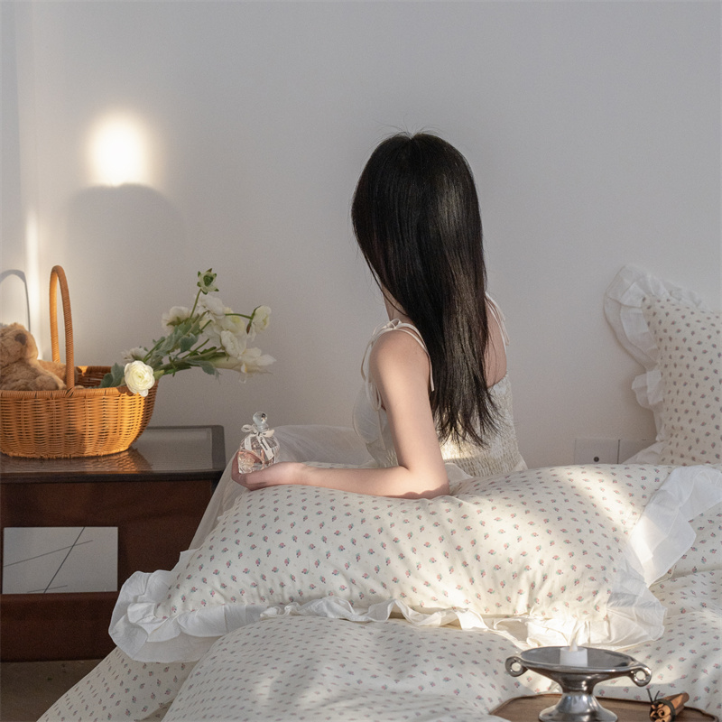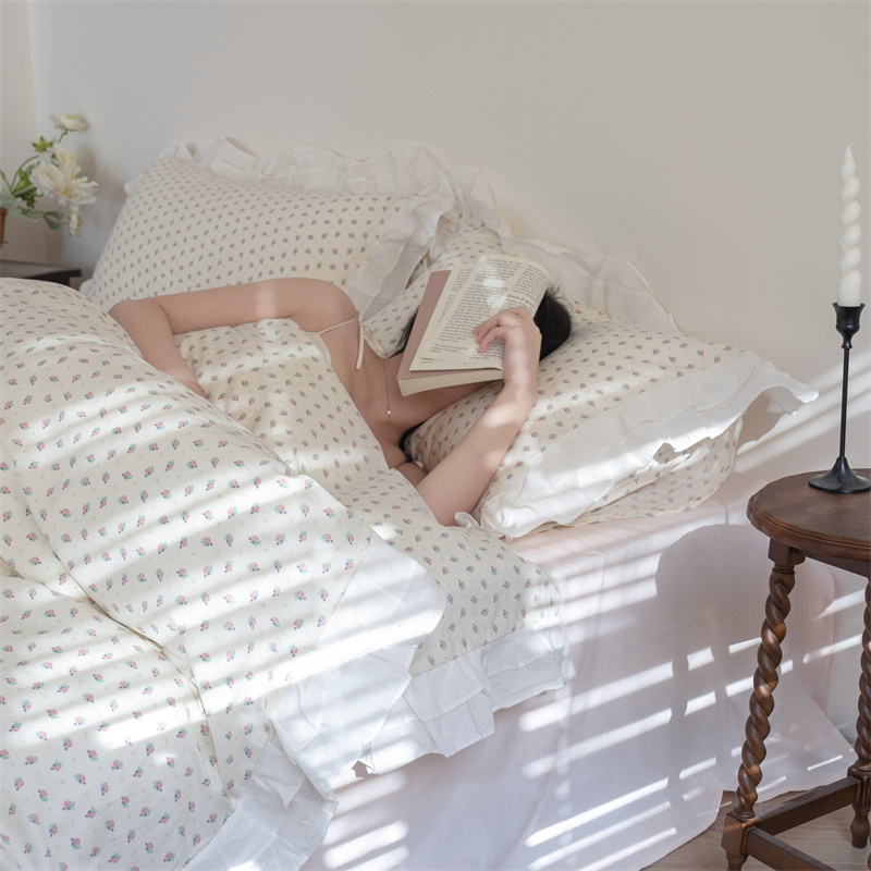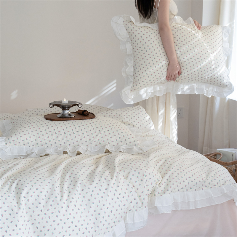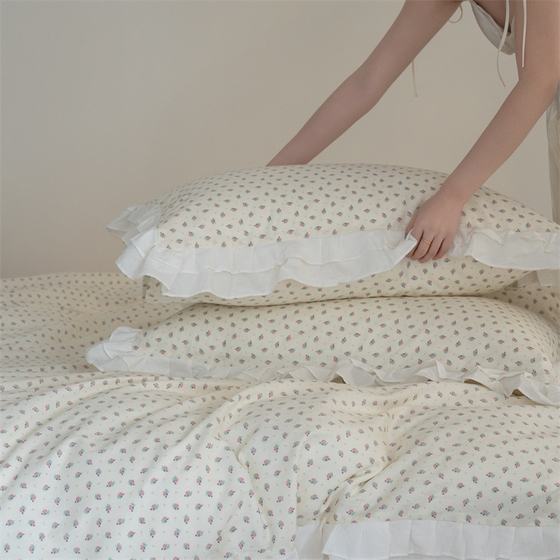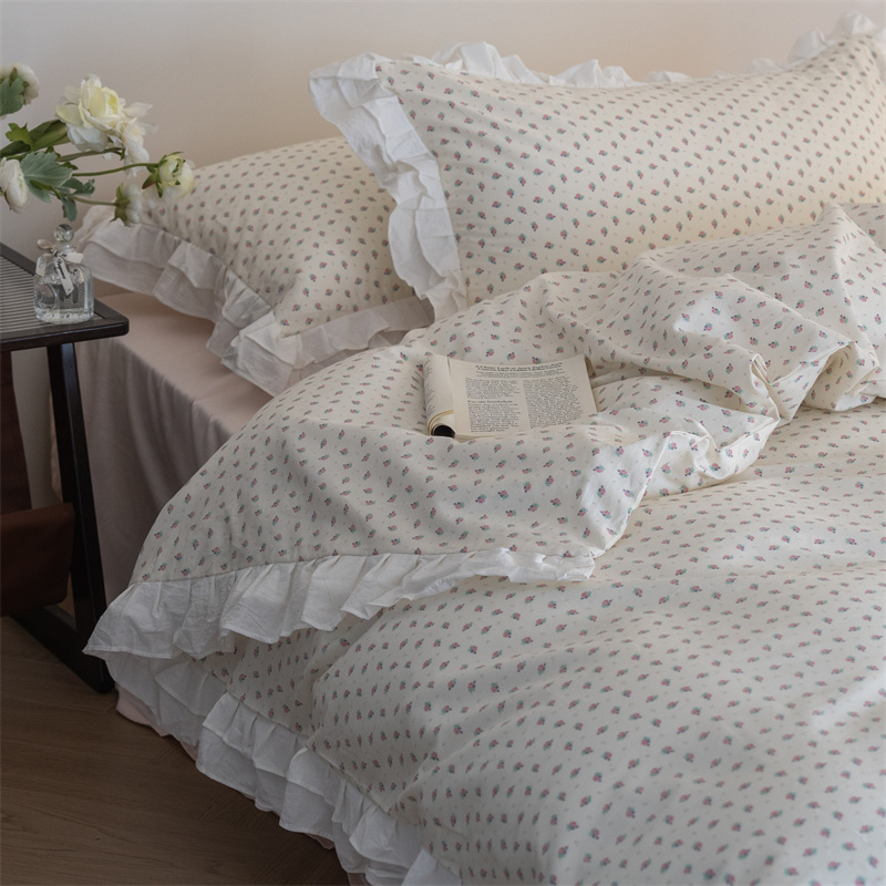 商品名称:尺素 2025年小碎花纯棉花边四件套全棉田园风荷叶边被套纯棉床单棉法式套件1.8纯色床笠套件 南乔桃粉(花边款)