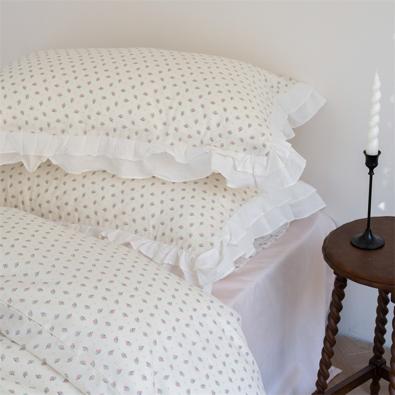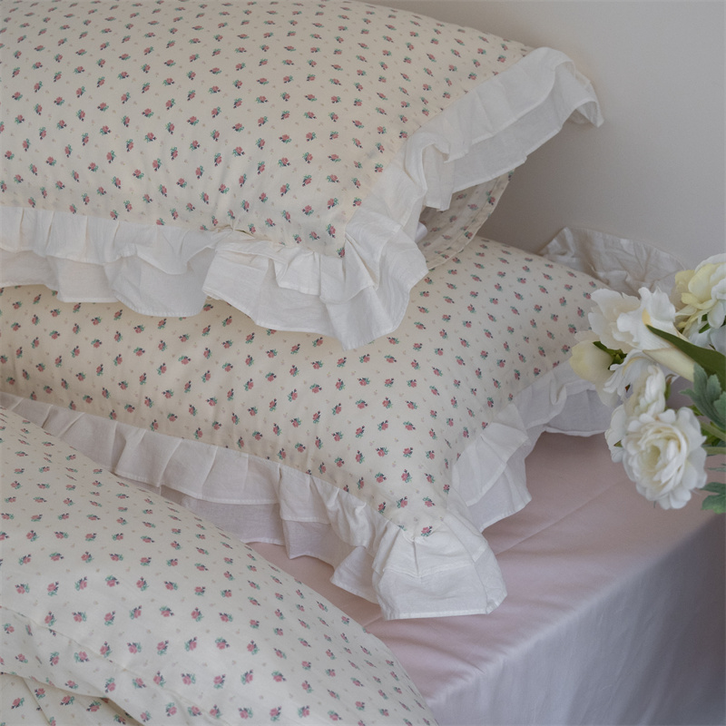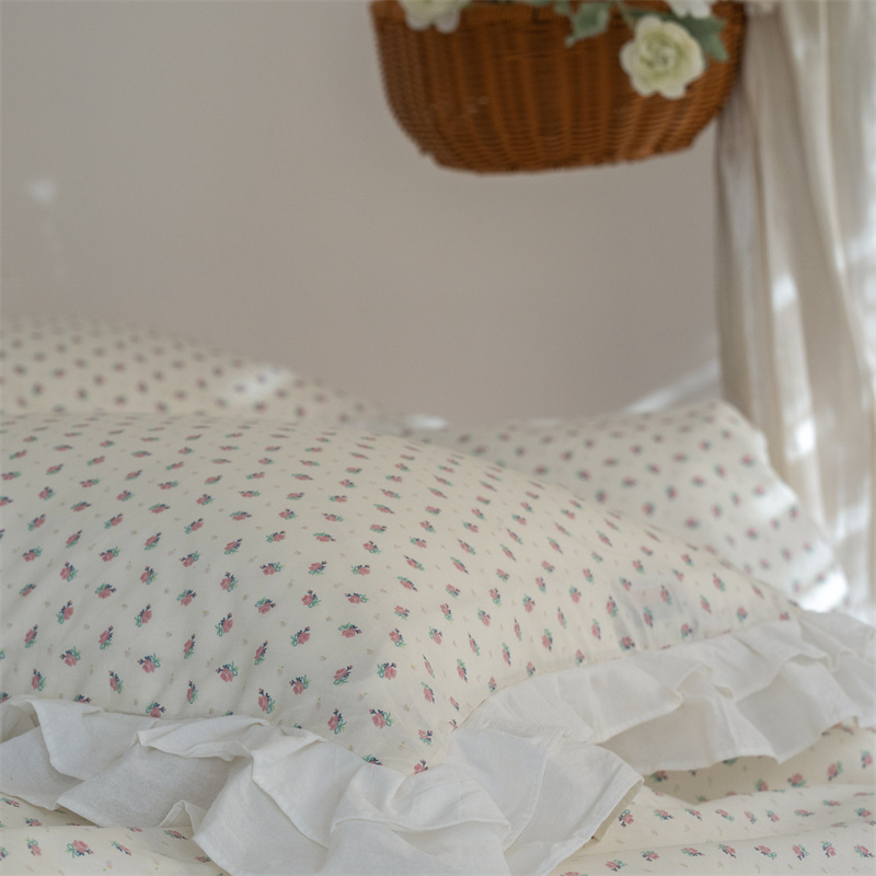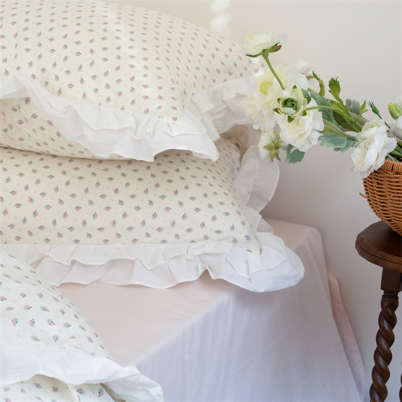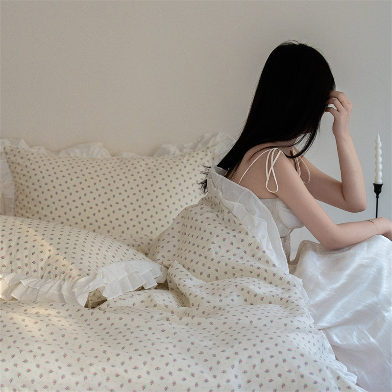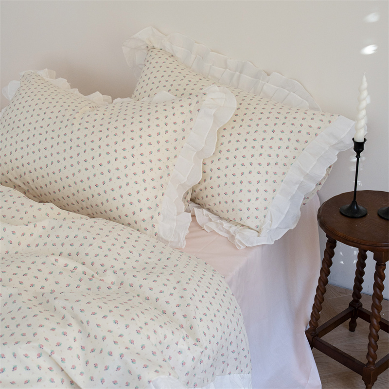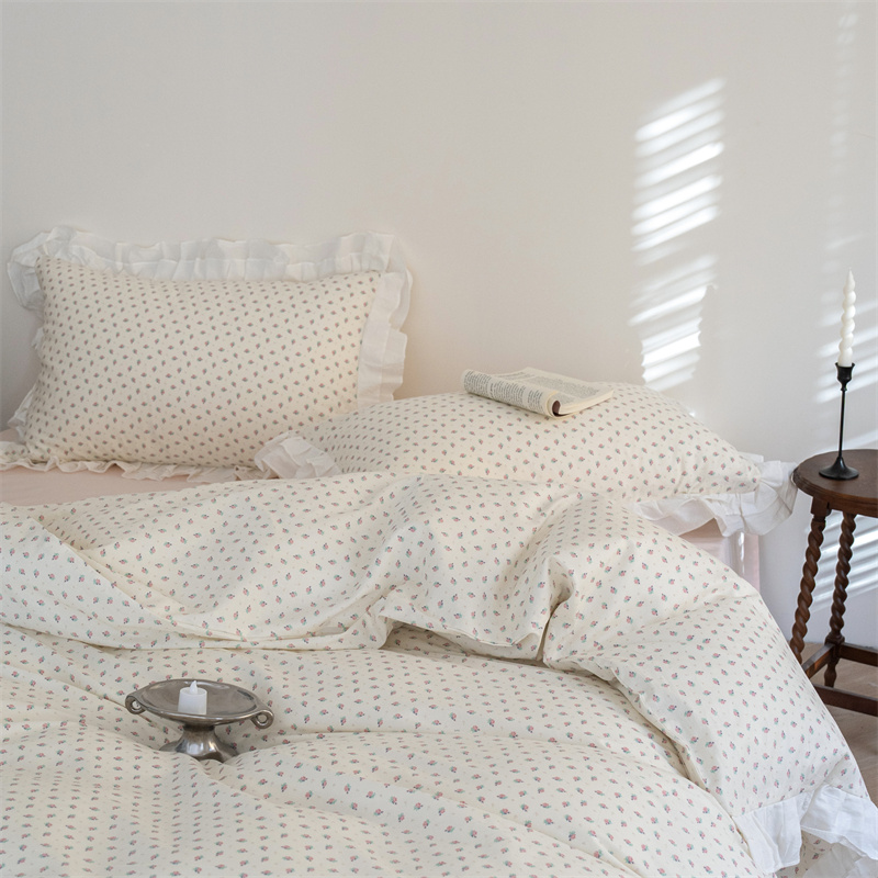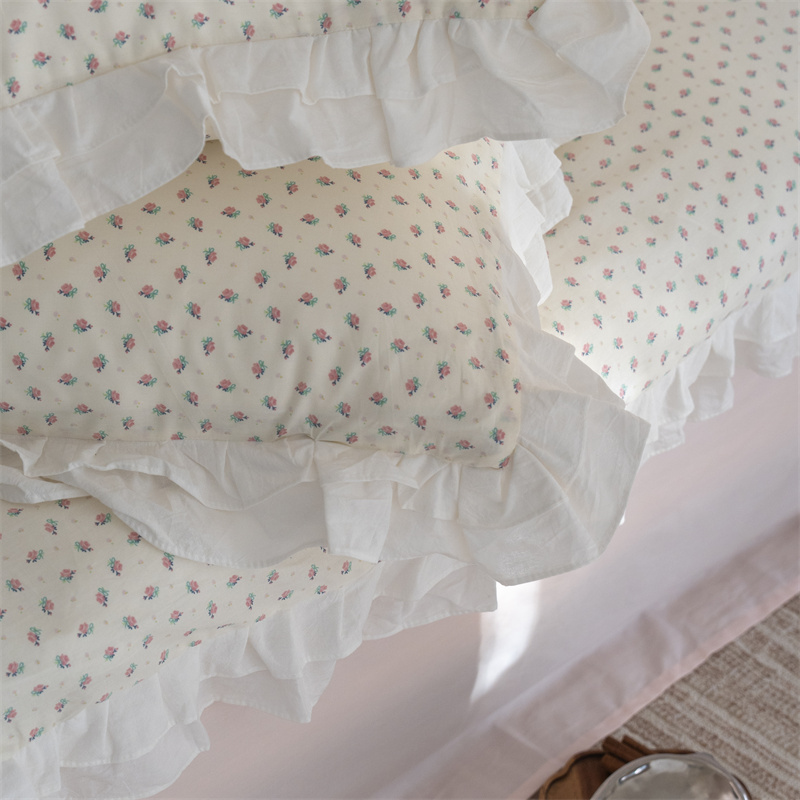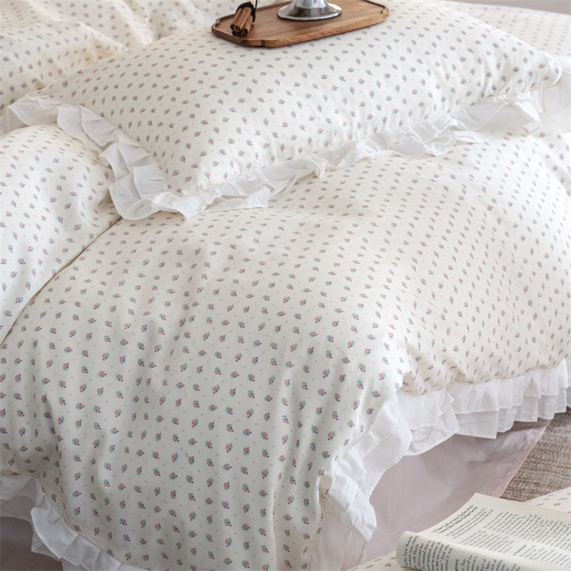 商品名称:尺素 2025年小碎花纯棉花边四件套全棉田园风荷叶边被套纯棉床单棉法式套件1.8纯色床笠套件 南乔桃粉(花边款)
