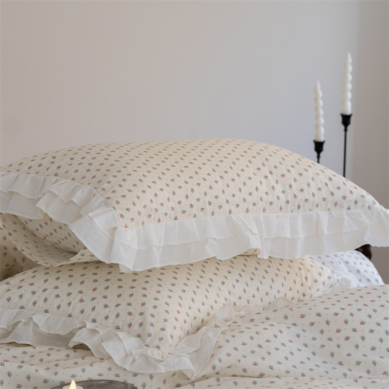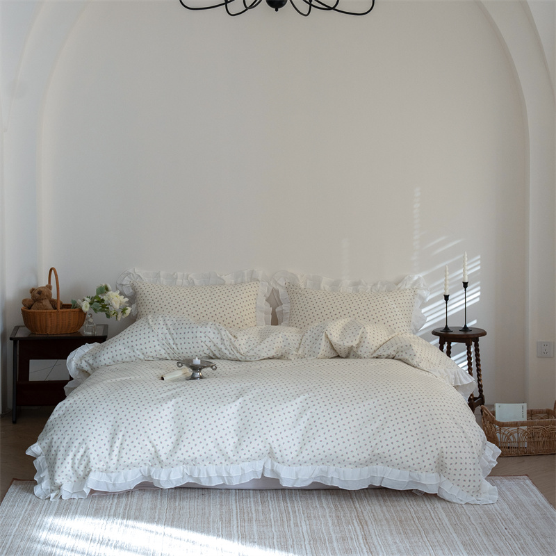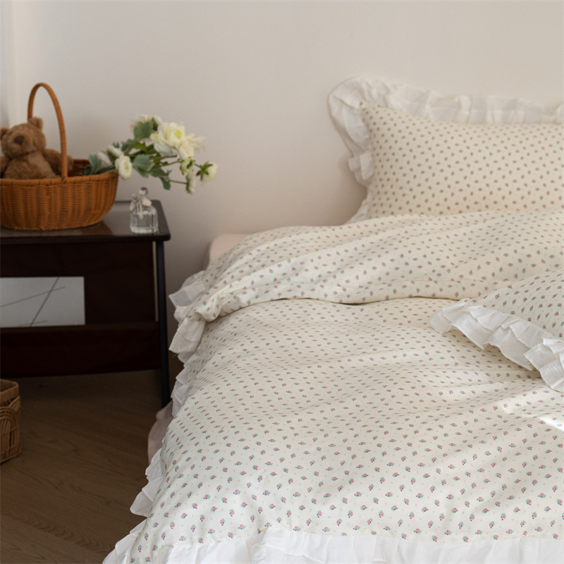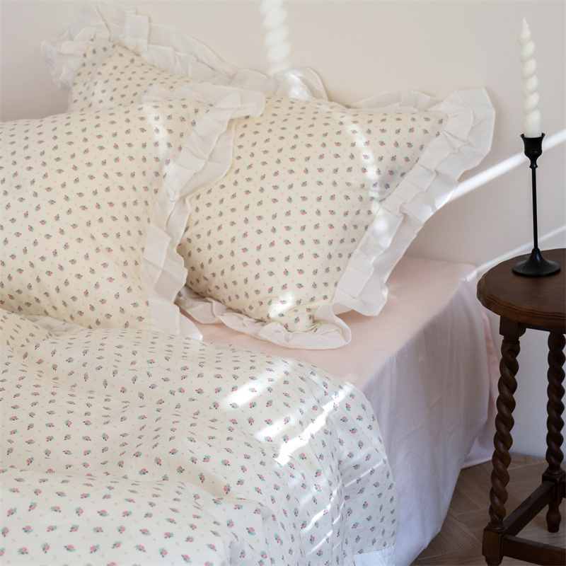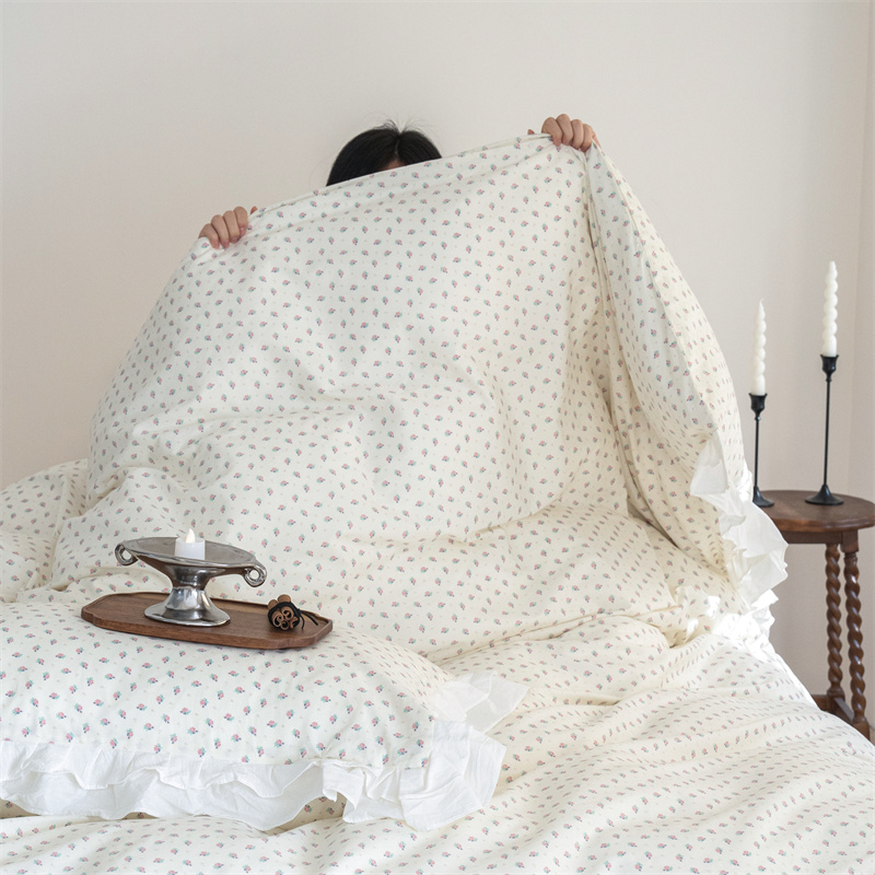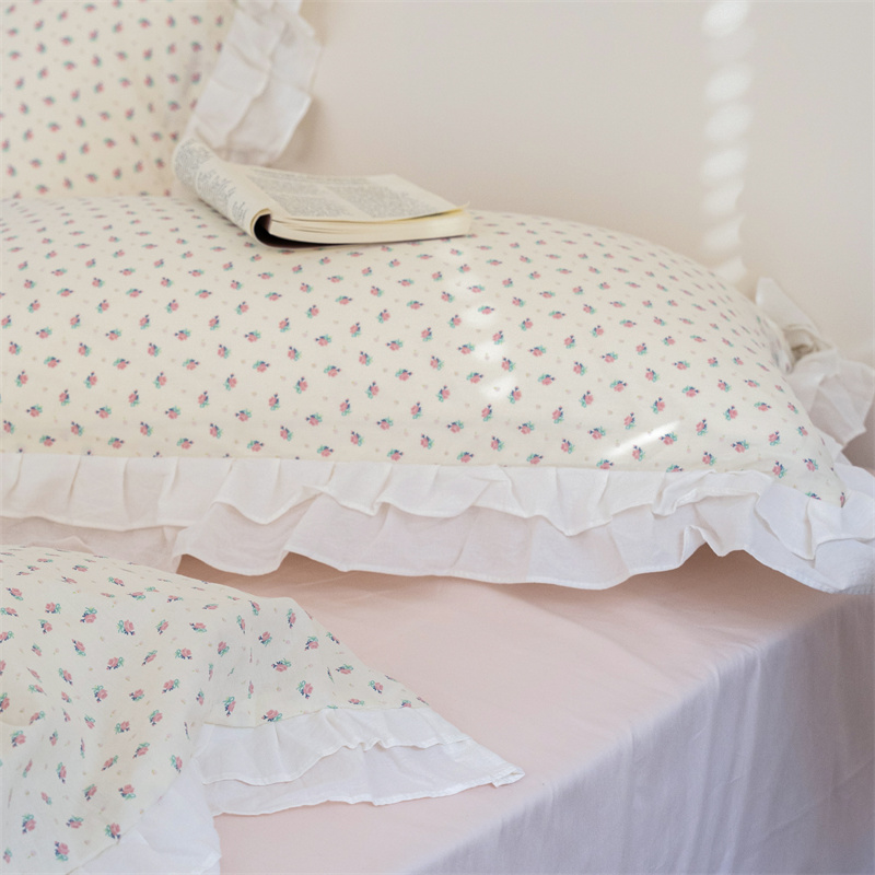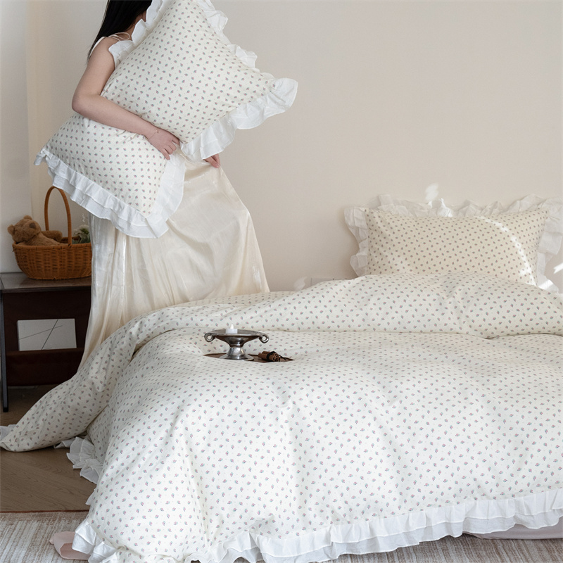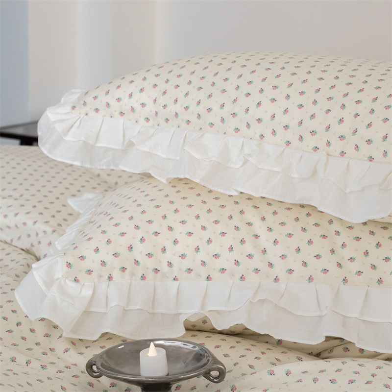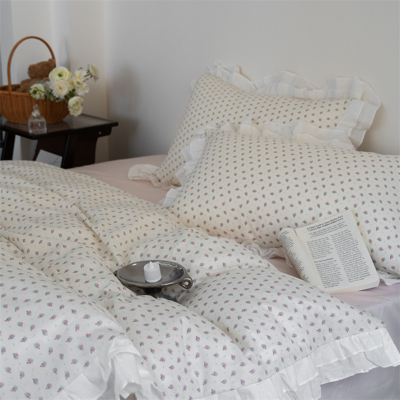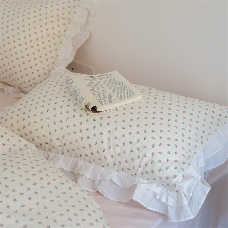 商品名称:尺素 2025年小碎花纯棉花边四件套全棉田园风荷叶边被套纯棉床单棉法式套件1.8纯色床笠套件 南乔桃粉(花边款)