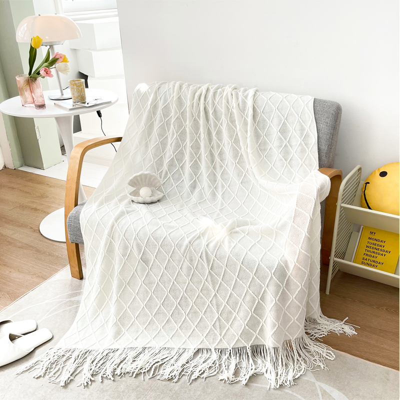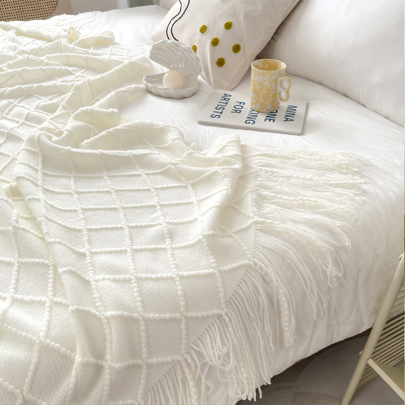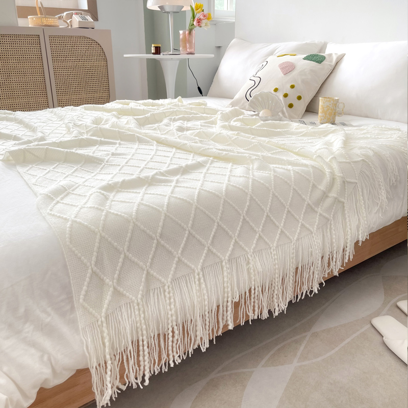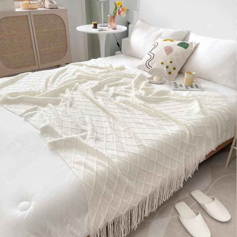 朴尔家纺-毛巾被 2025新款菱形格条纹流苏手工针织毯 乳白色