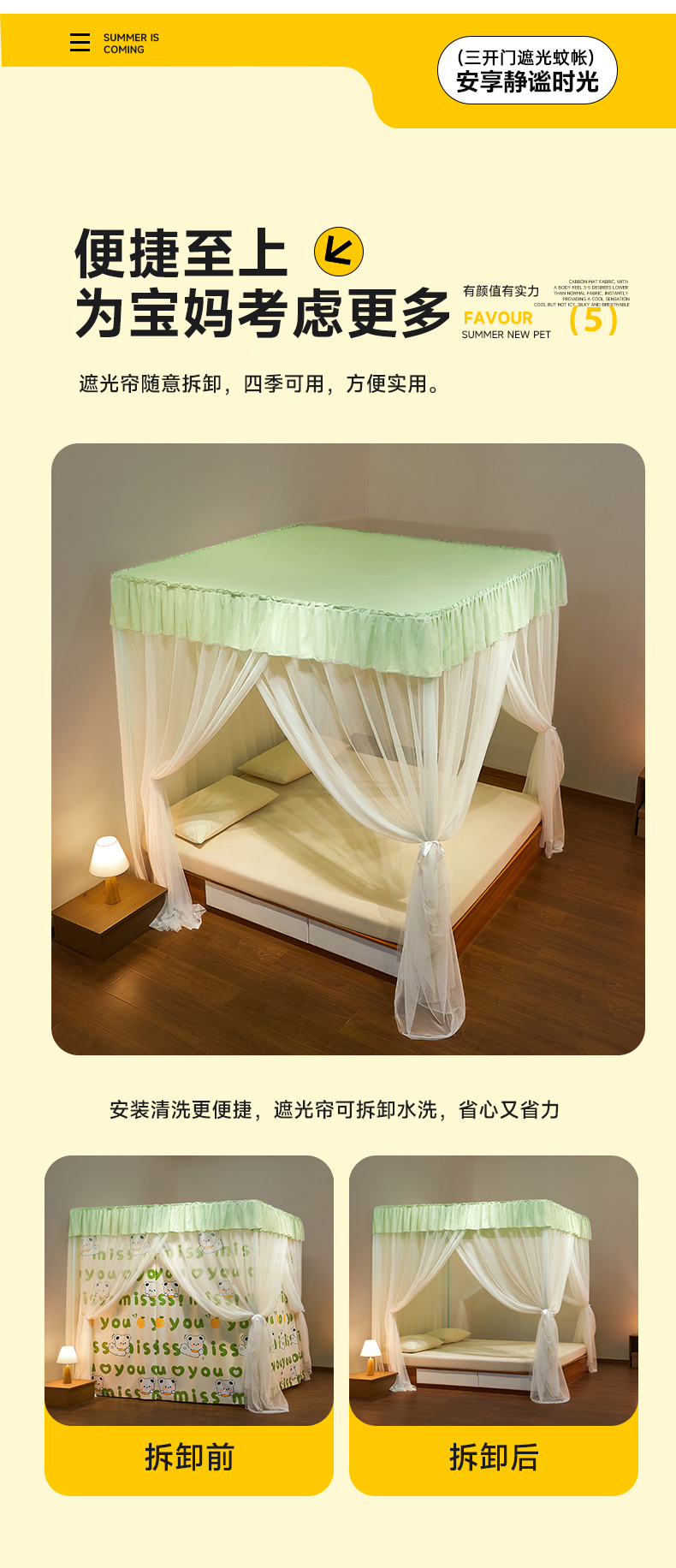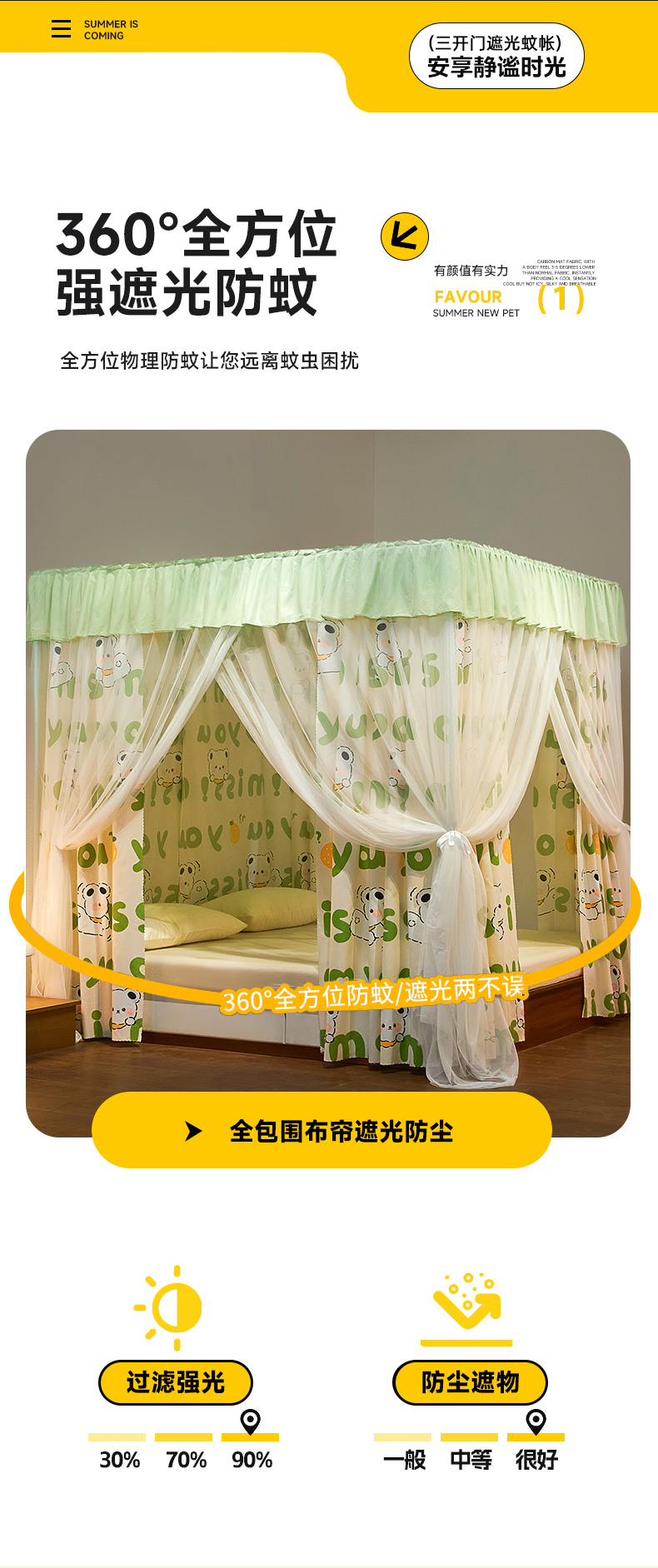 (总)飞轮海蚊帐 2023新款三开门落地遮光蚊帐-L-93,高级灰,芥末绿,奶油黄,香槟