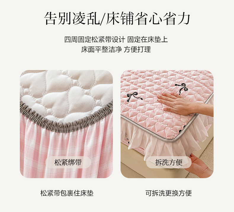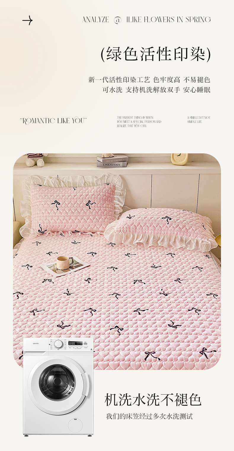 • 91家纺网 家纺一手货源 找家纺 眠势力 2025新款韩版花边床笠雪纺公主风ins夹棉四季款床罩保护套 粉格蝴蝶结