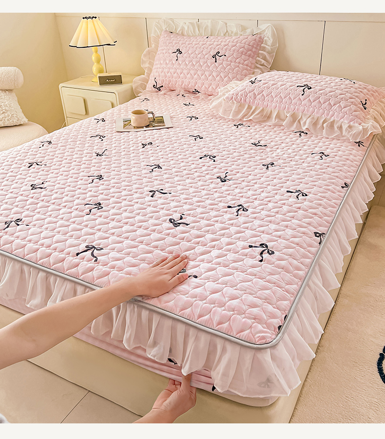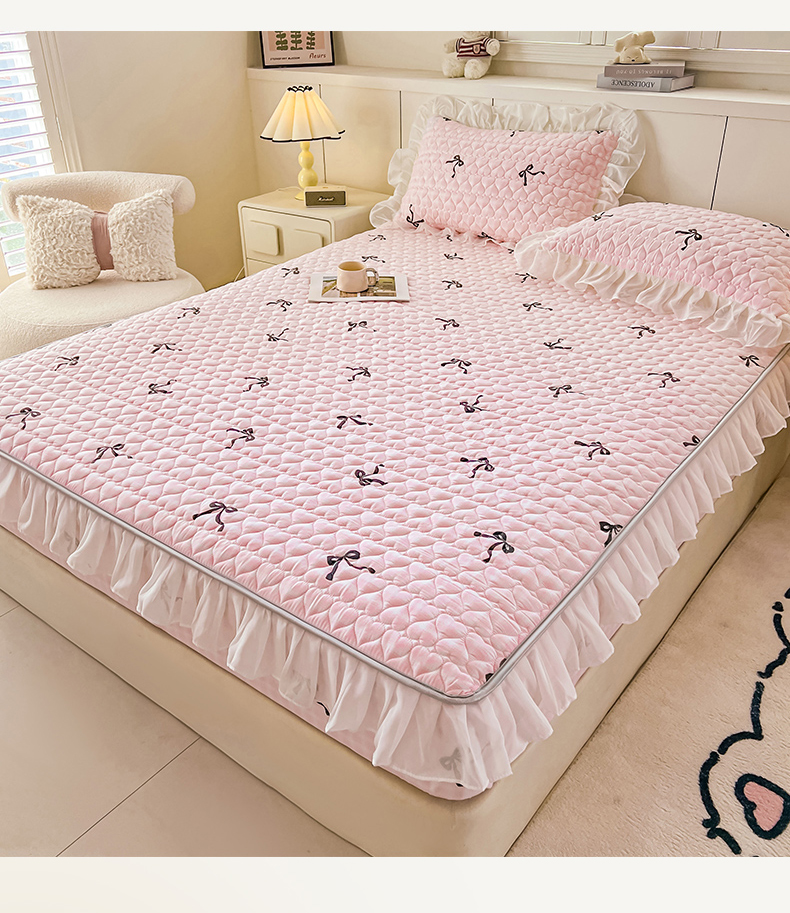 眠势力 2025新款韩版花边床笠雪纺公主风ins夹棉四季款床罩保护套 粉格蝴蝶结