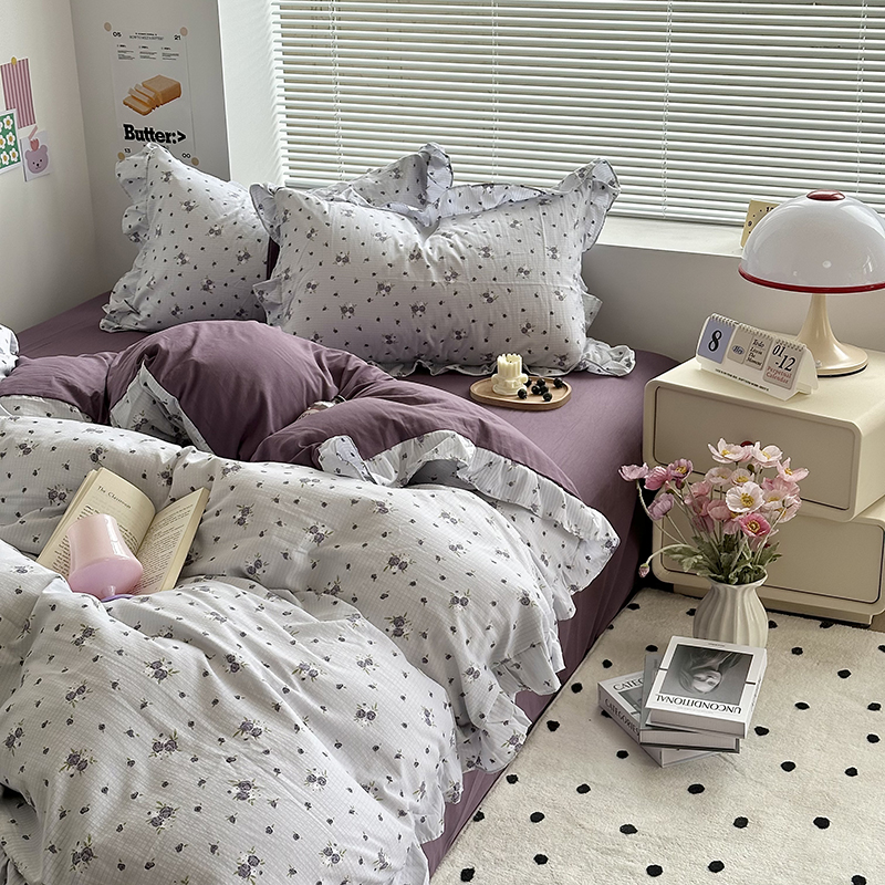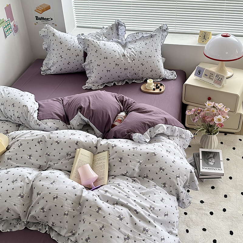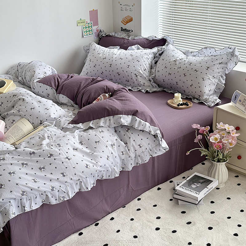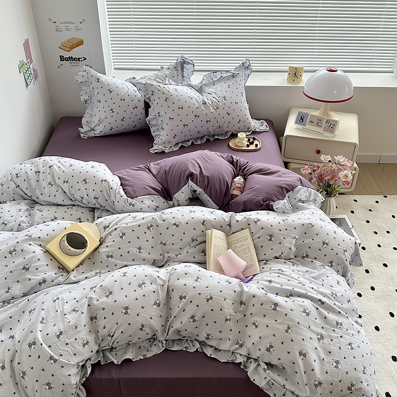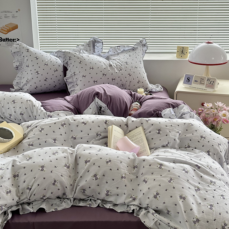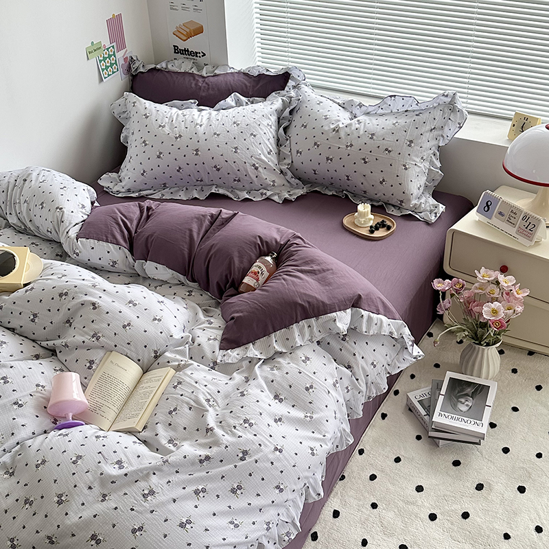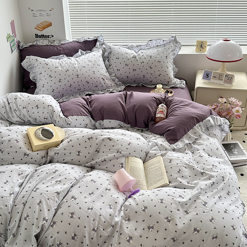 当前位置: 91家纺网 > 商品网购 > 床品套件 > 四件套 > 全棉普通四件套 > 希丞家居 2025新款花卉泡泡纱花边四件套 紫韵
