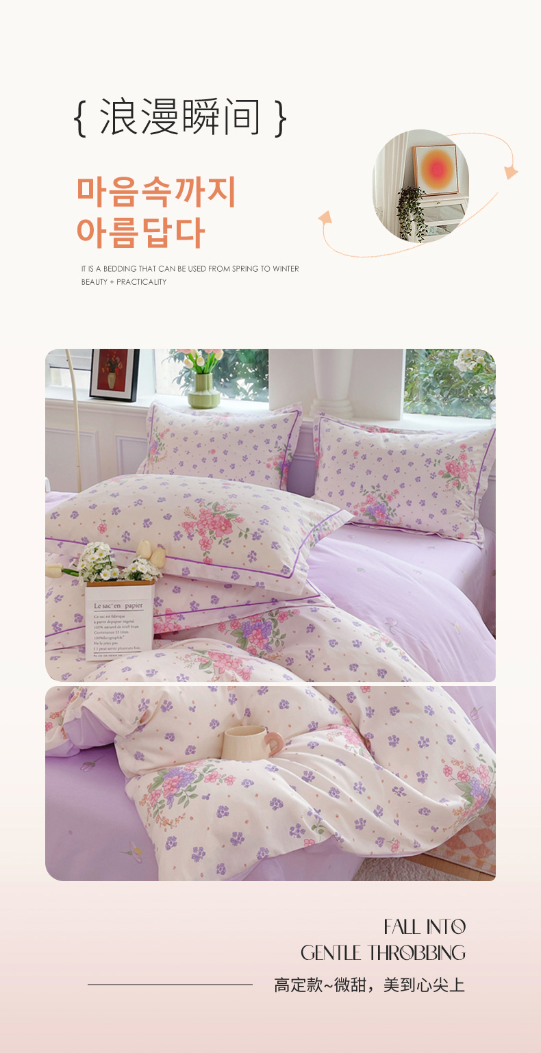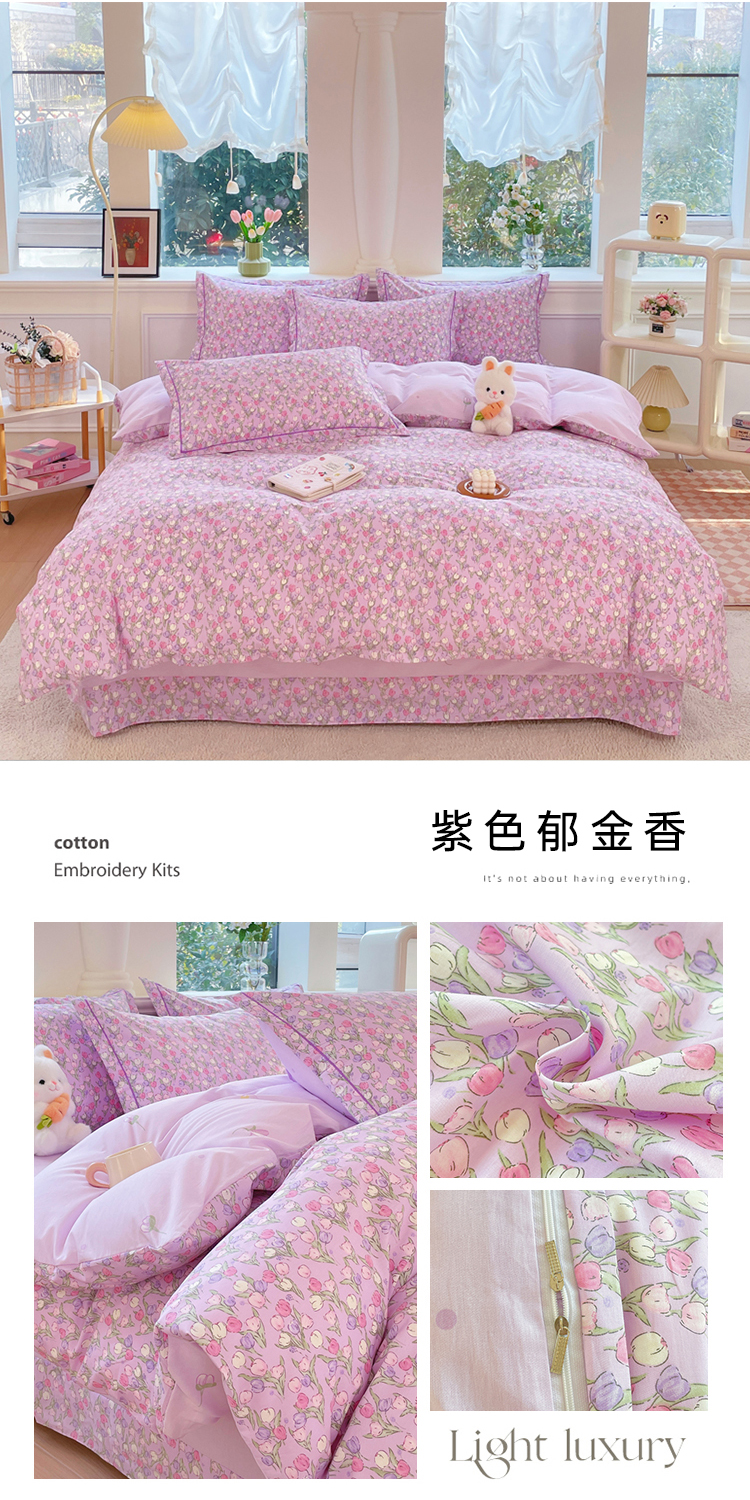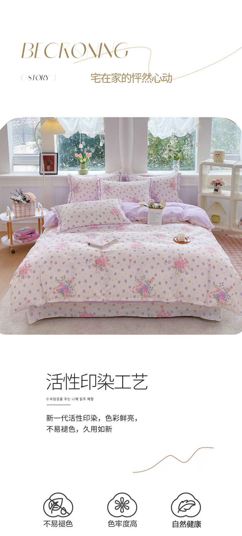 铭博家纺 新款直播爆款网红全棉四件套13070印花吊边一字绣纯棉被套工艺款 花语呢喃,花语呢喃