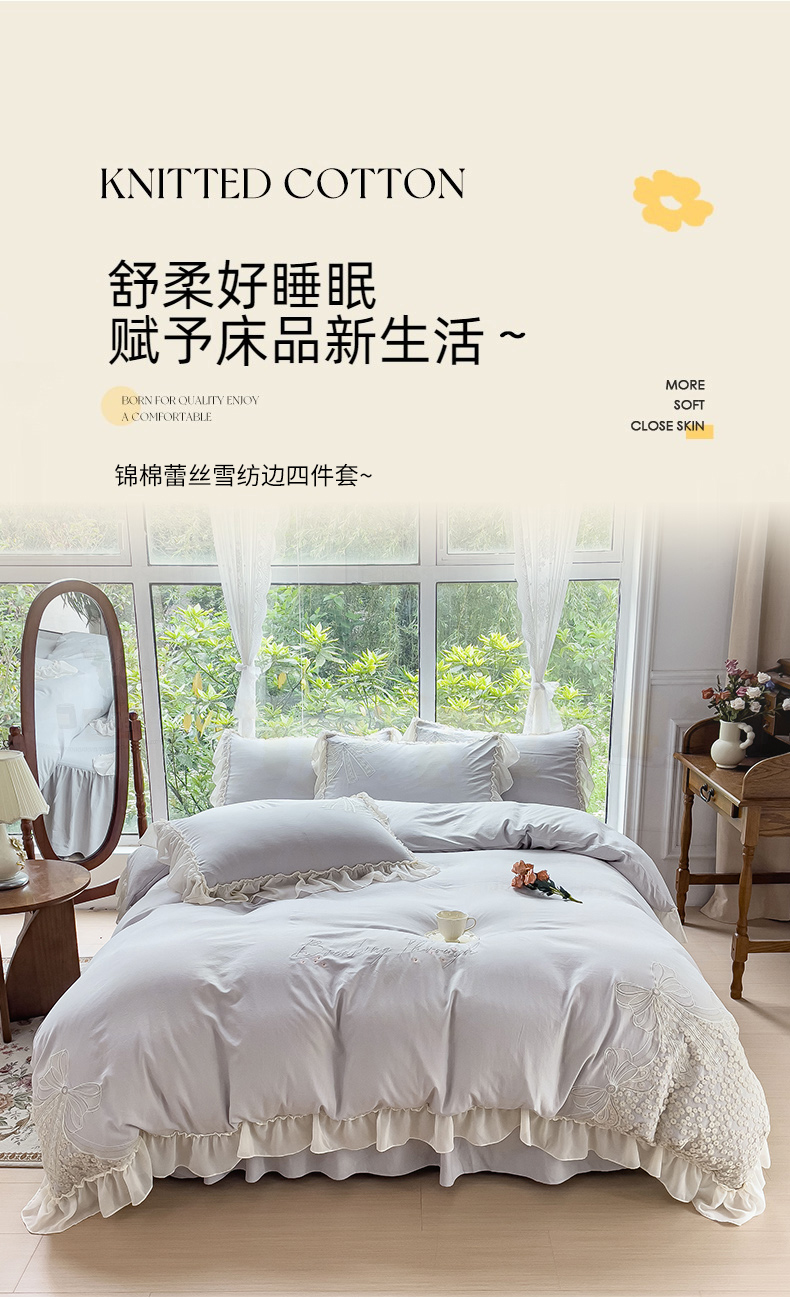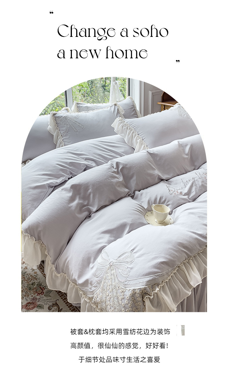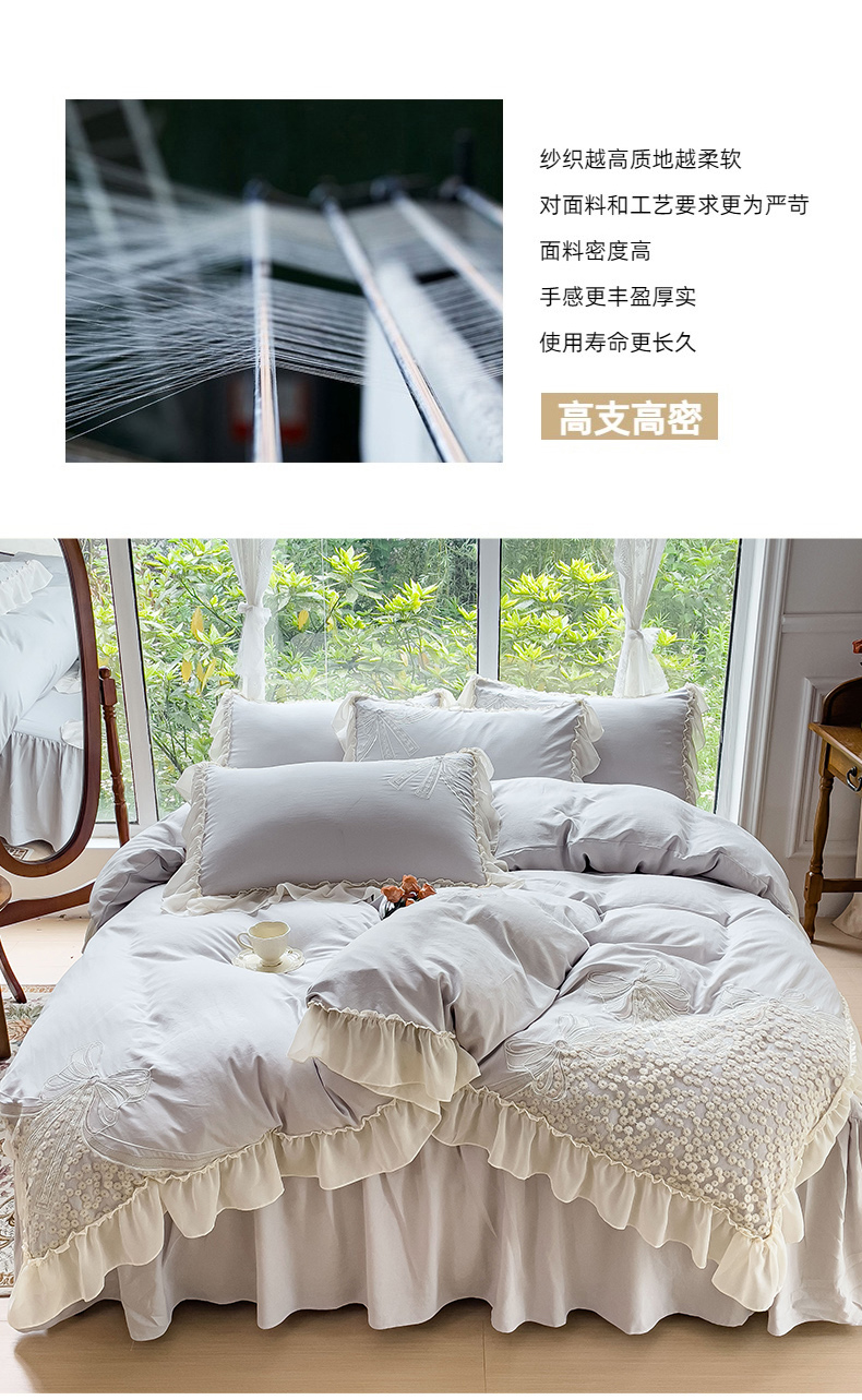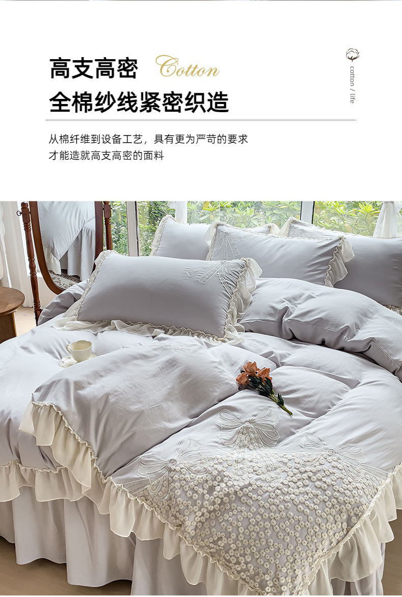商品名称:睡美人 2025韩版全锦棉刺绣公主风蕾丝床裙款四件套-蝶恋花 蝶恋花-香槟灰