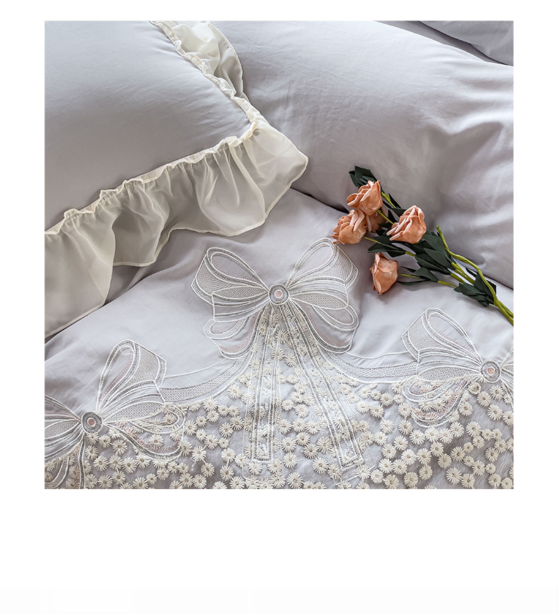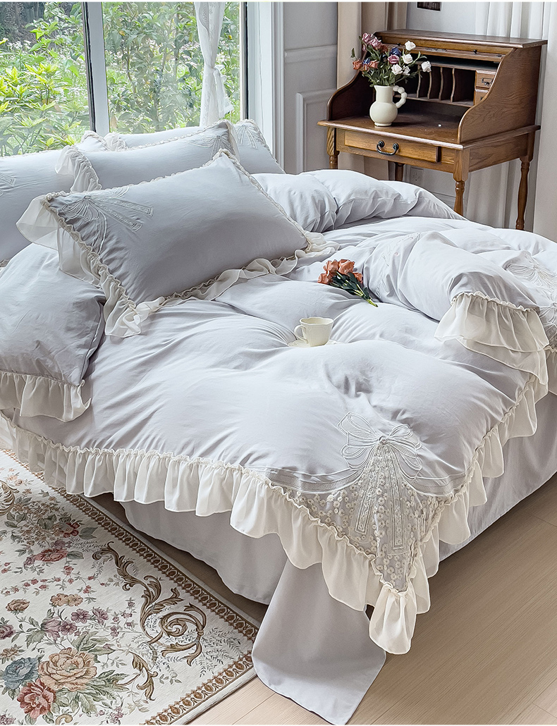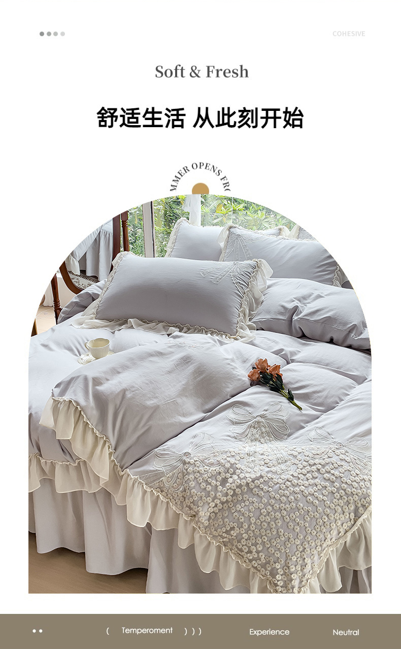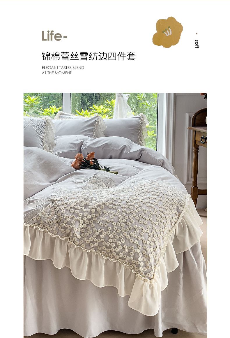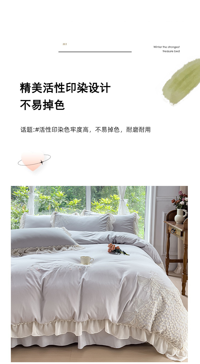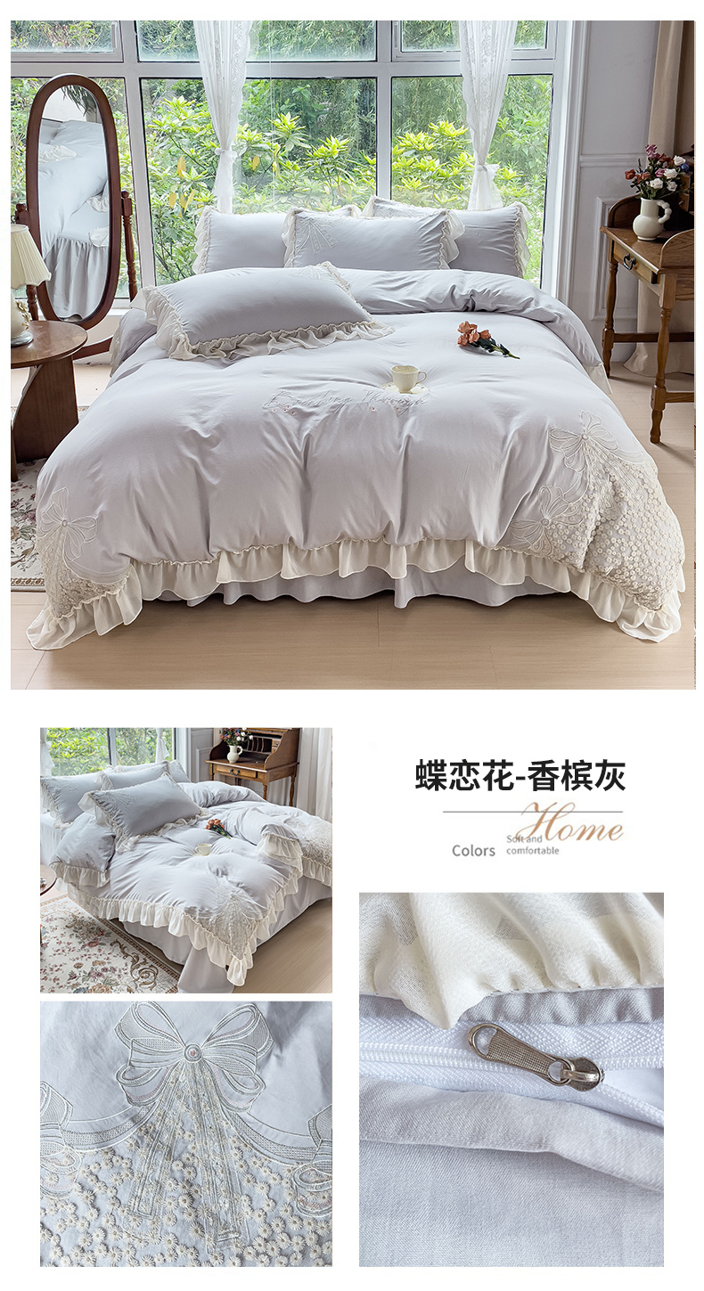 睡美人 2025韩版全锦棉刺绣公主风蕾丝床裙款四件套-蝶恋花 蝶恋花-香槟灰