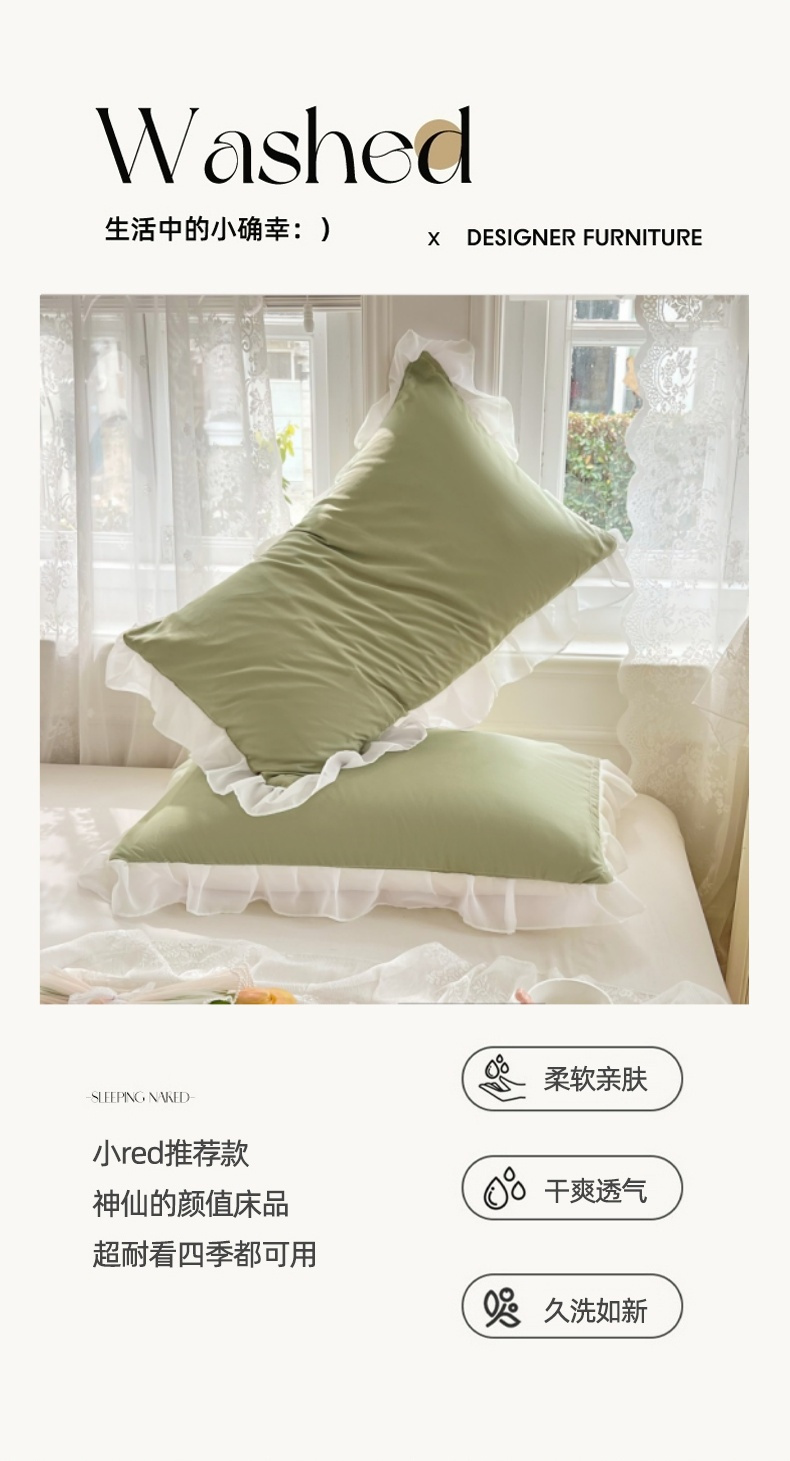 商品名称:圣比熊 2025新款针织棉双层纱花边枕头套双人枕套枕芯套宿舍单人枕头内胆套 花边款-豆绿