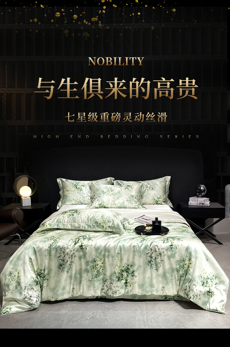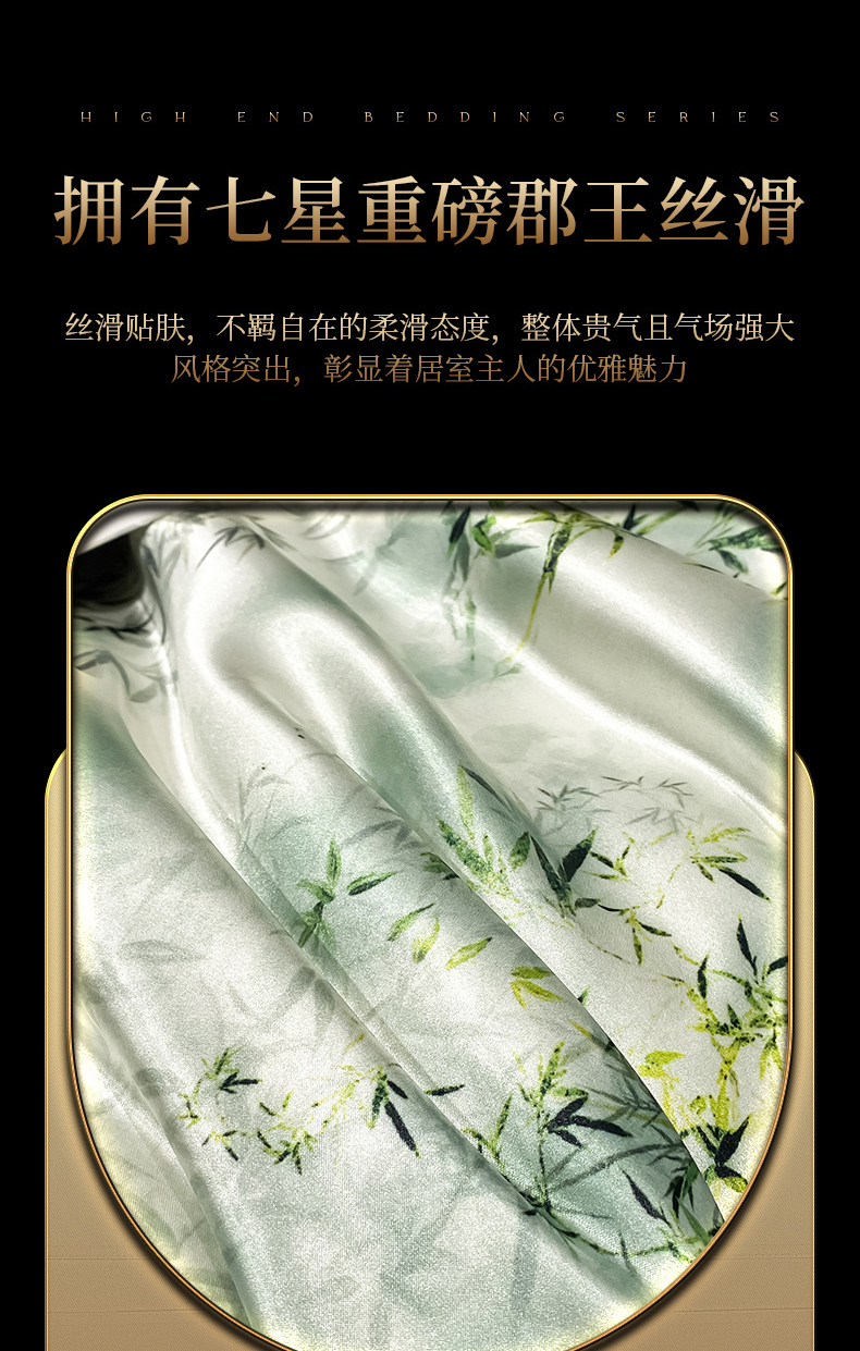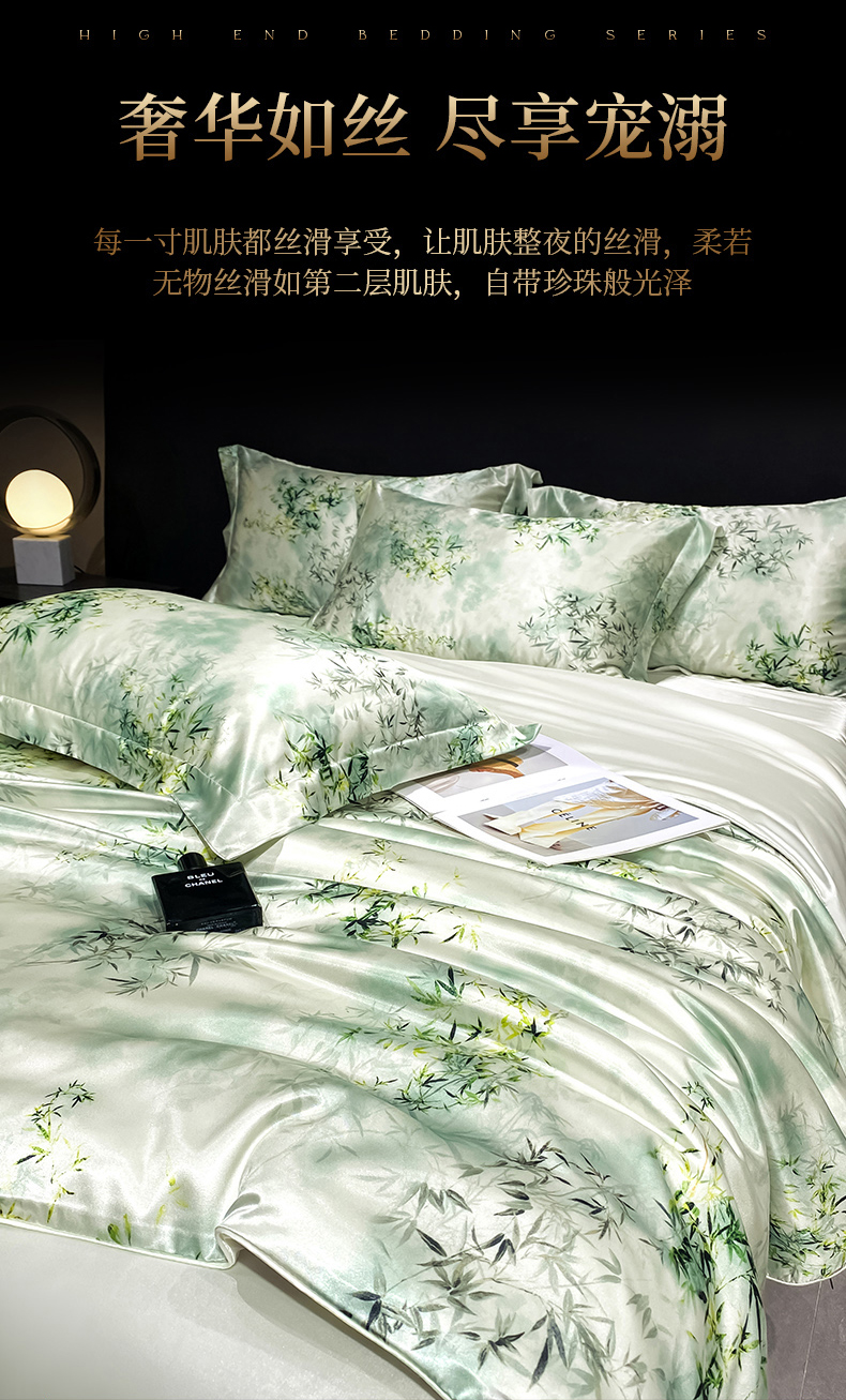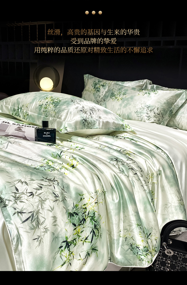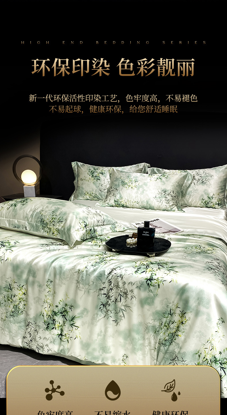 商品名称:黄鹂鸟 2025新款高端轻奢丝滑裸睡丝绸数码印花水洗真丝天丝四件套系列 -风格四 东方竹韵